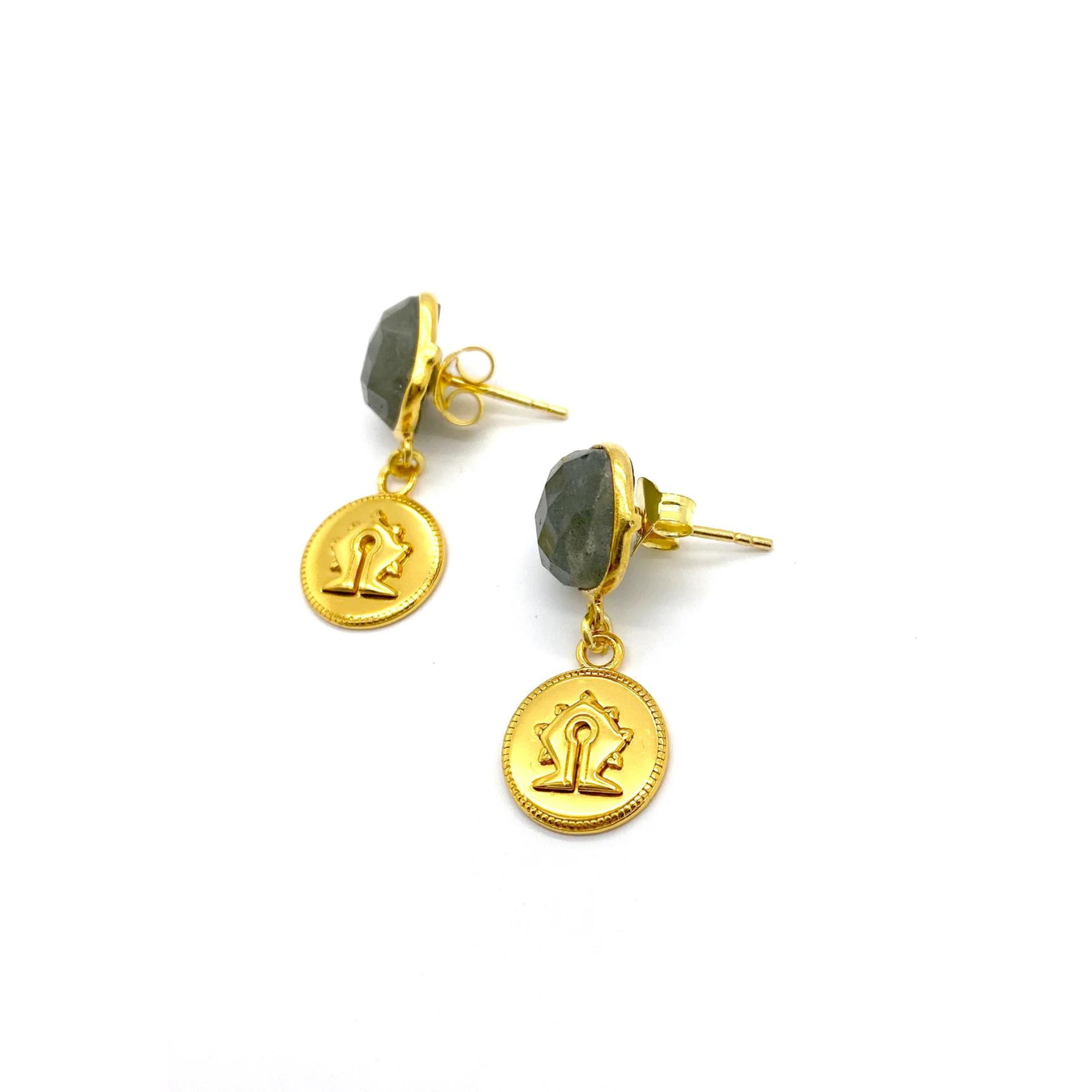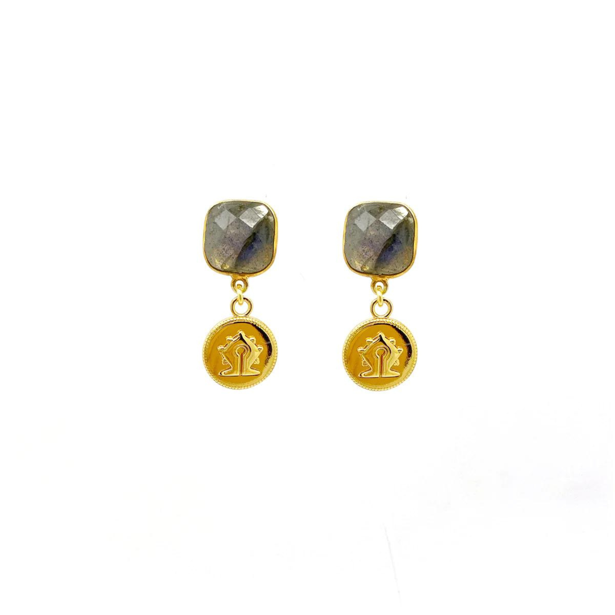 A pair of elegant drop earrings with 10mm faceted Labradorite stones and a 18ct gold plated silver tiny Mamuli coin. Coin charm has a diameter of 12mm.