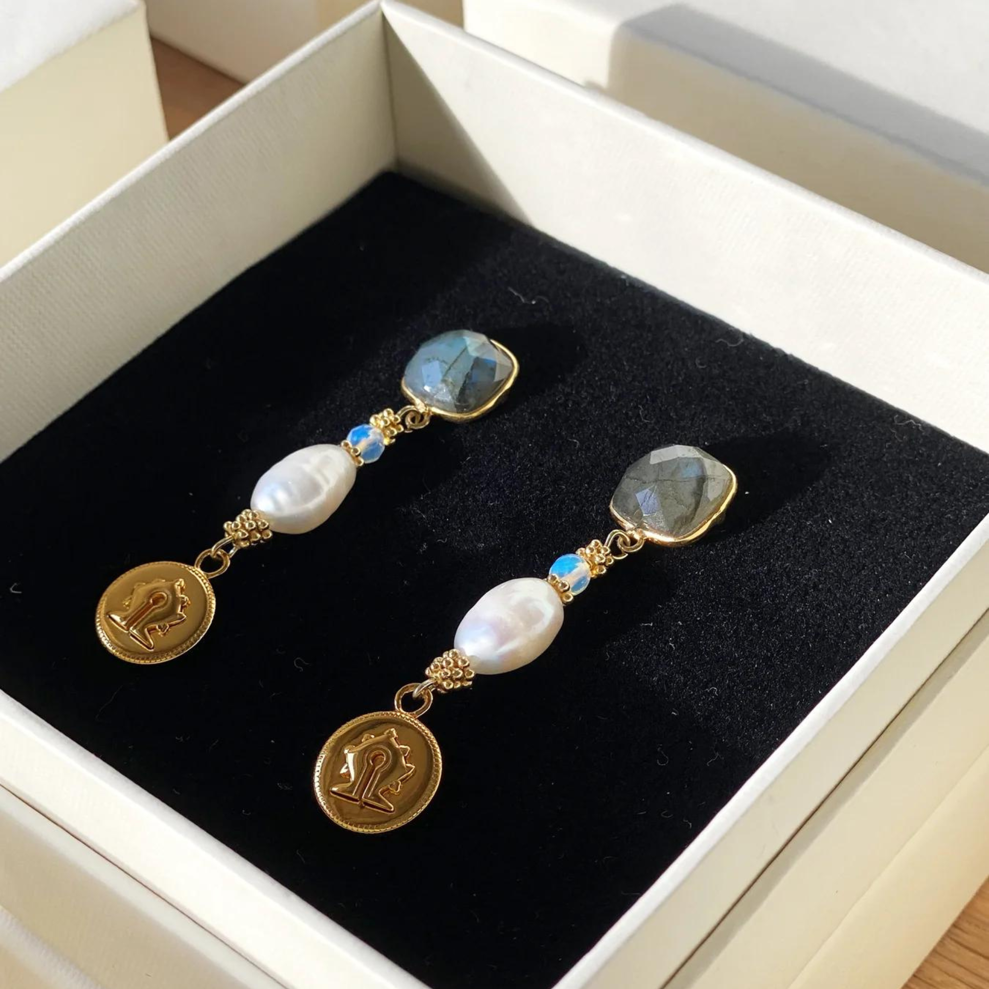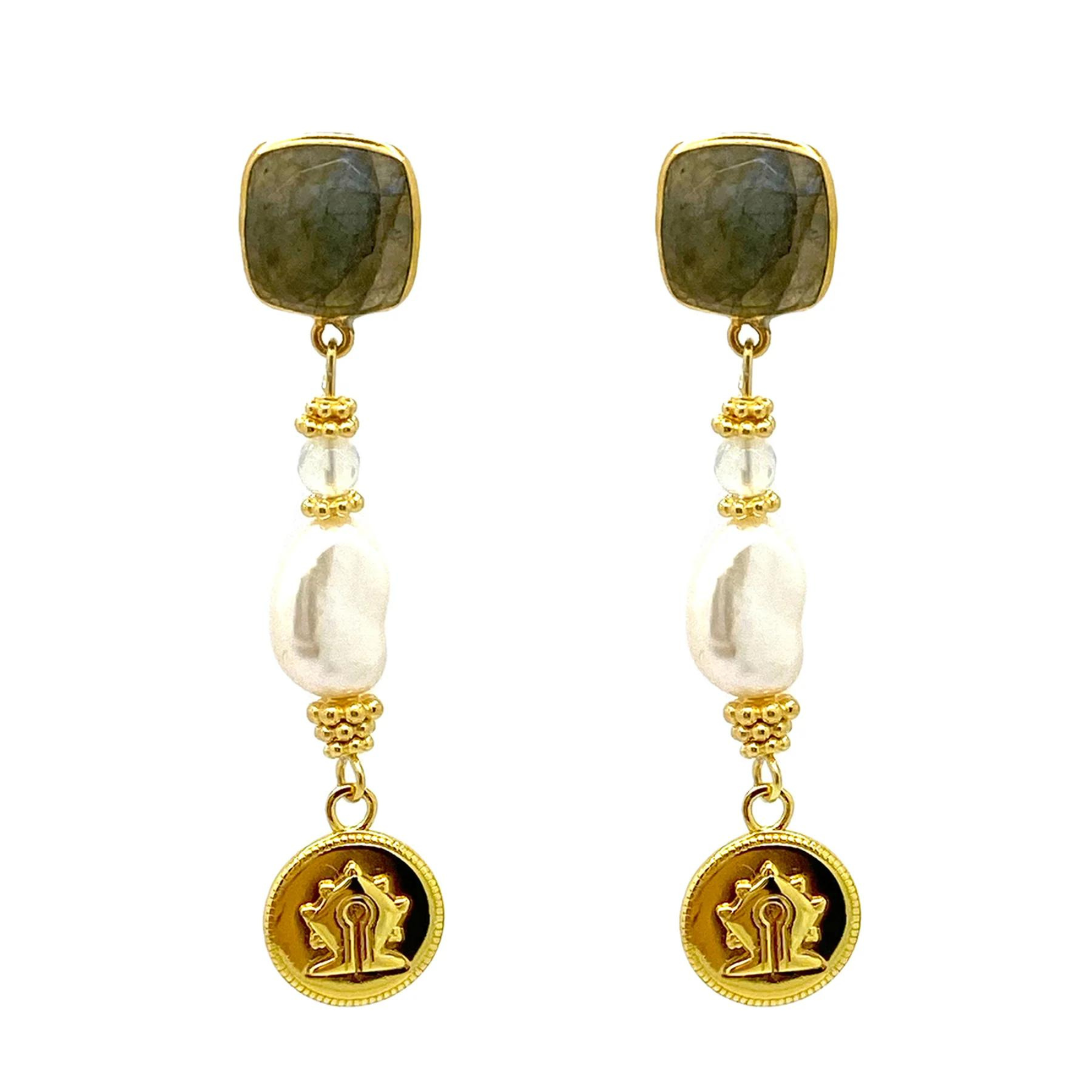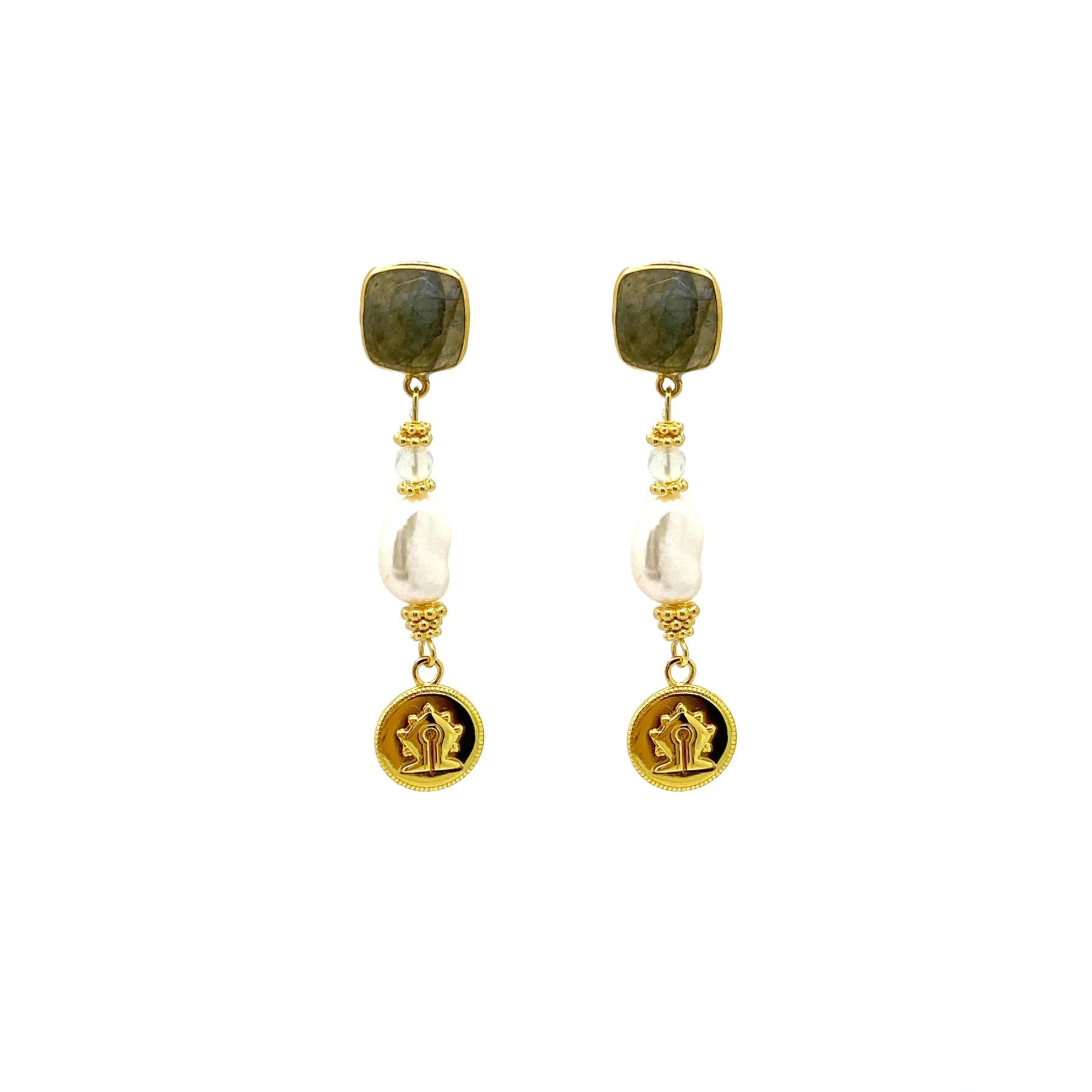 A pair of majestic drop earrings with 10mm faceted Labradorite stones, an Opal bead, a Freshwater Pearl and a 18ct gold plated silver Mamuli coin. Coin charm has a diameter of 12mm. These earrings are assembled with care in ArteGia Atelier in the Netherlands.