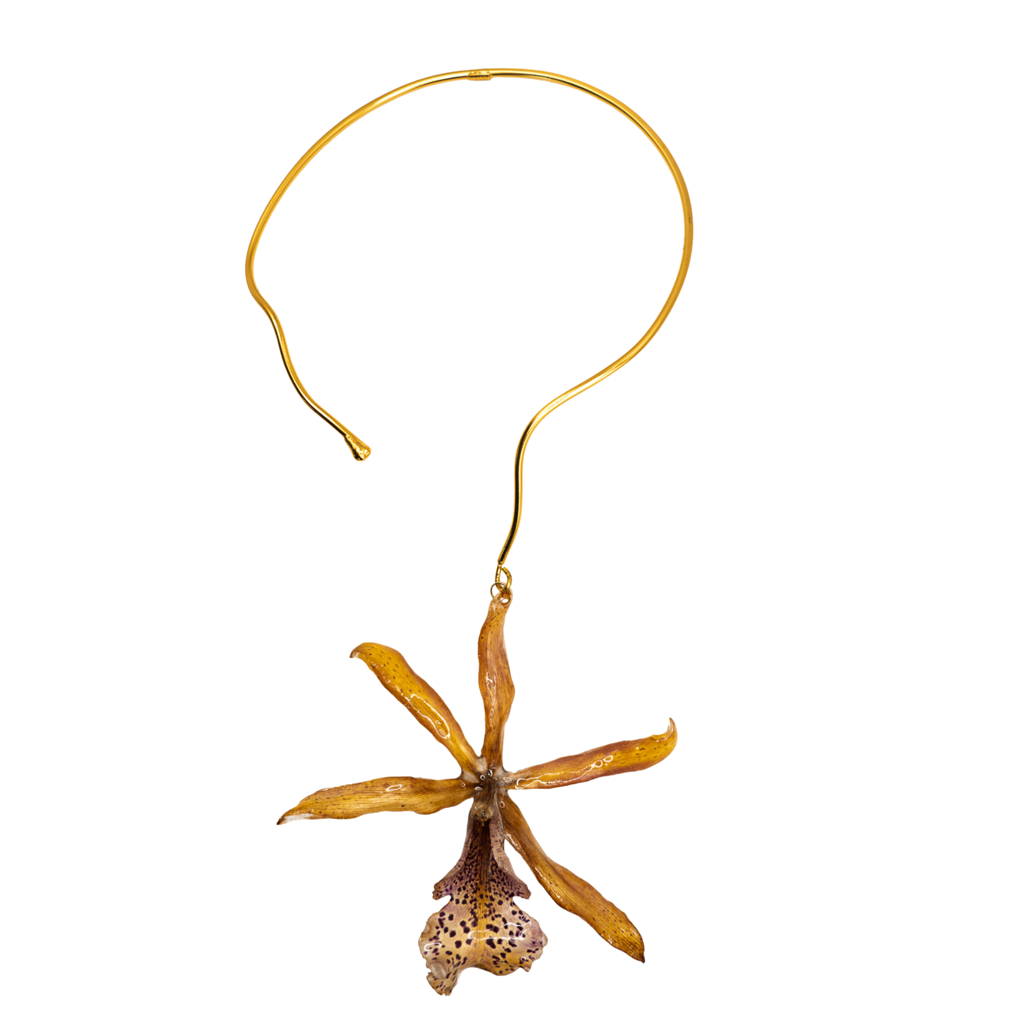 Brass Necklace choke with preserved orchids. Available in various colors and flower sizes.