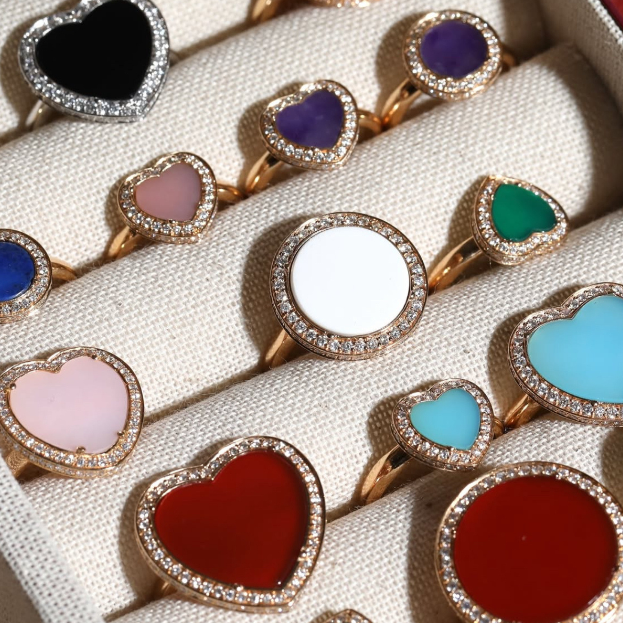 The Amore collection is a sincere tribute to love, it embodies romance through its iconic heart shaped design. Each ring is crafted to celebrate love in its purest form. The Amore ring is set with natural diamonds and hand selected gemstones chosen for their spiritual beliefs.