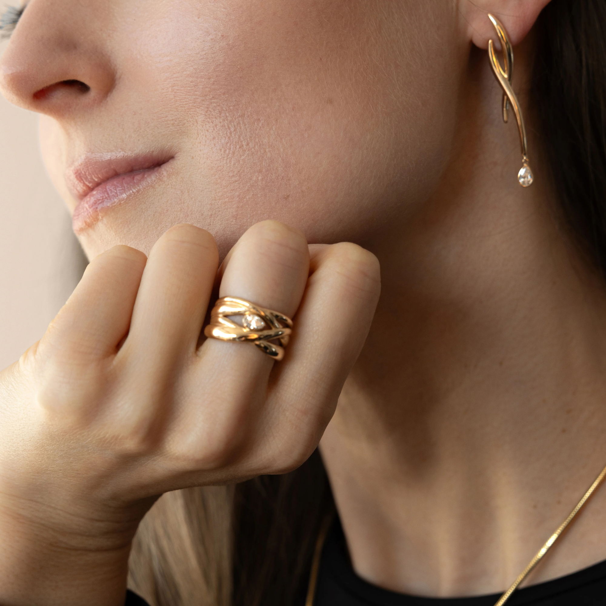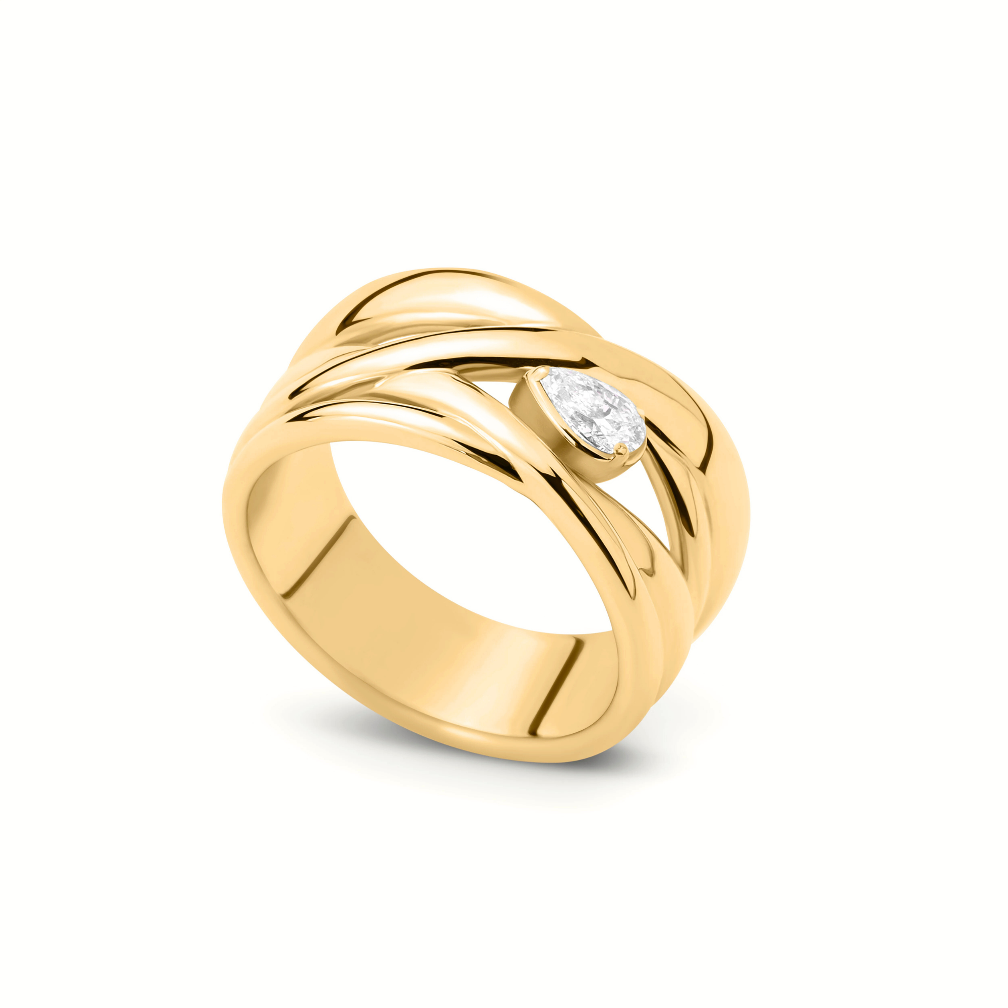 Imagine liquid gold, expertly sculpted into elegant waves that embrace a dazzling teardrop diamond. This captivating ring features a unique design where lustrous gold bands intertwine, creating a harmonious and flowing form that beautifully showcases the brilliant gem at its heart. It's a statement piece that whispers tales of timeless elegance and sophistication.