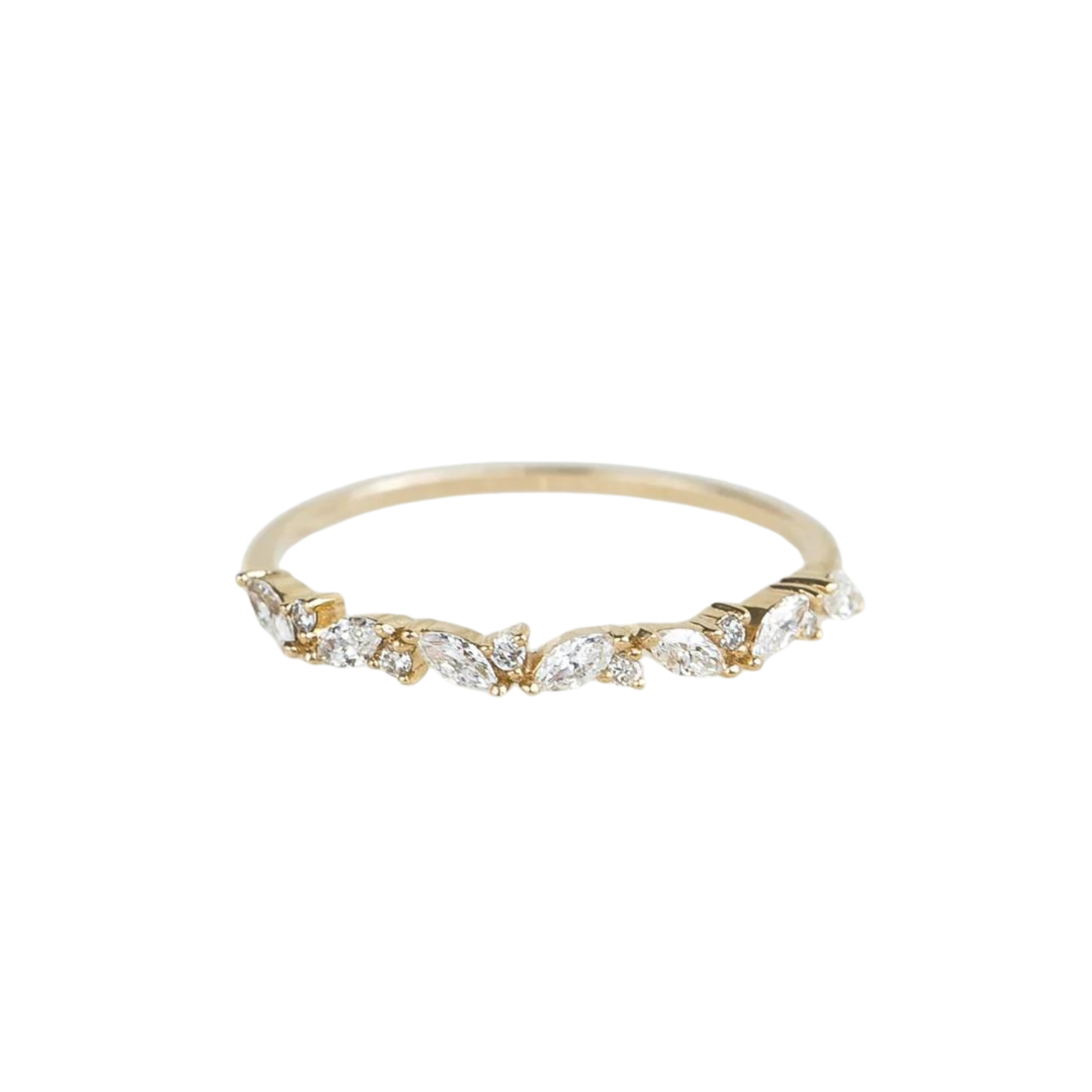 A gorgeous diamond ring showcasing sparkly marquise and round diamonds arranged in a laurel-inspired pattern. Crafted in 14k yellow gold, this ring is both elegant and romantic!