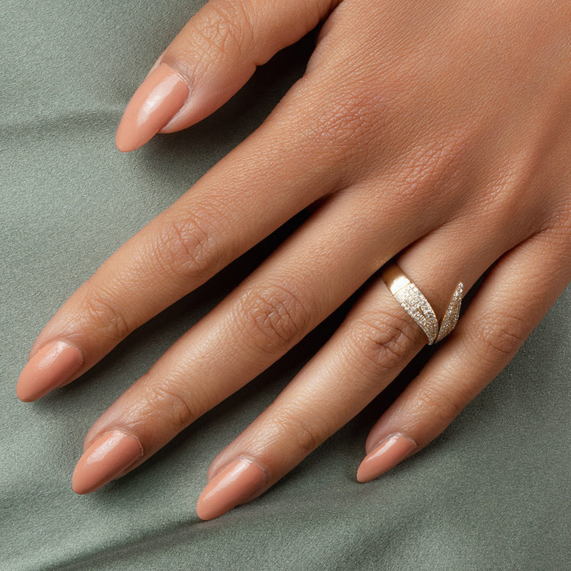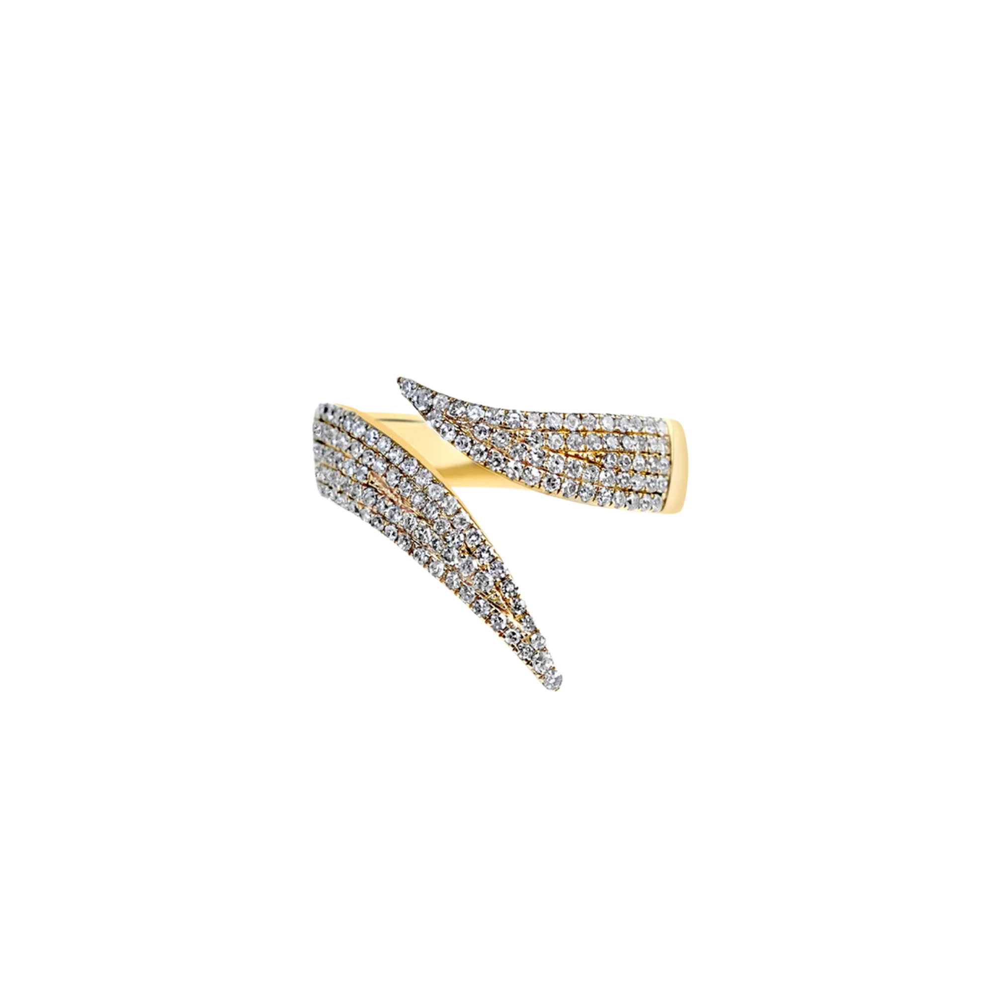 This captivating wrap-around ring features two pointed ends, each adorned with multiple rows of sparkling pavé diamonds, creating a breathtaking display of light. It's a statement piece that elegantly combines bold design with brilliance, destined to turn heads.
