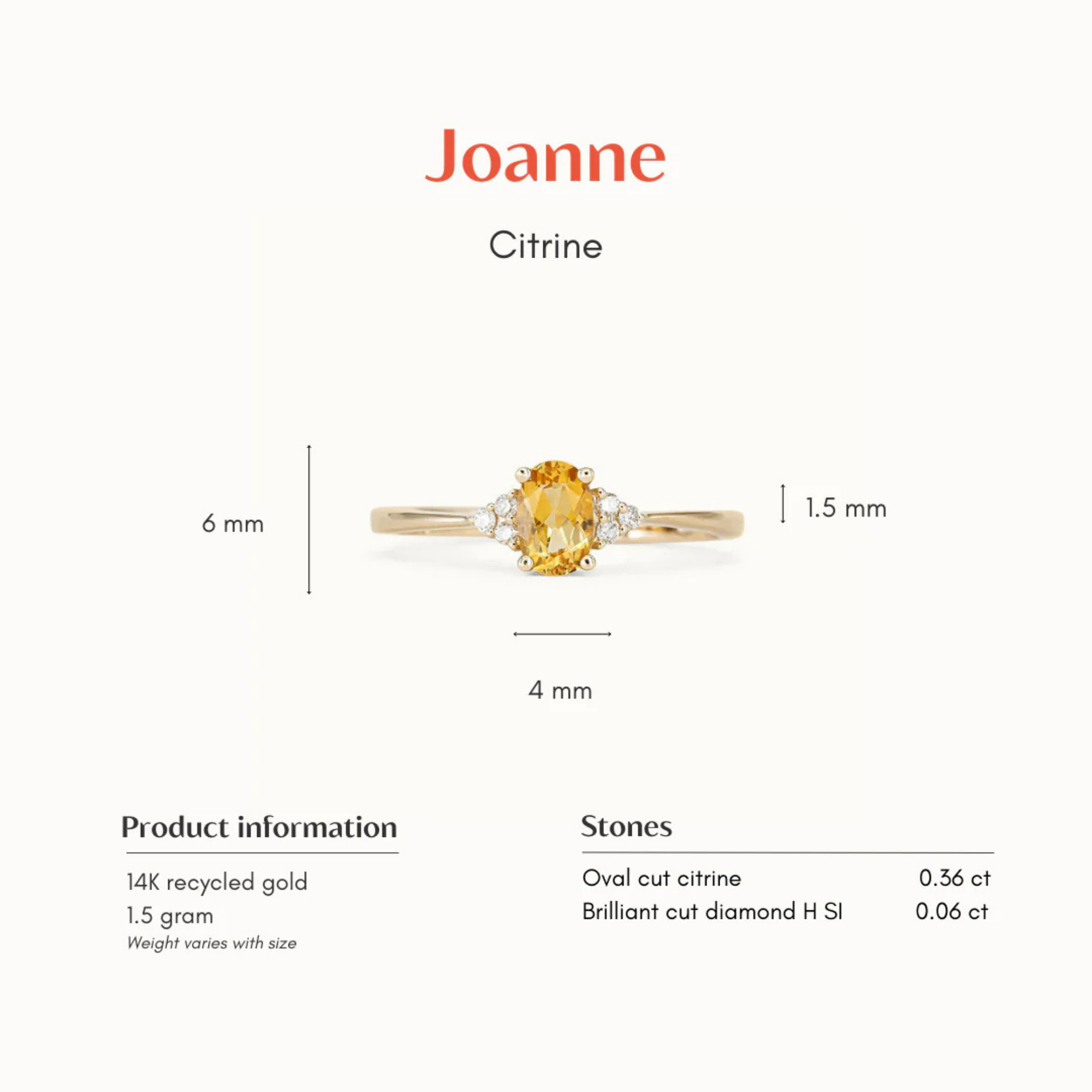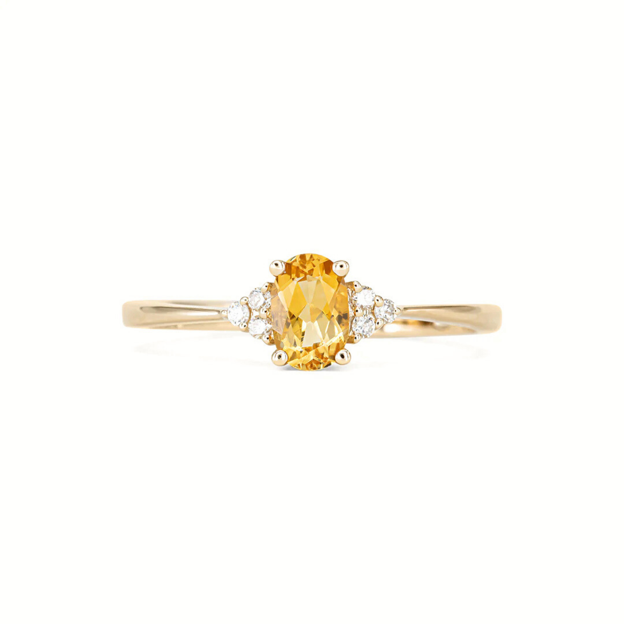 This 14K gold ring inspired by J.K. Rowling, featuring an oval-cut citrine surrounded by 6 small diamonds, pays tribute to the world-renowned author with a creative spirit.