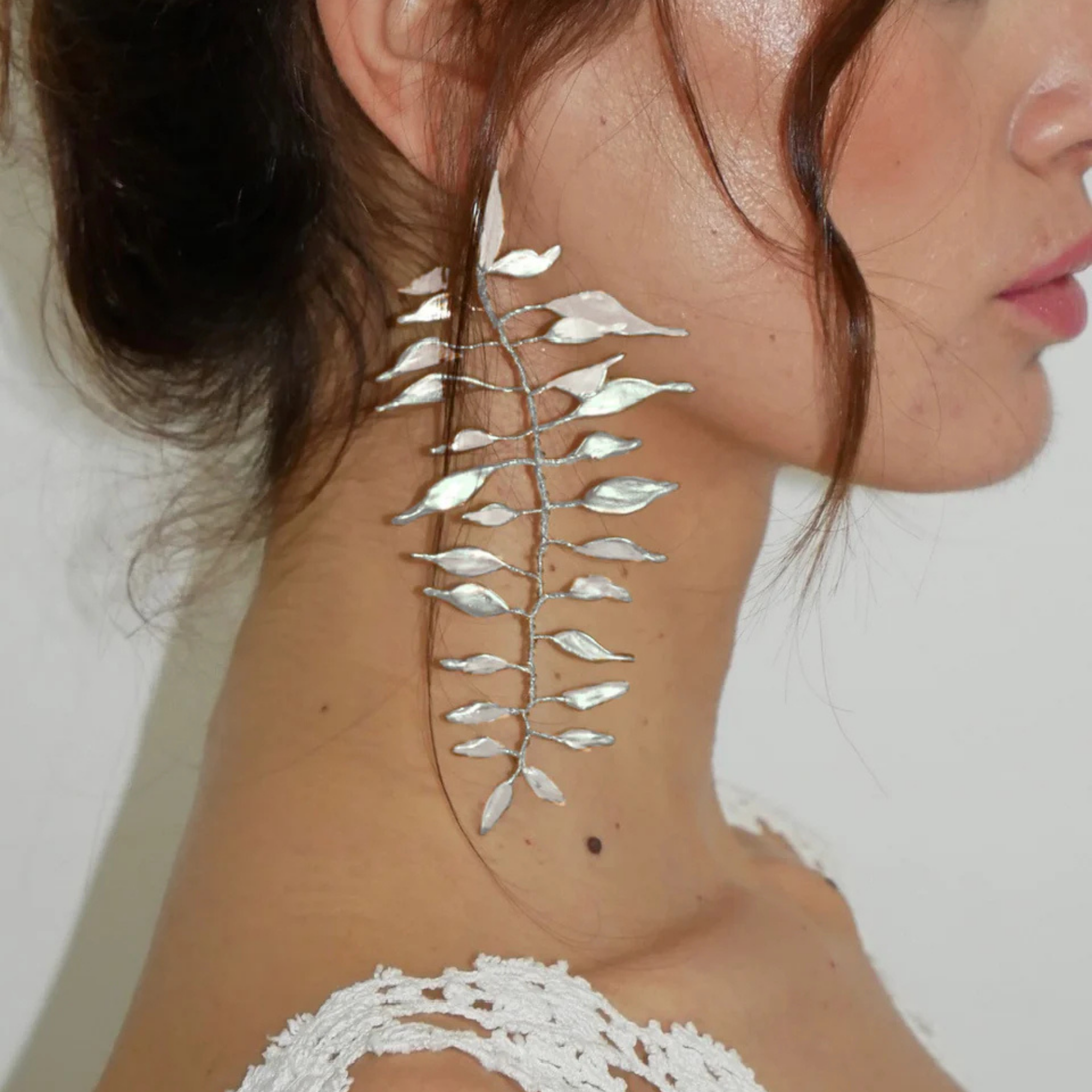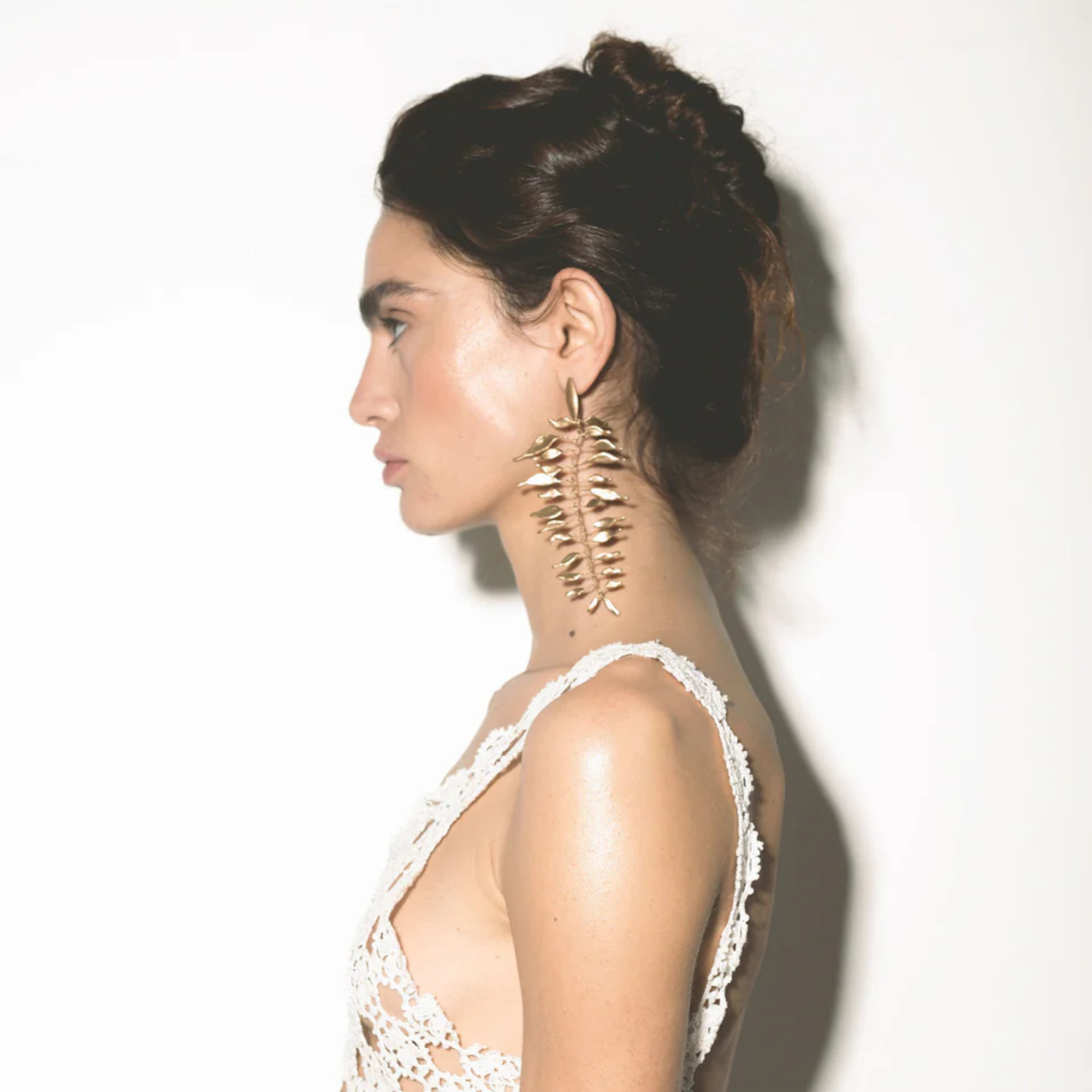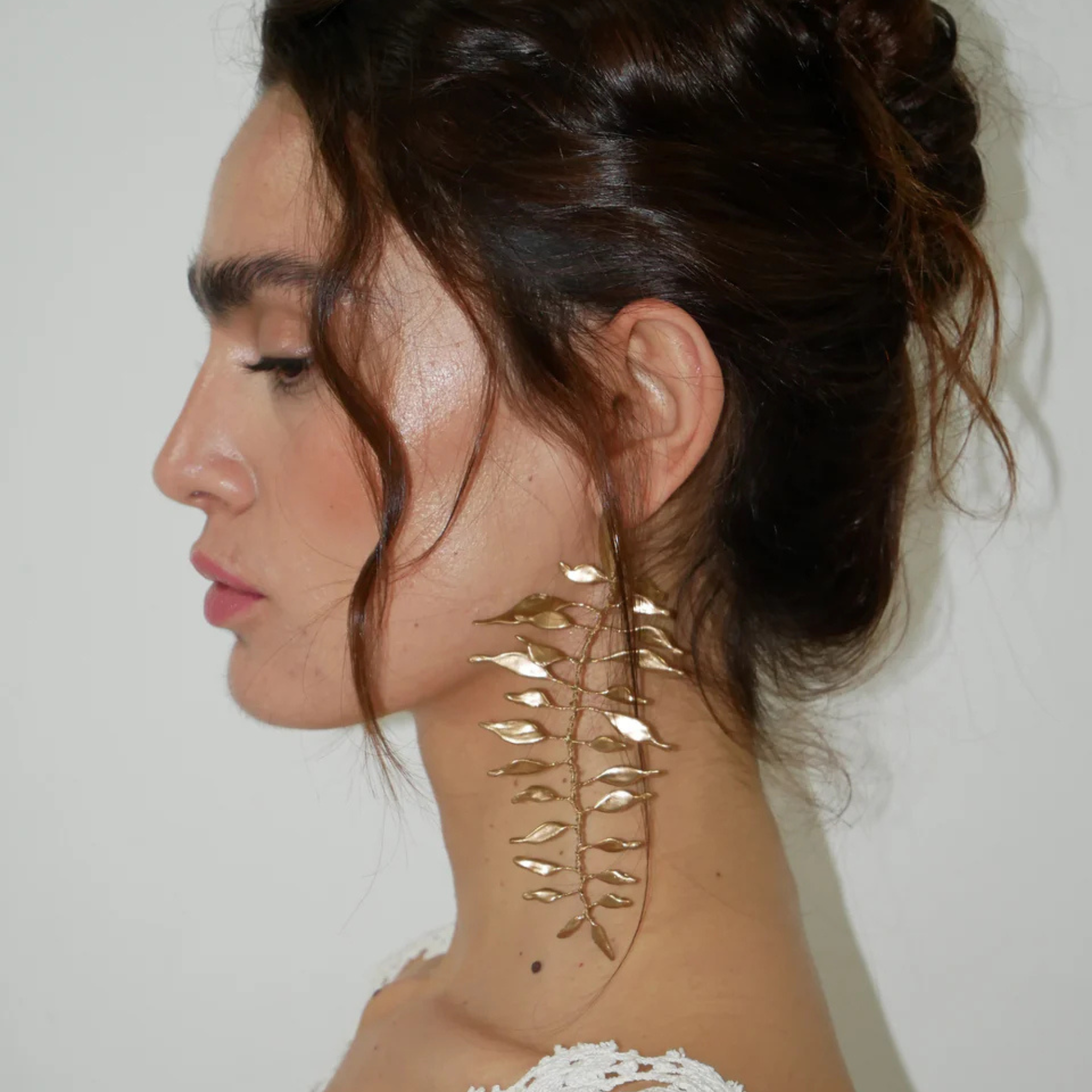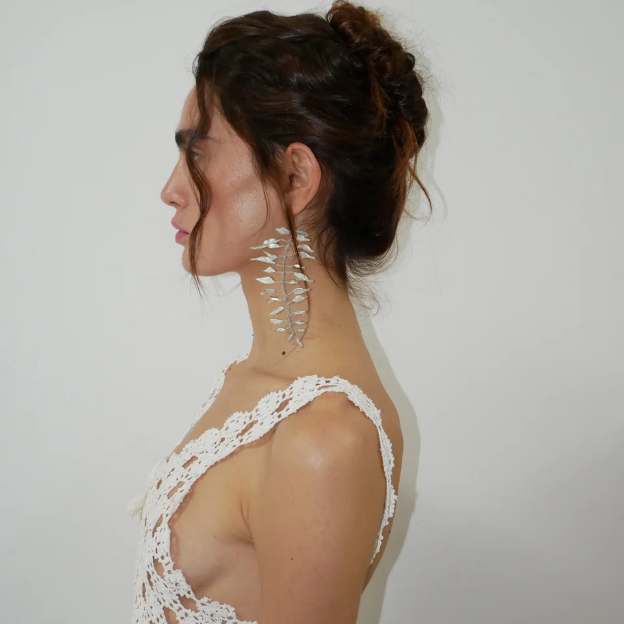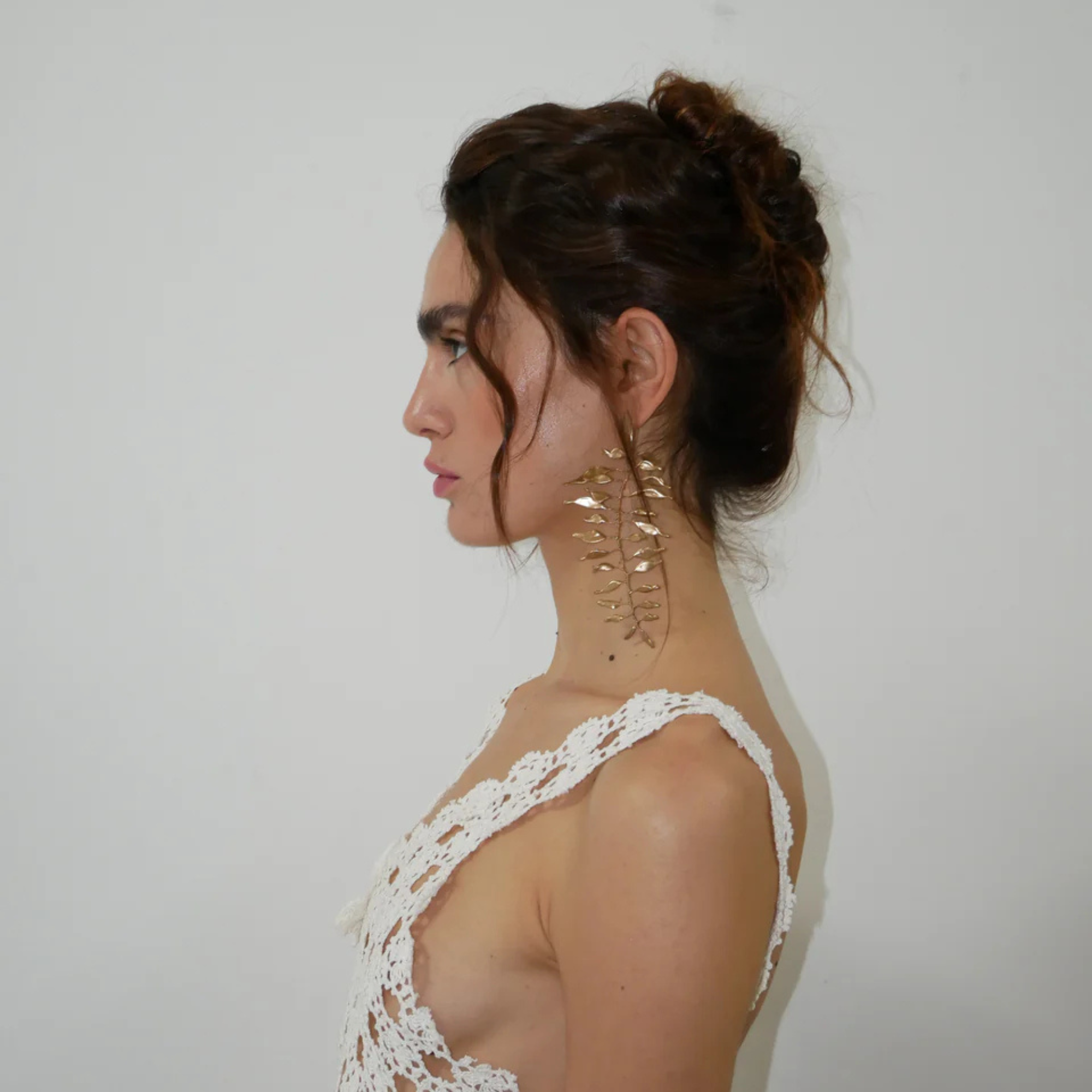 Materials: Alpaca thread in silver-plated or gold-plated brass and copper. Infinite layers created through a meticulous process of overlaying varnishes. Thread closure composed of 67% cotton and 33% rayon. Details with carefully selected Czech crystals, rhinestones, and beads. Sold as a pair (2 pieces)