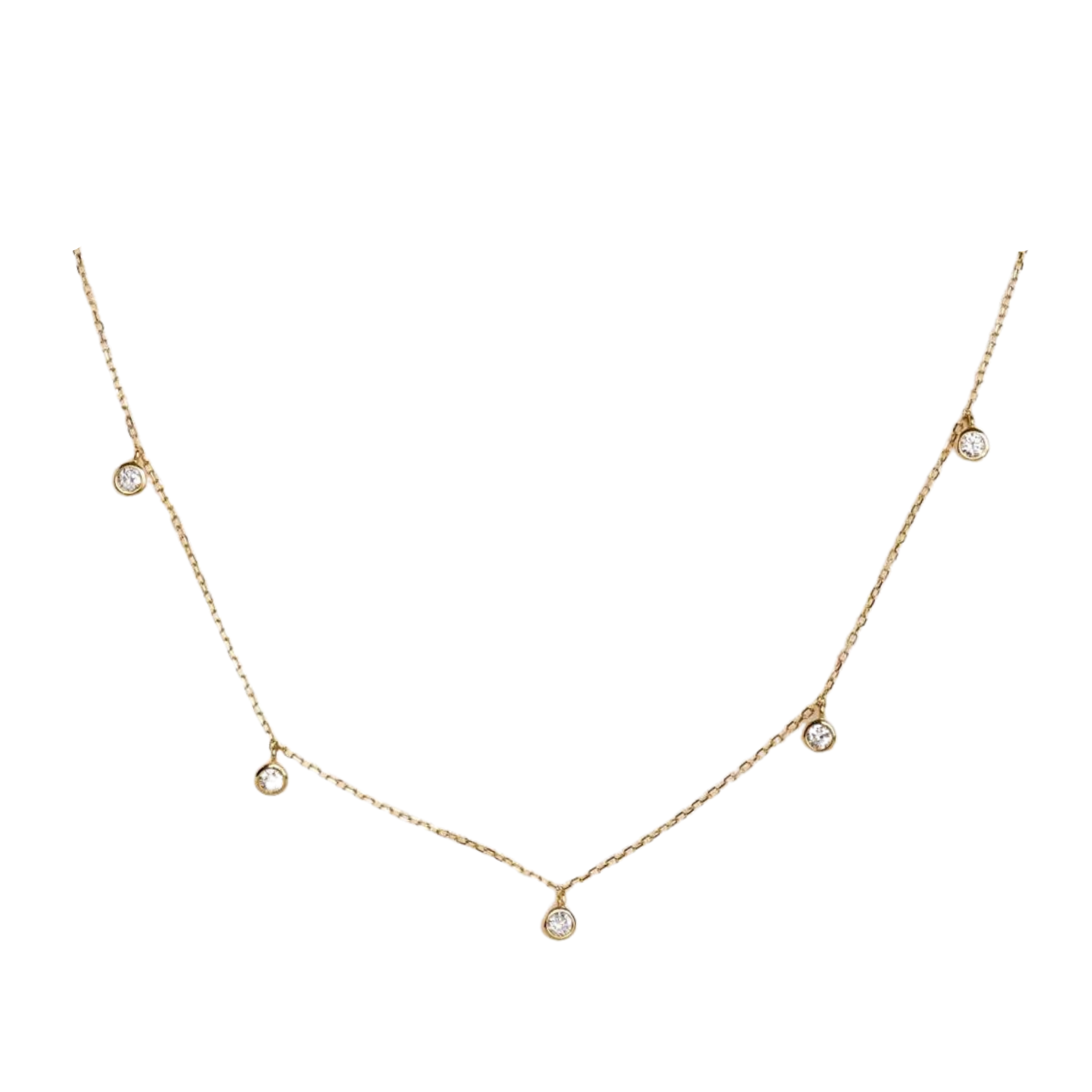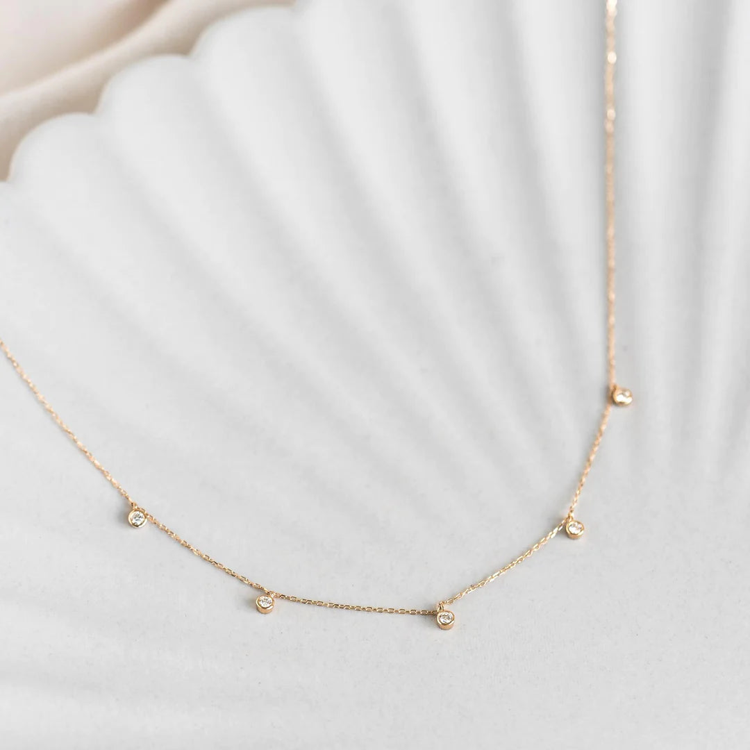 This stunning necklace features five bezel-set diamonds on a 14k gold chain. Versatile and elegant, this necklaces dresses up any look and makes a wonderful gift.