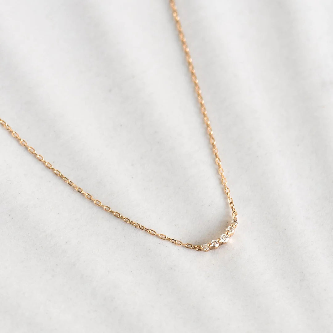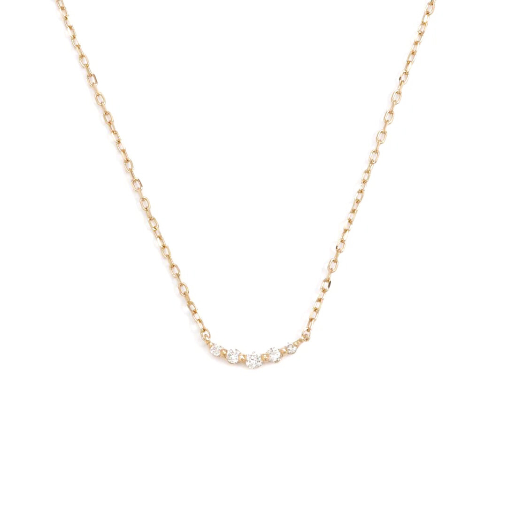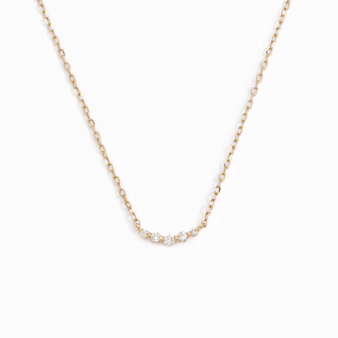 This 14k gold necklace features five diamonds arranged on a curved bar. The diamonds vary in size, with the largest in the center.