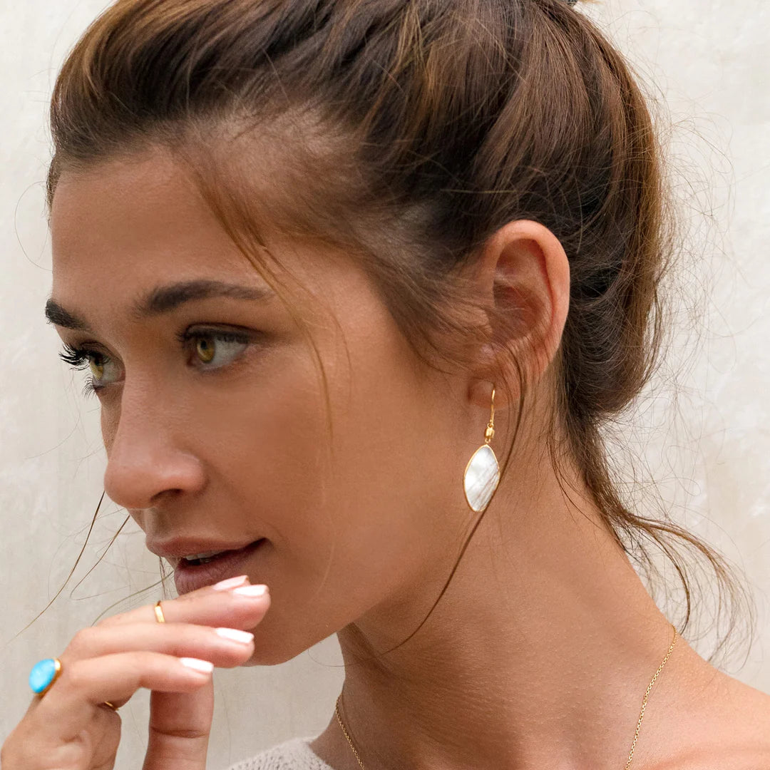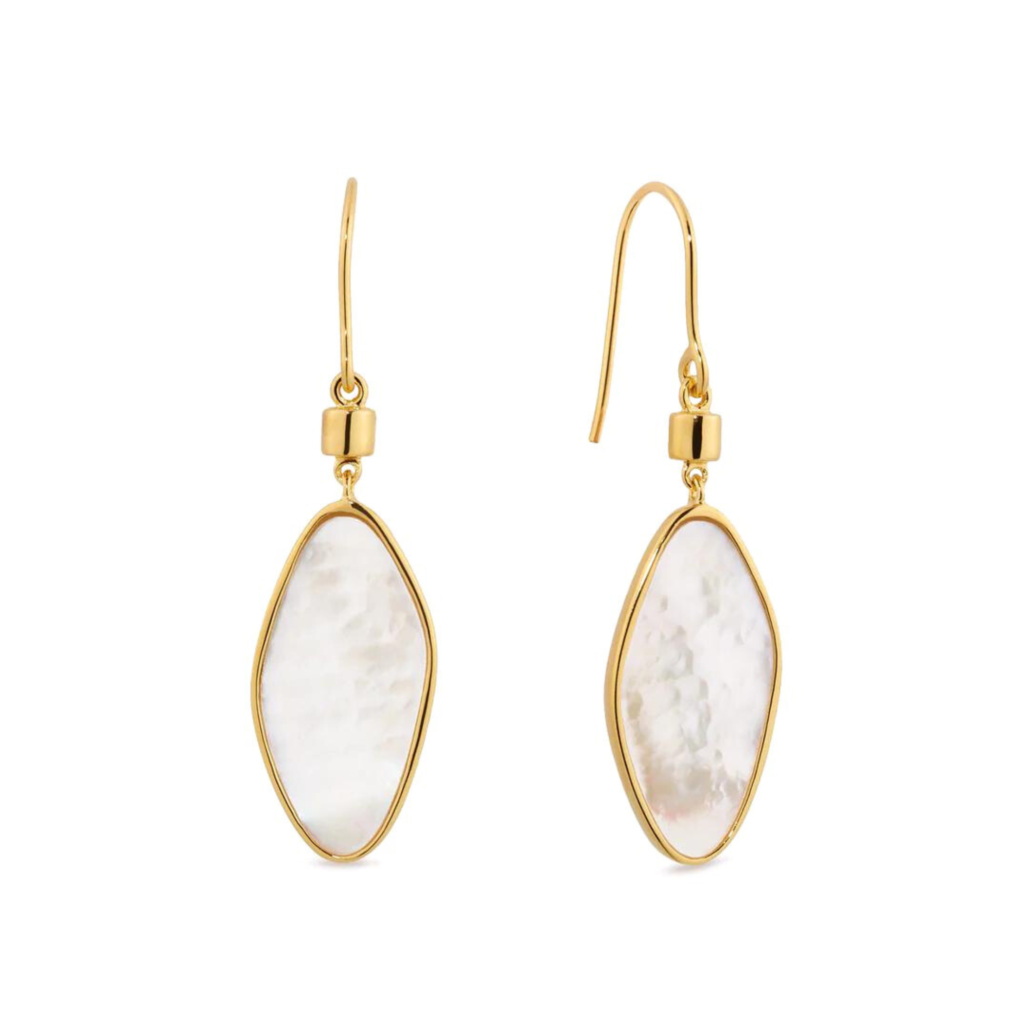 Gold dangle fish hook earrings featuring iridescent mother of pearl oval disc pendants.