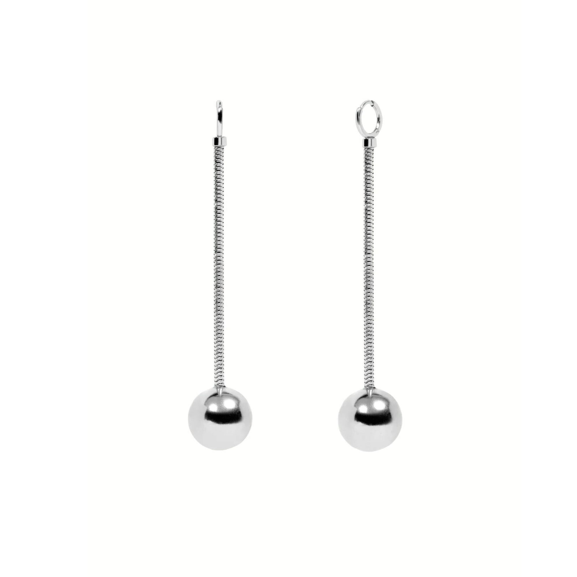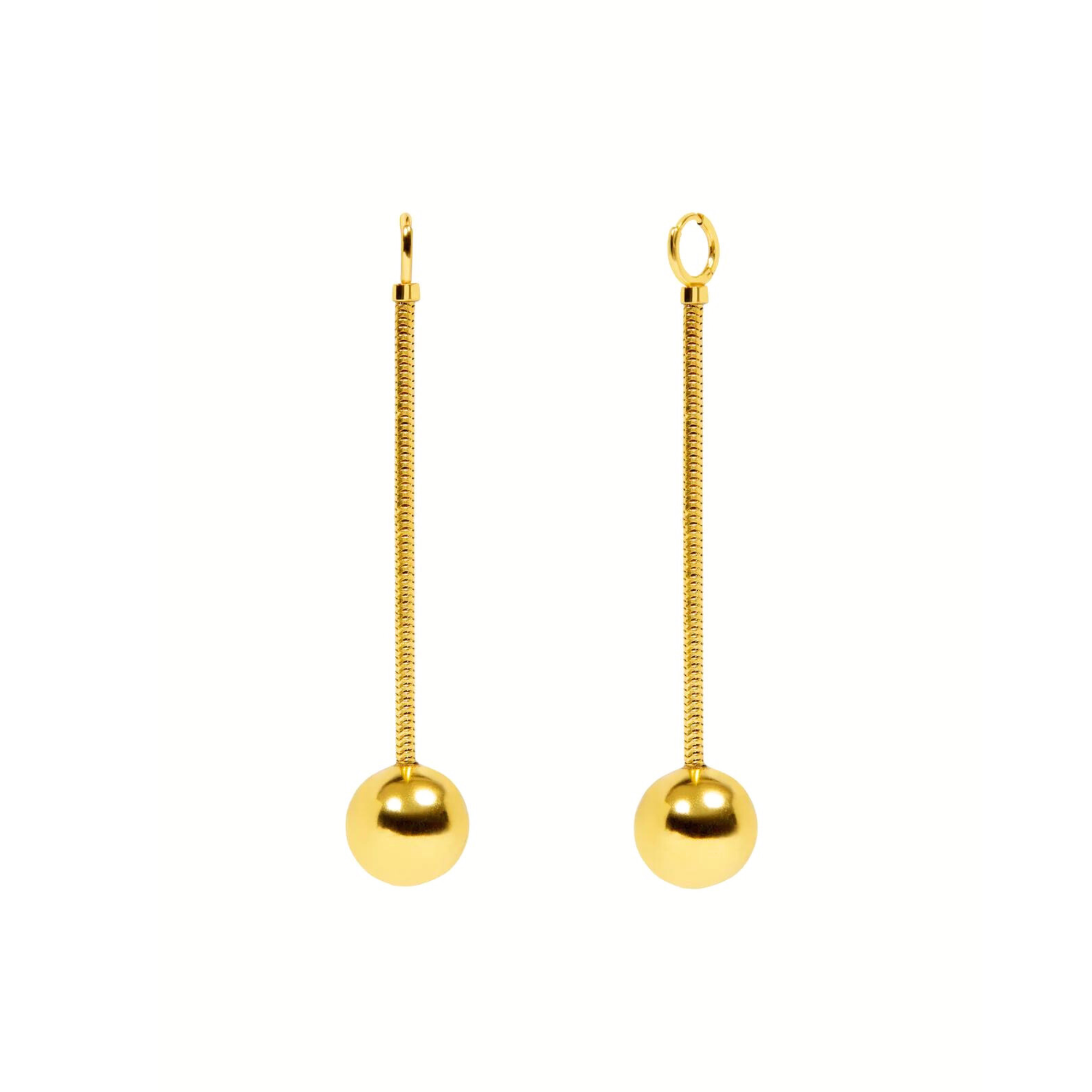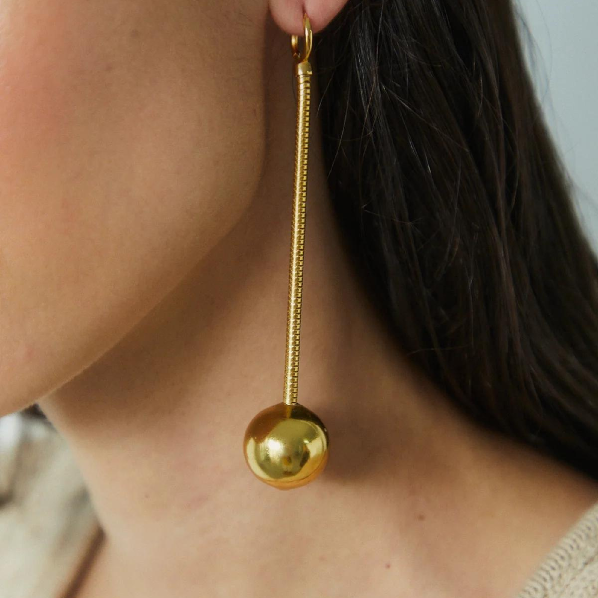Long earring with a sphere at the end. It is held in place by a small hoop that covers the hole. A piece of jewellery for everyday wear or special moments and events, weddings, parties and dinners. It is an ideal earring for those who want to spice up their look and it is very flattering. A special piece, designed in our Barcelona studio.