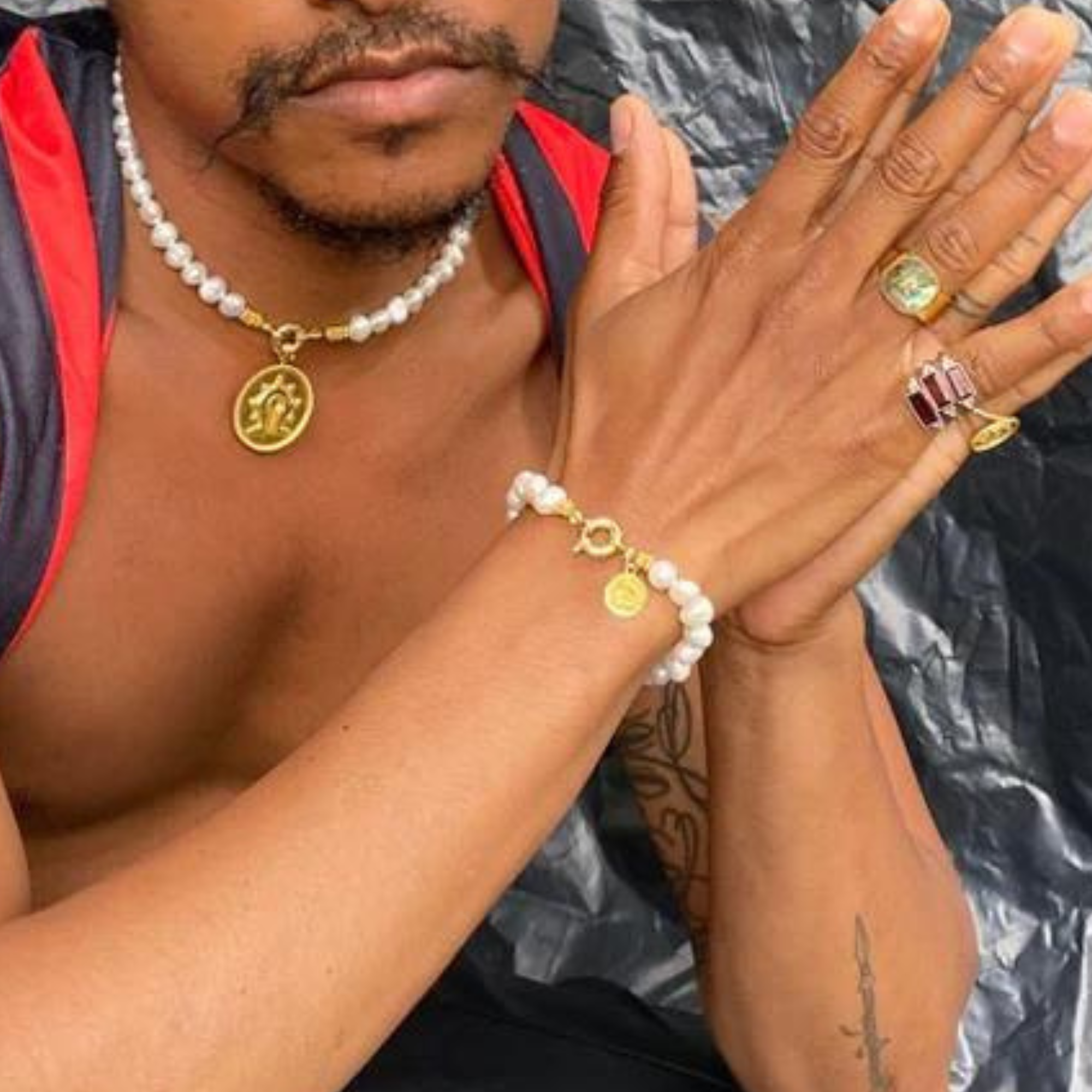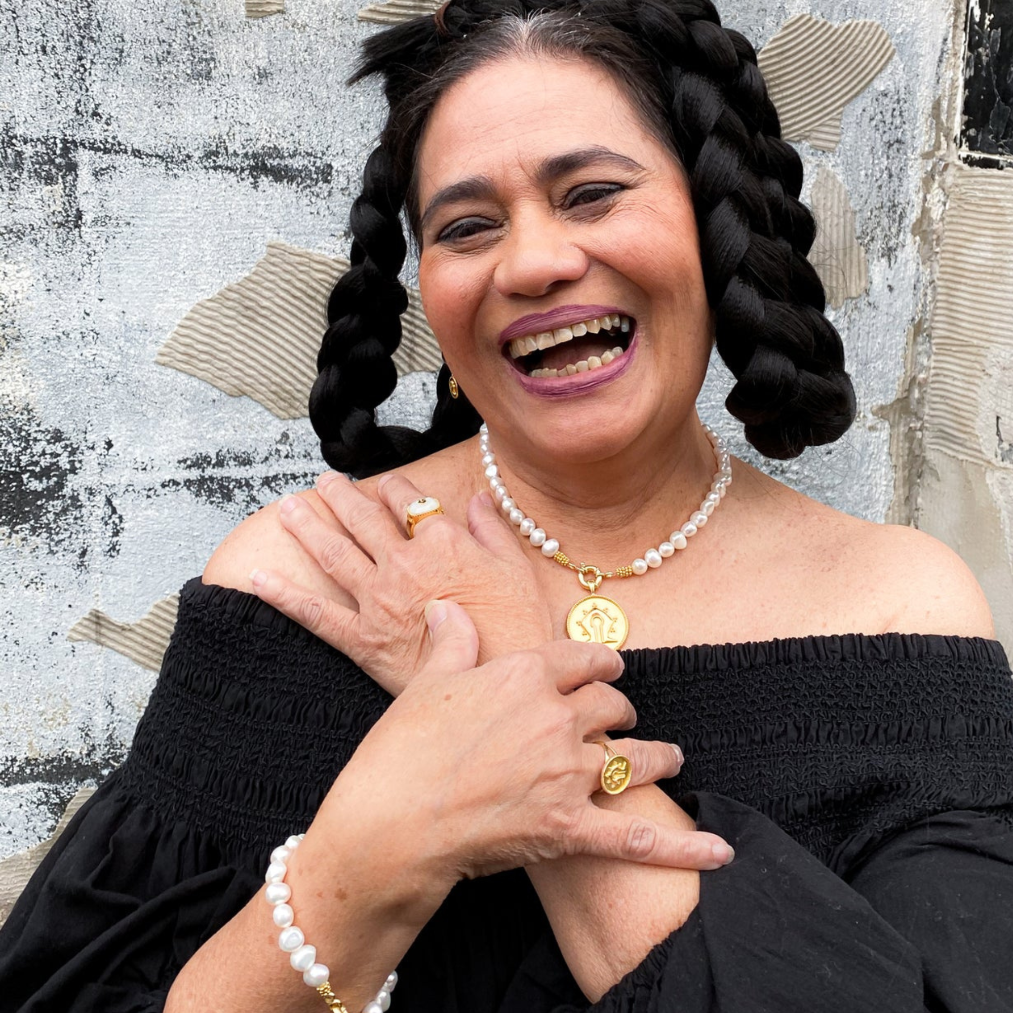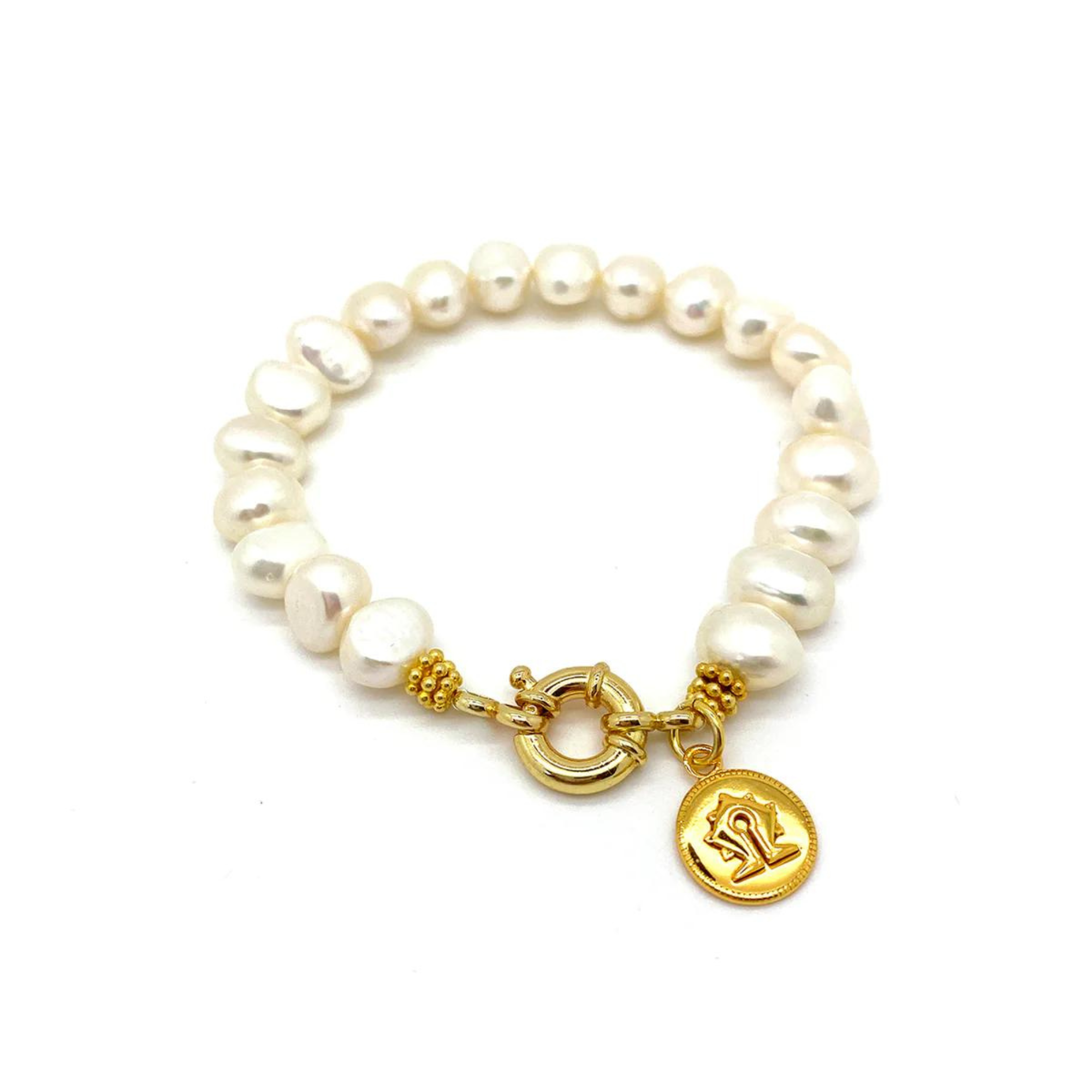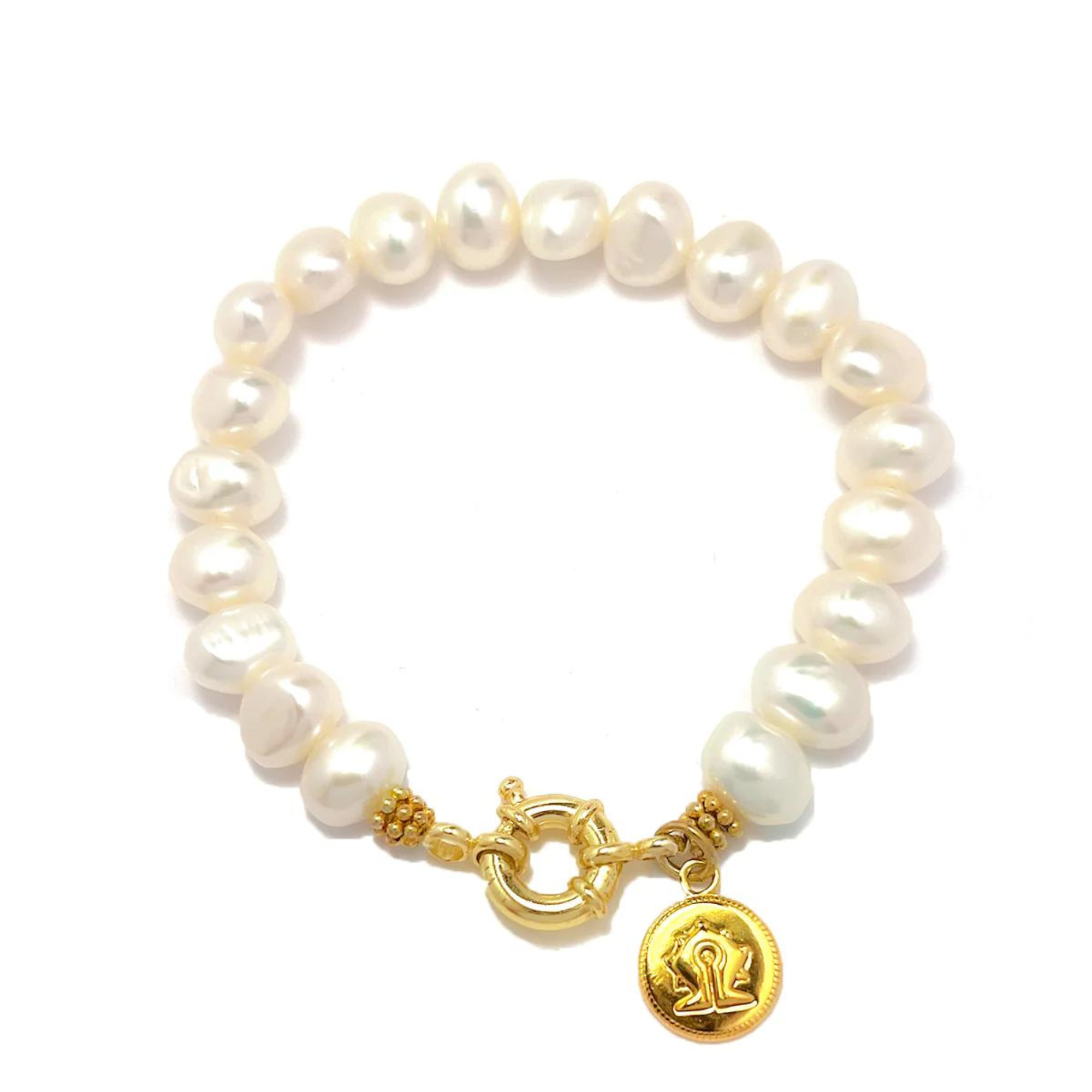 A statement bracelet made of freshwater Pearls and a 18ct gold plated sterling silver Mamuli Coin Pendant. The Mamuli is a symbol originating from the Indonesian island, Sumba.- Limited edition-