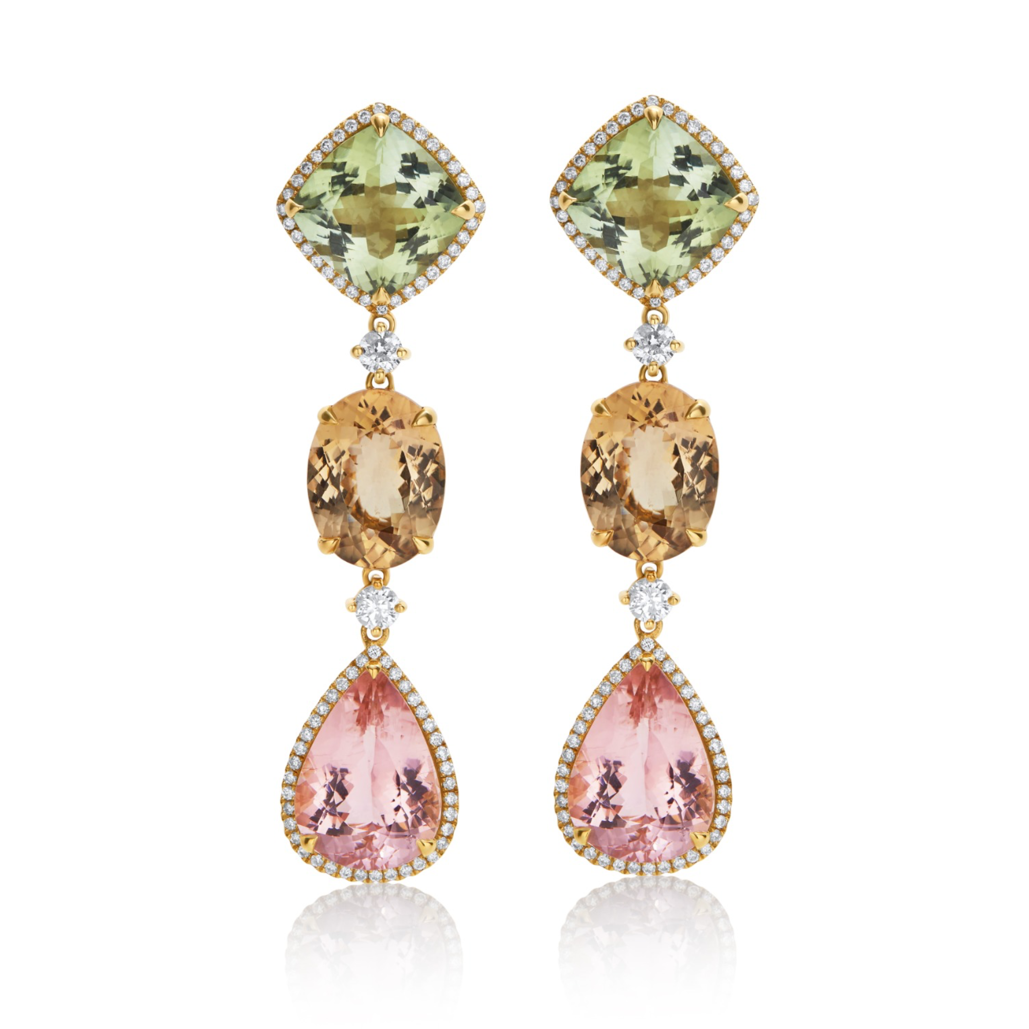 Aretes Turmalinas Largos - Aretes de oro amarillo 18k con turmalinas y diamantes
