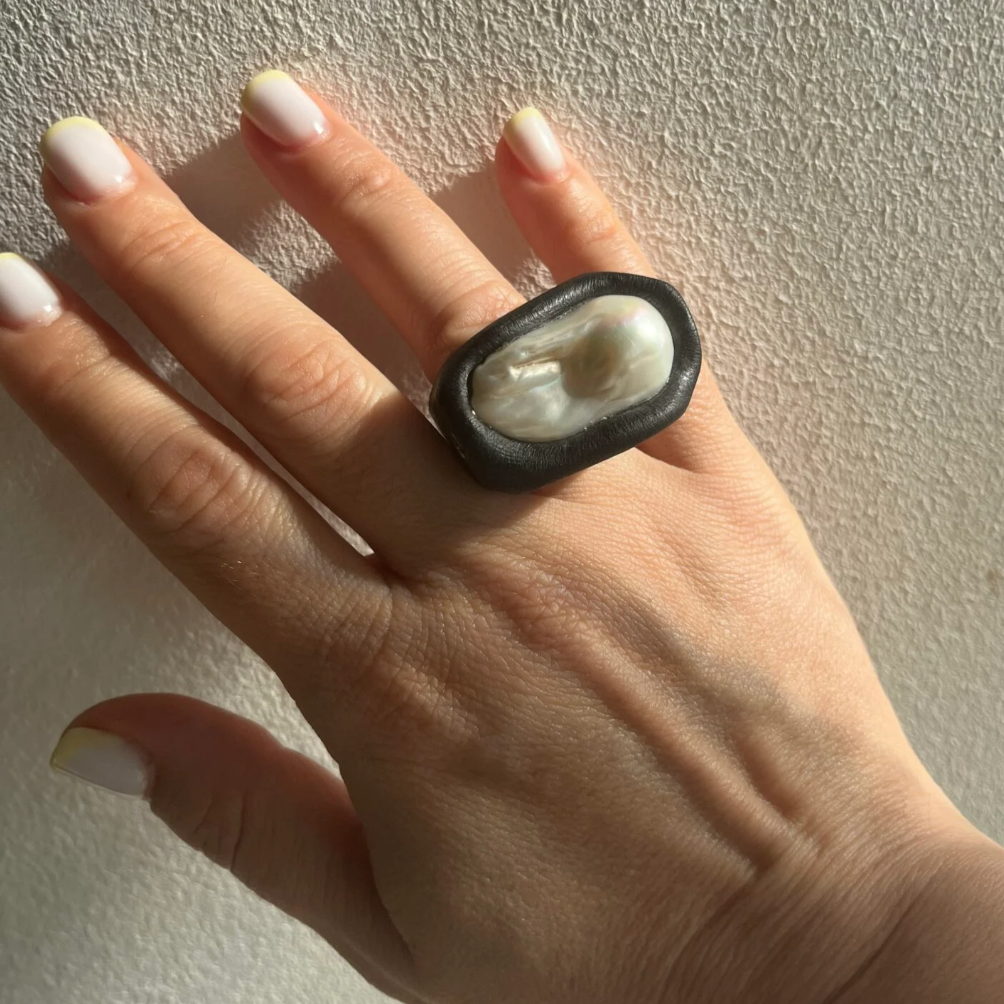 Style: Elegant statement jewelry, bridal pearl ring, contemporary luxury accessory.