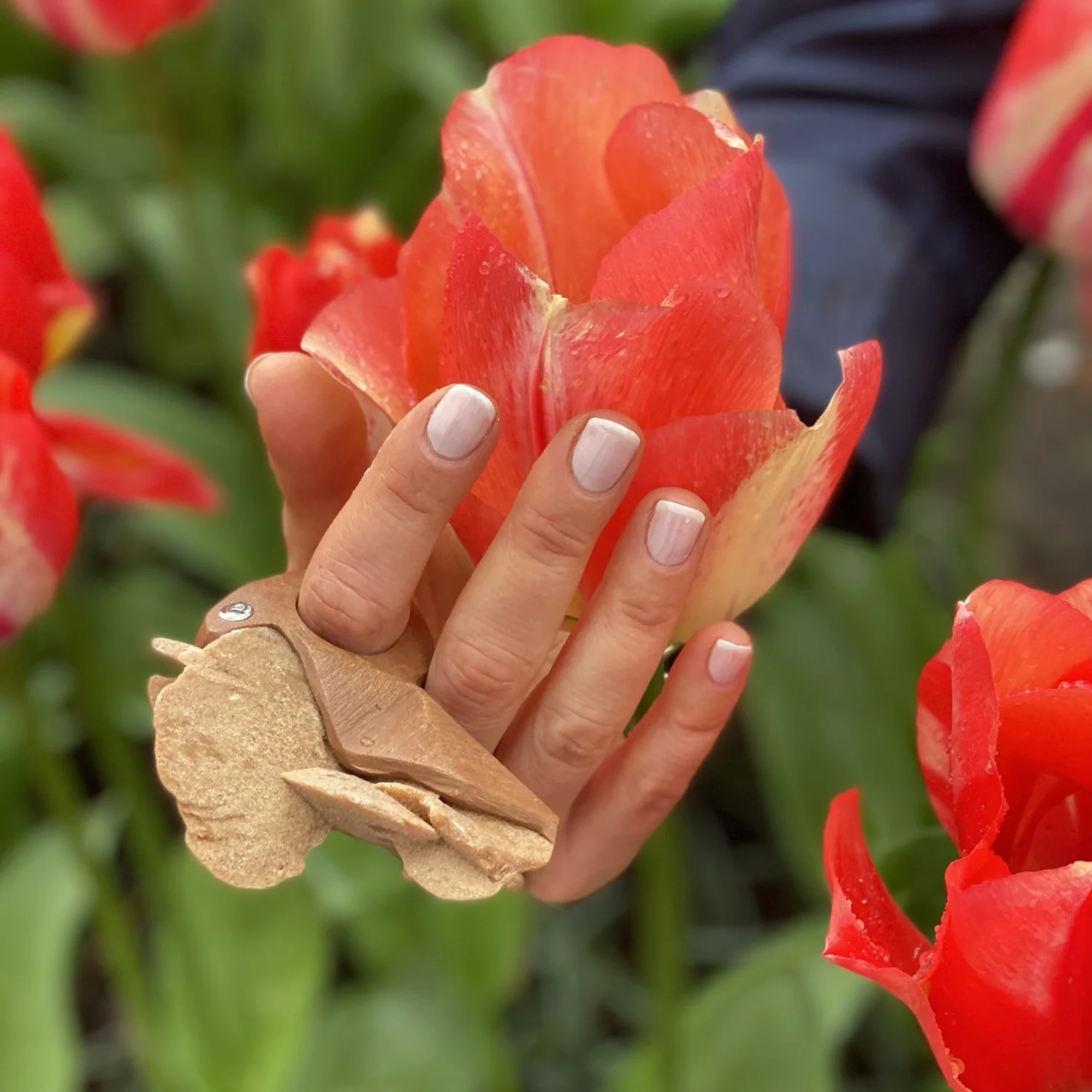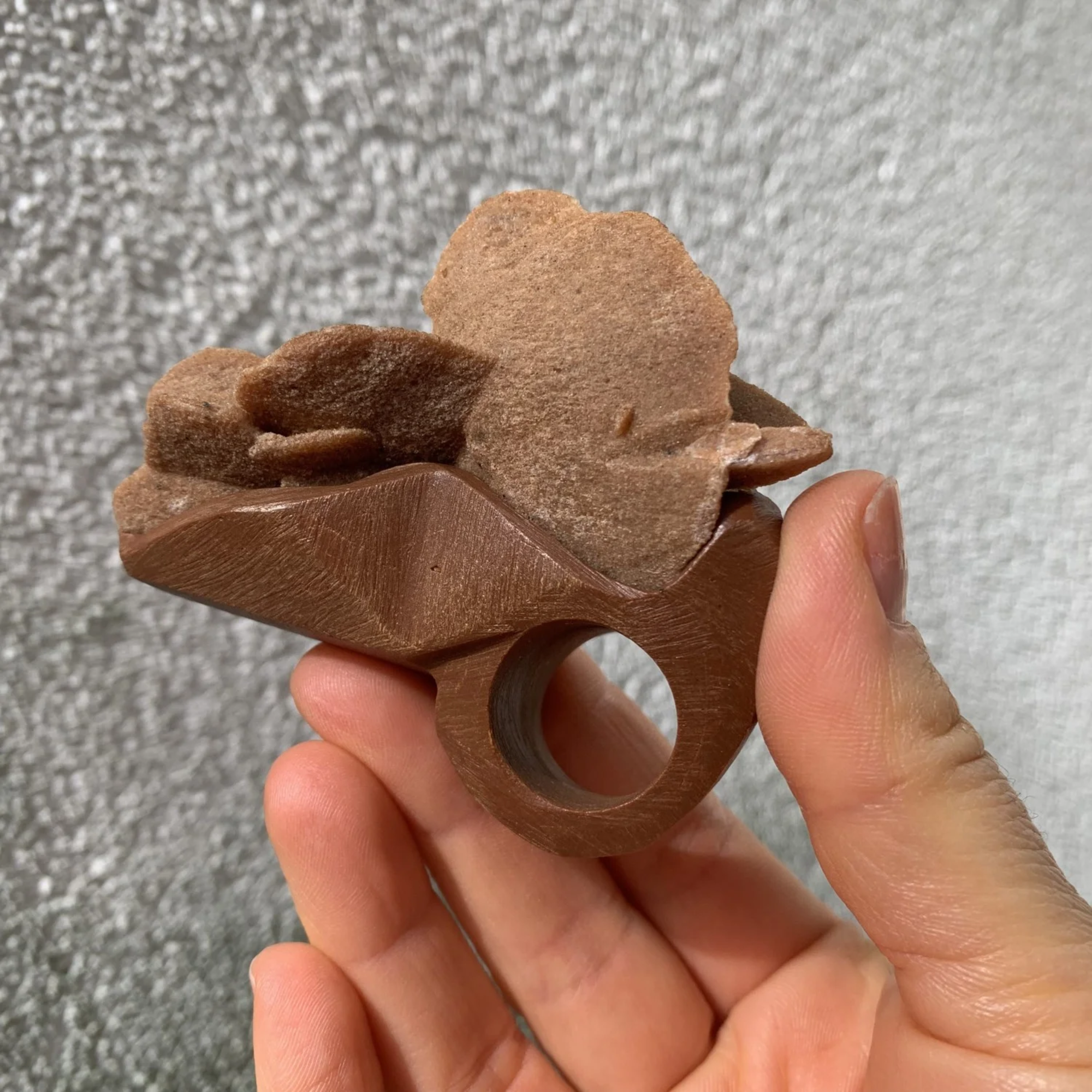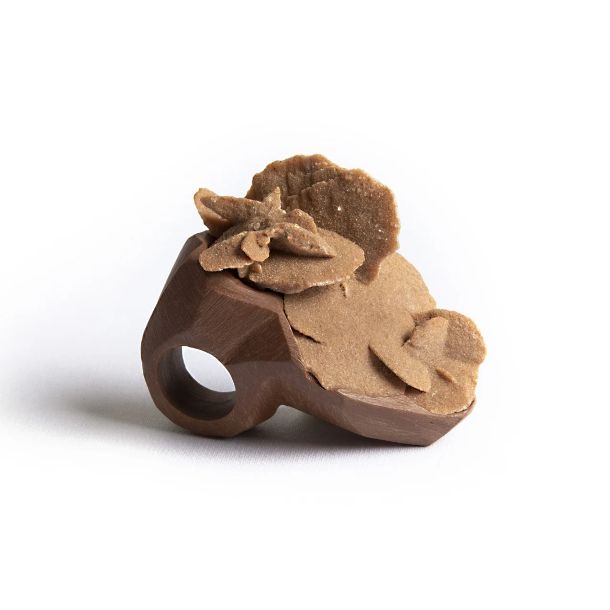 Designed by Olga iAKYMOVYCH and handmade in Amsterdam, Qatar reflects the dialogue between art, nature, and innovation. With its monochromatic caramel palette, the raw Desert Rose gemstone and ceramic band blend into a tactile composition — warm, architectural, grounded. Despite its bold scale, the ring feels harmonious on the hand, like a natural extension of your strength and individuality.