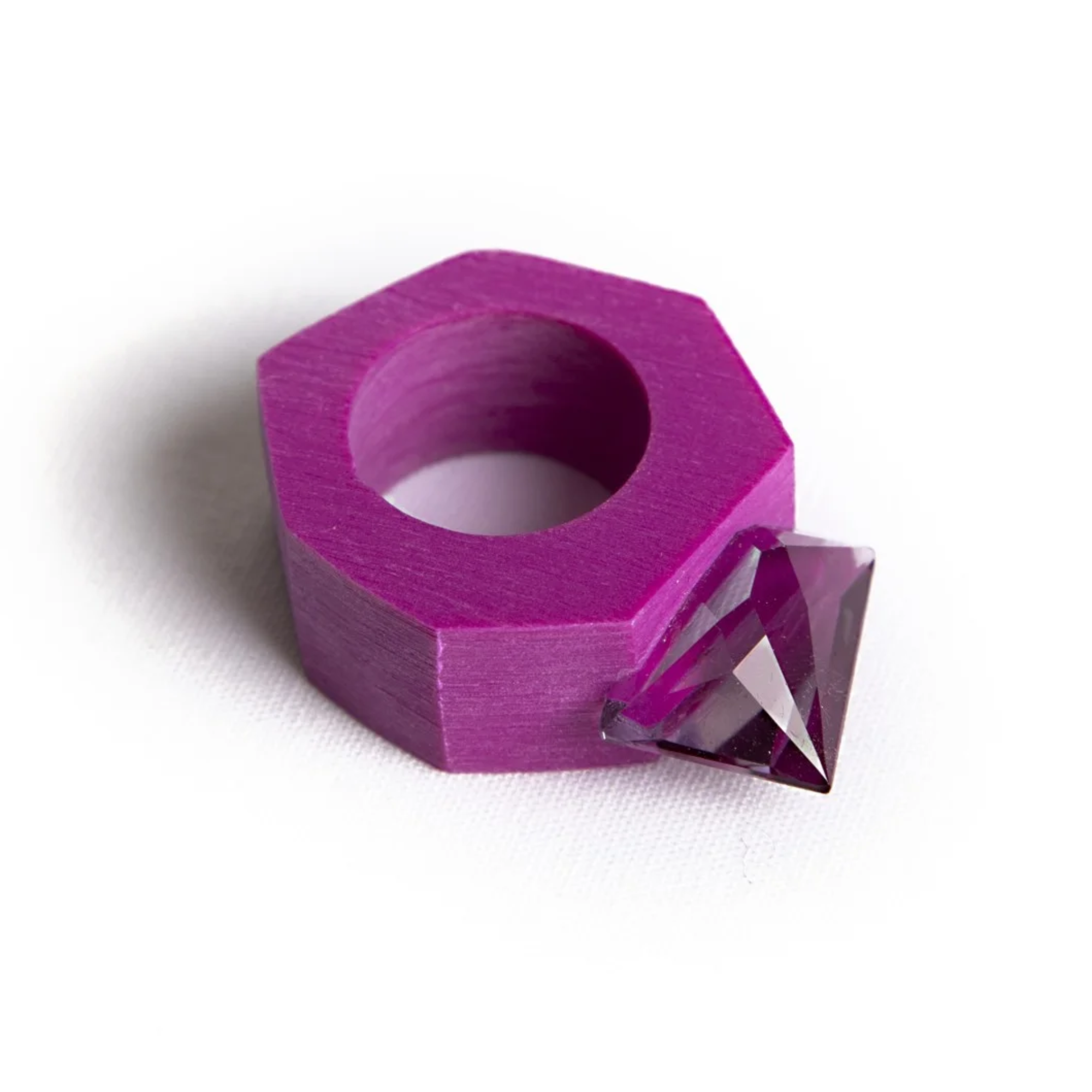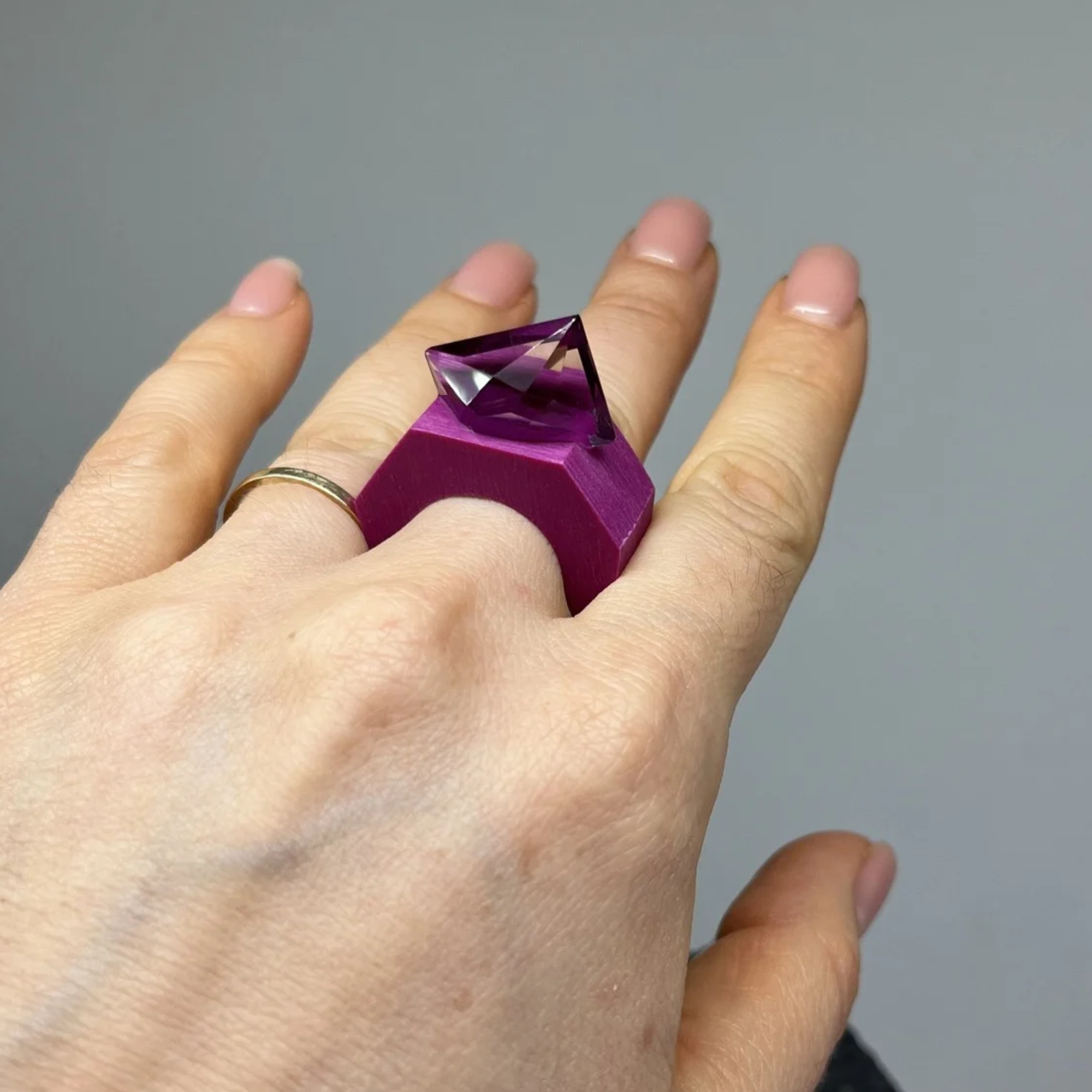 The gemstone’s deep violet hue and precise cut capture light with every movement, symbolizing self-awareness and inner strength. Set into a handcrafted ceramic band, the design offers modern durability while preserving the soul of an heirloom jewel.