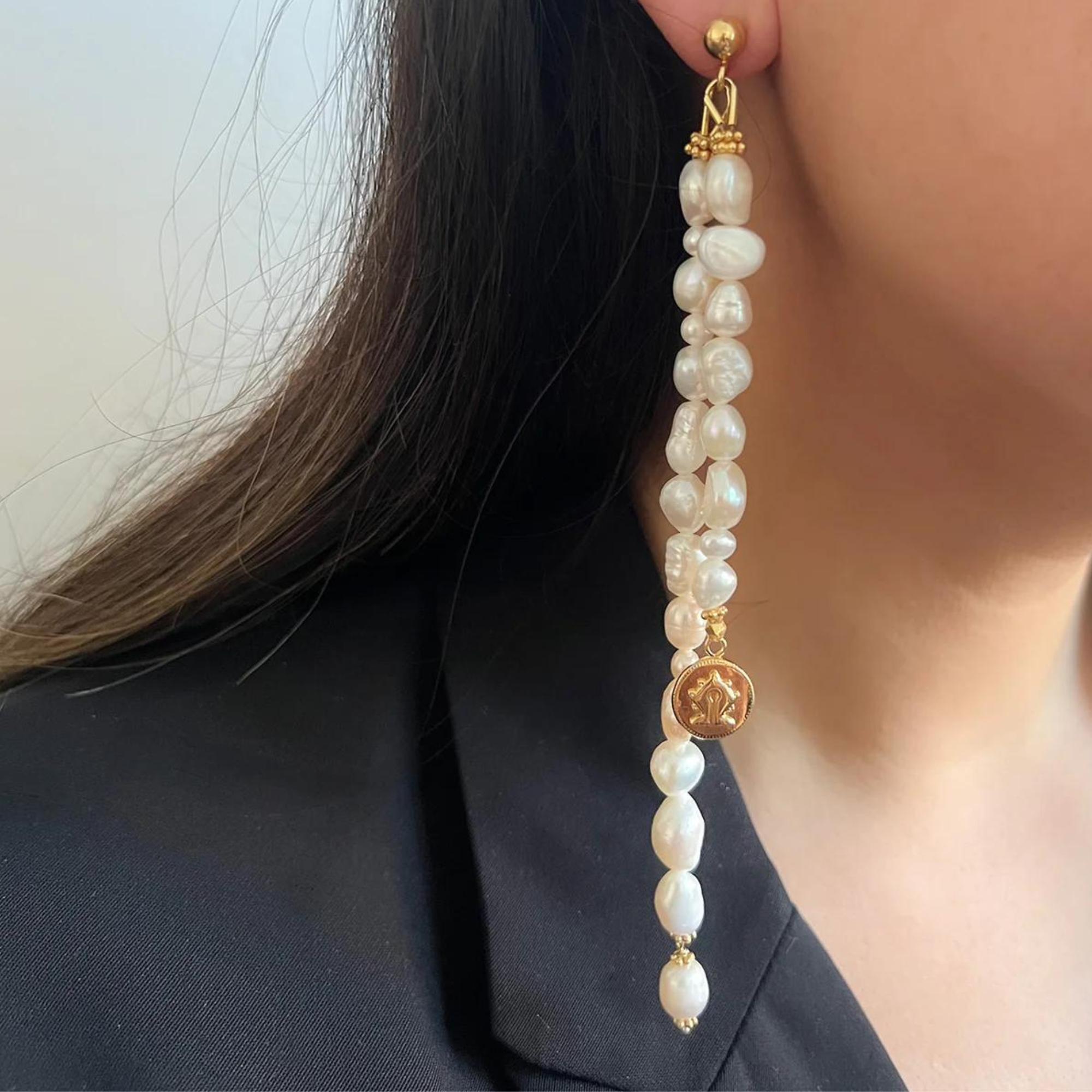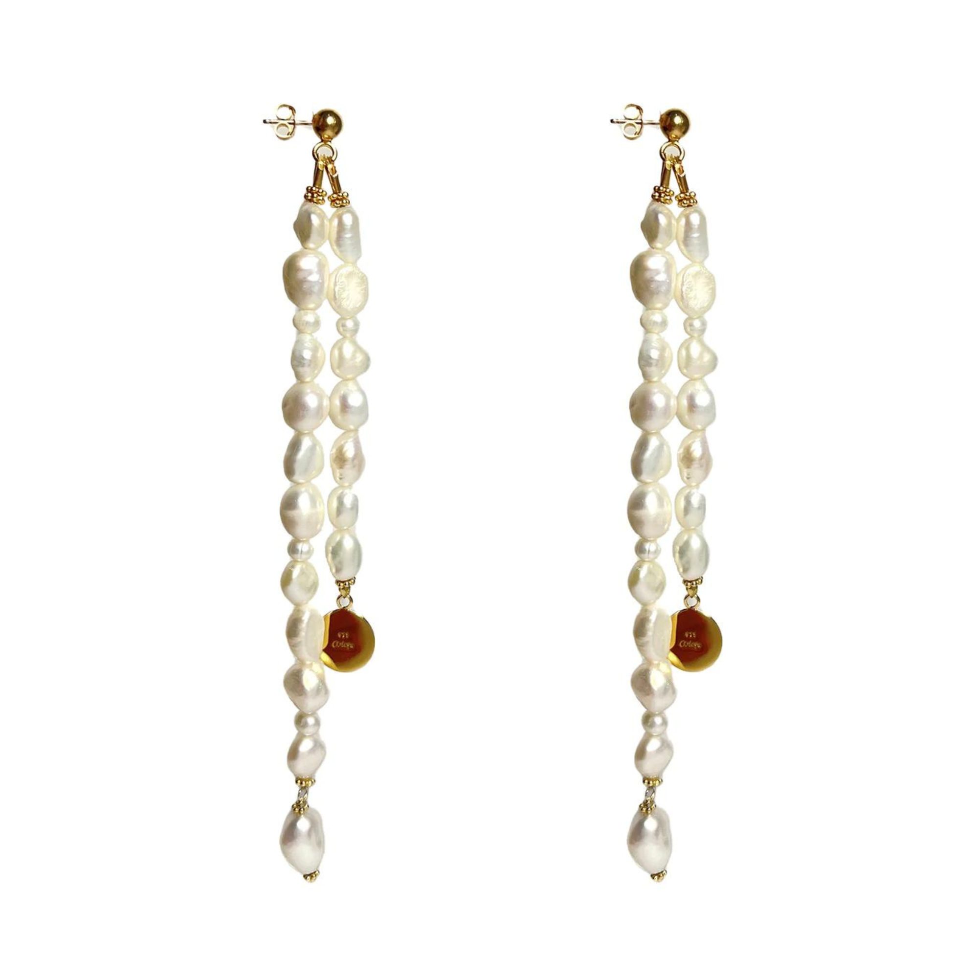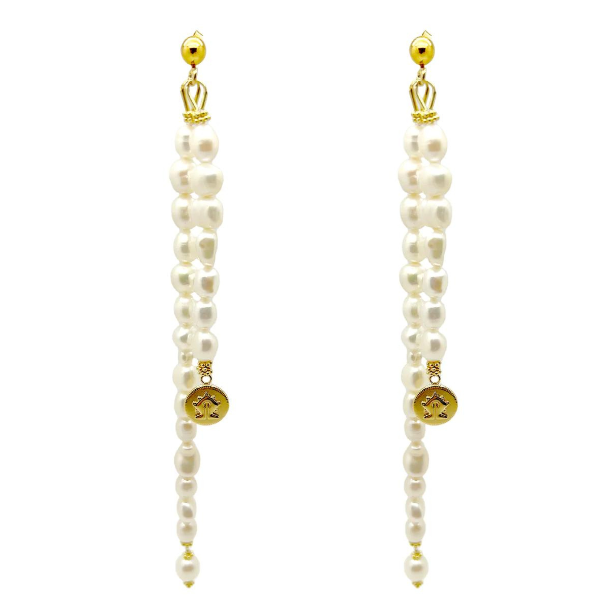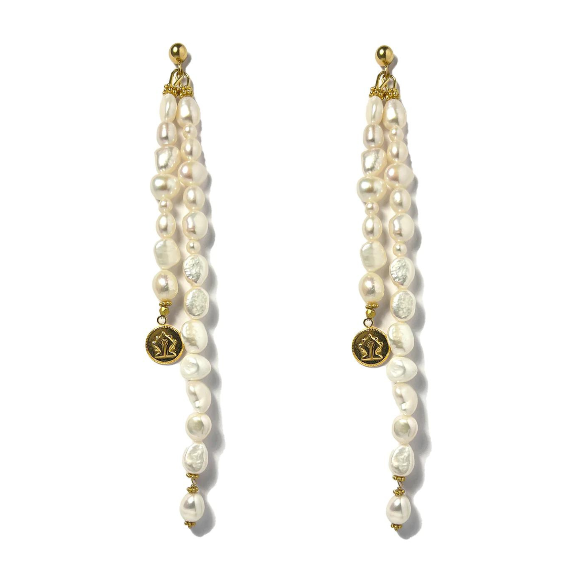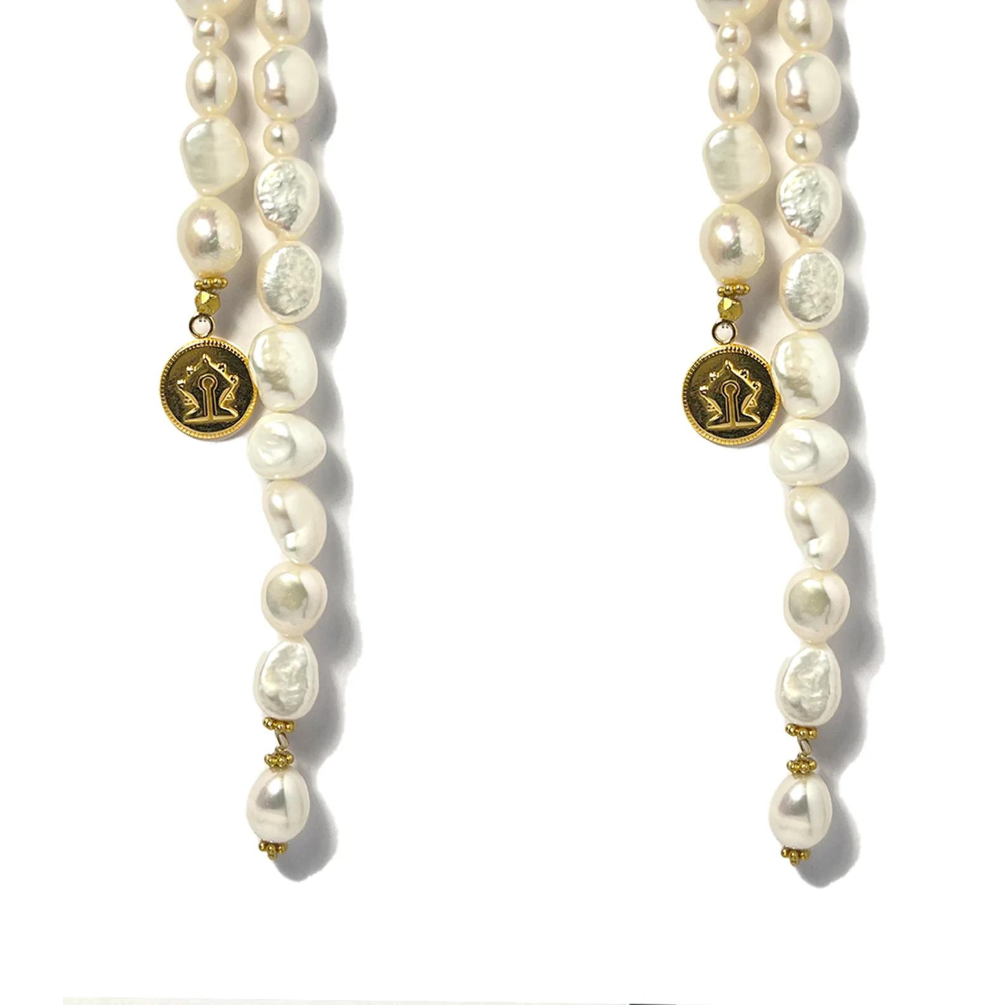 A pair of statement drop earrings made out of 2 strings of Freshwater pearl and a Mamuli coin dangling at the bottom. Total length of the earrings are 18cm long.