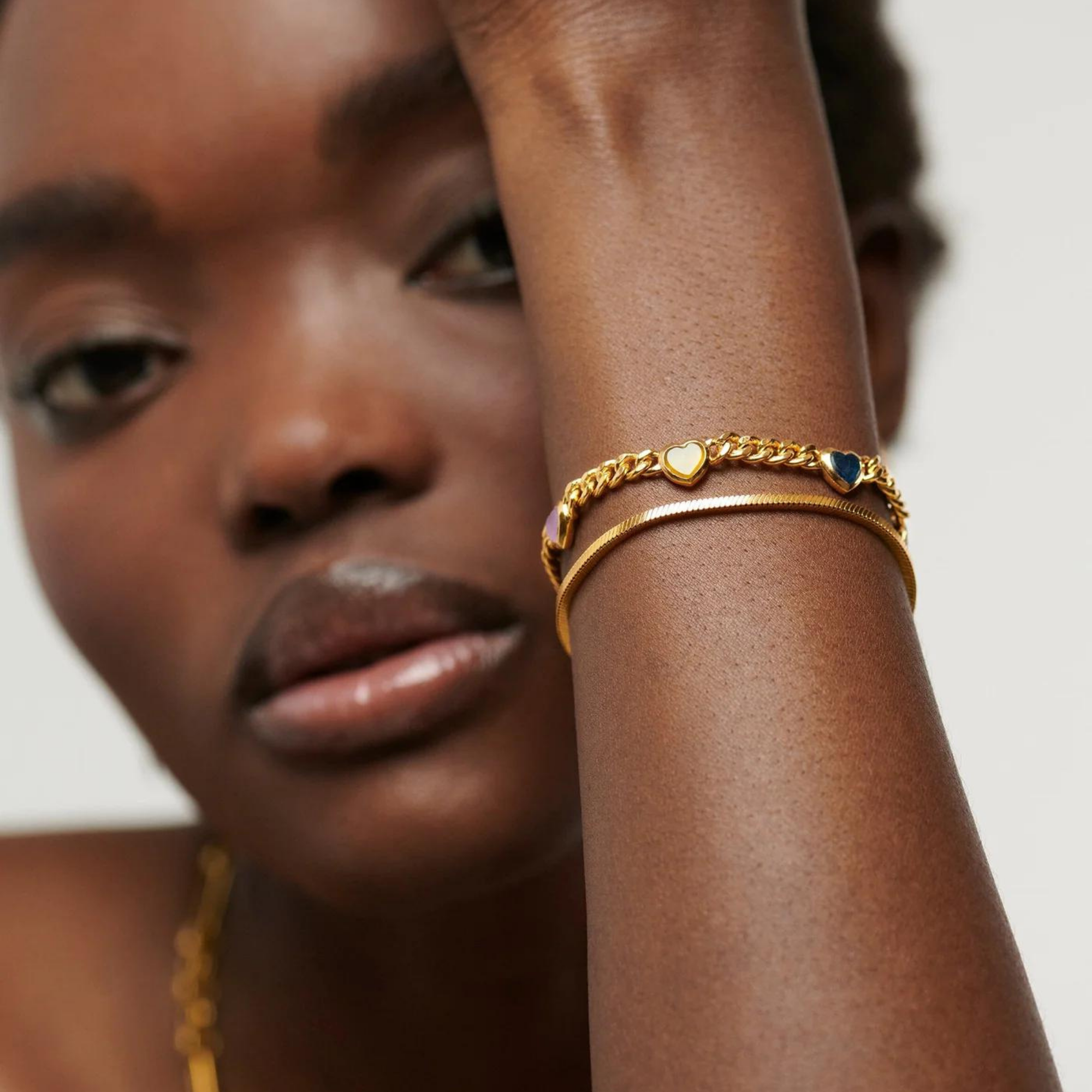 Bring colour to your arm stack. This retro-inspired bracelet features five jelly heart gemstone charms inset on a thick curb chain, in dyed mango and aqua chalcedony, blue, purple and pink quartz. Stack with other chains and beaded bracelet or wear solo for everyday styling.