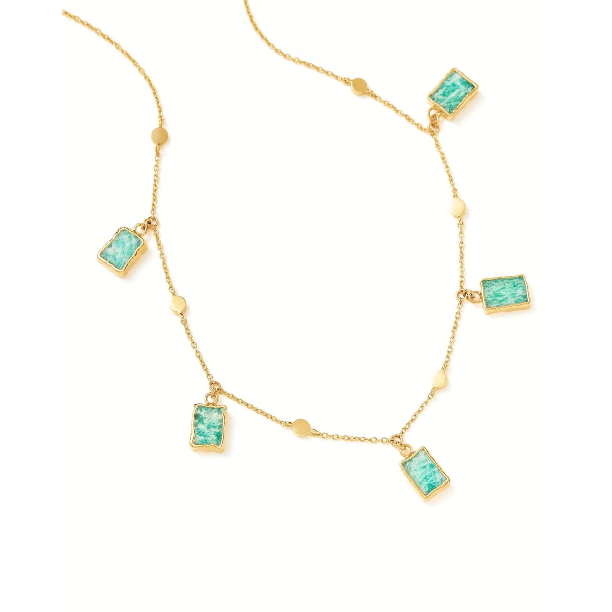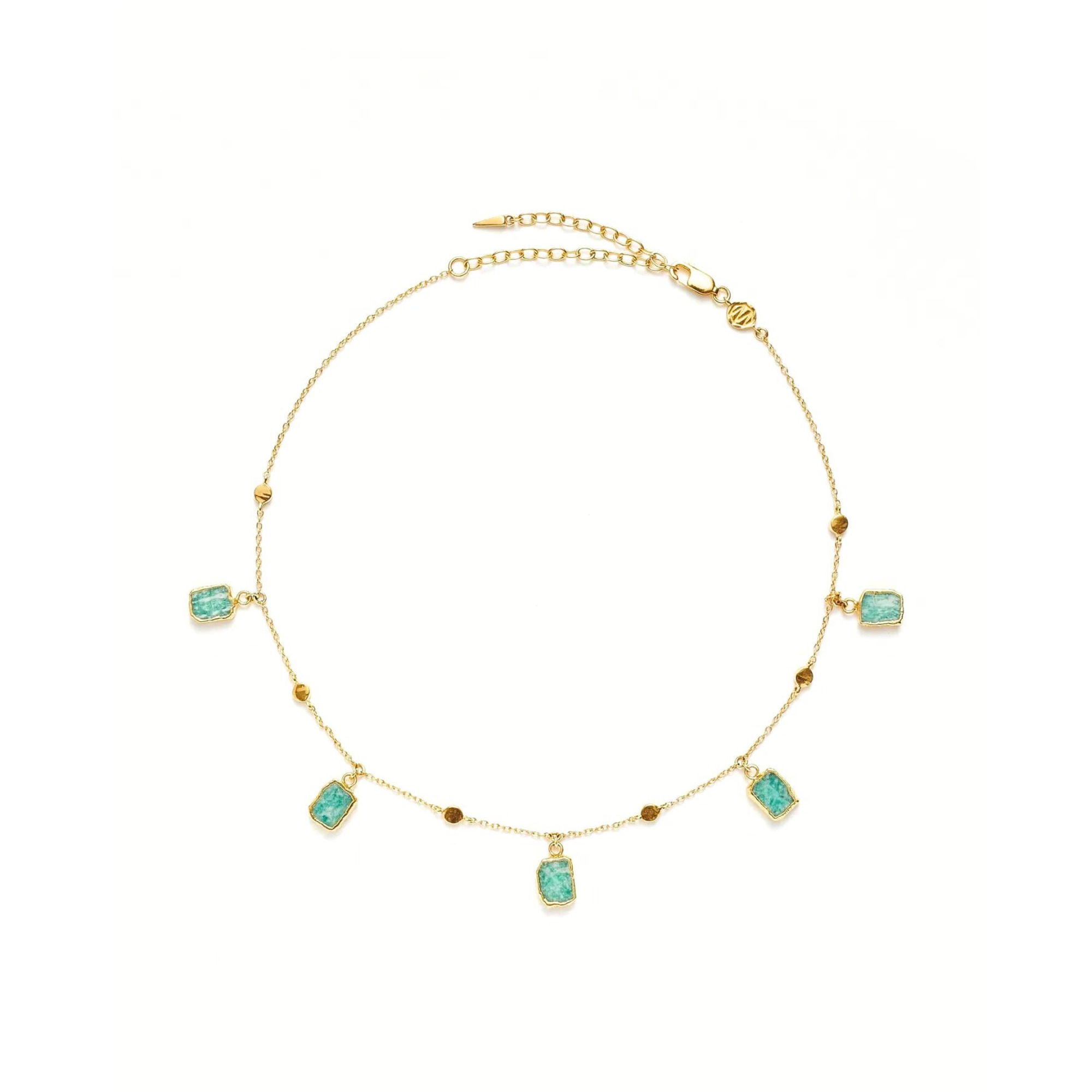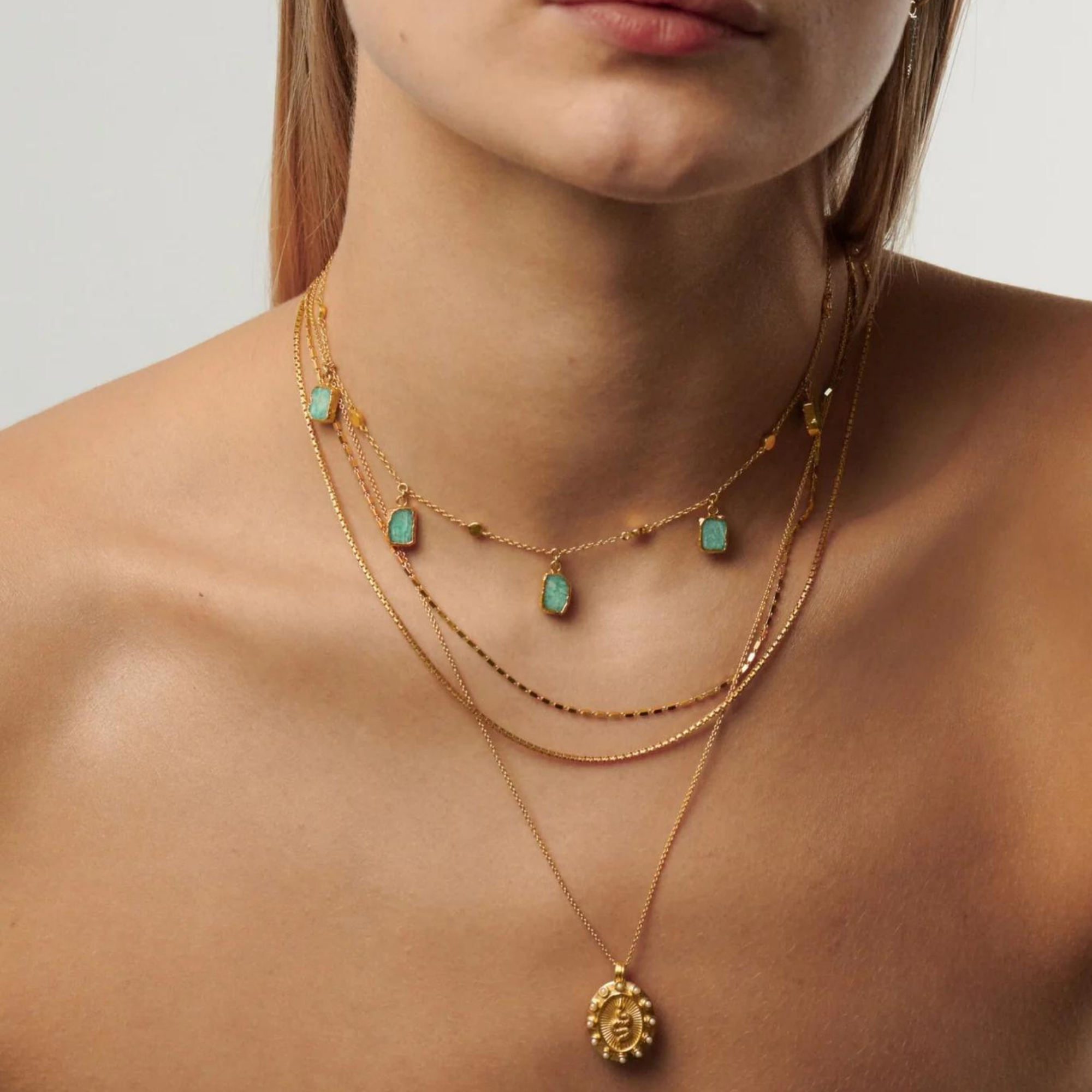 Our best selling Lena Charm Choker necklace features evenly spaced amazonite gemstones – known for healing – sitting on a delicate 18ct gold vermeil bobble chain. Layer with chain necklaces or pair with the lena charm necklace.