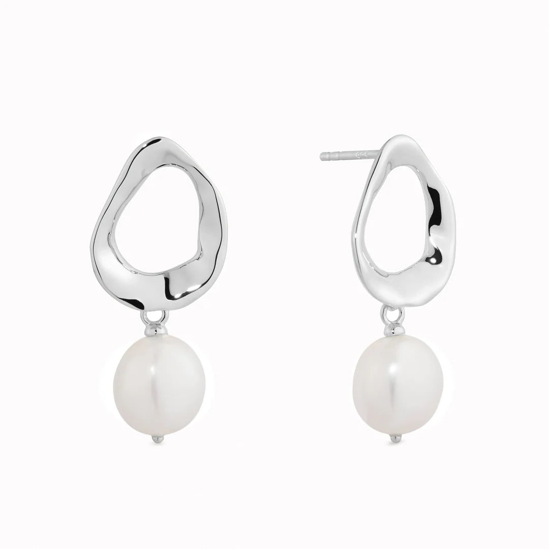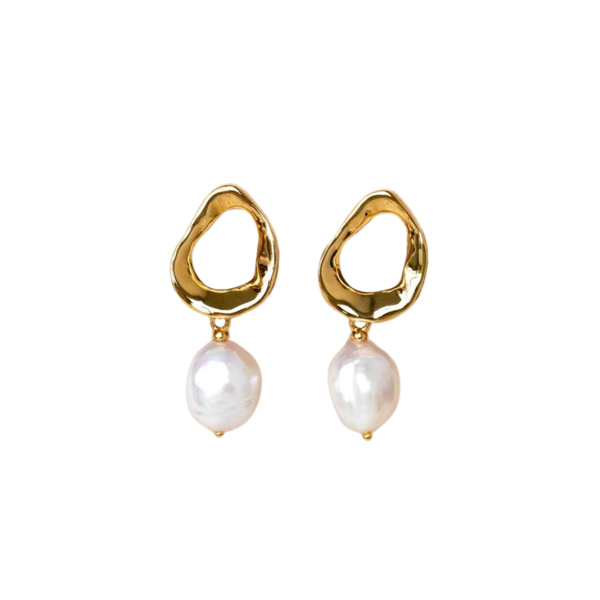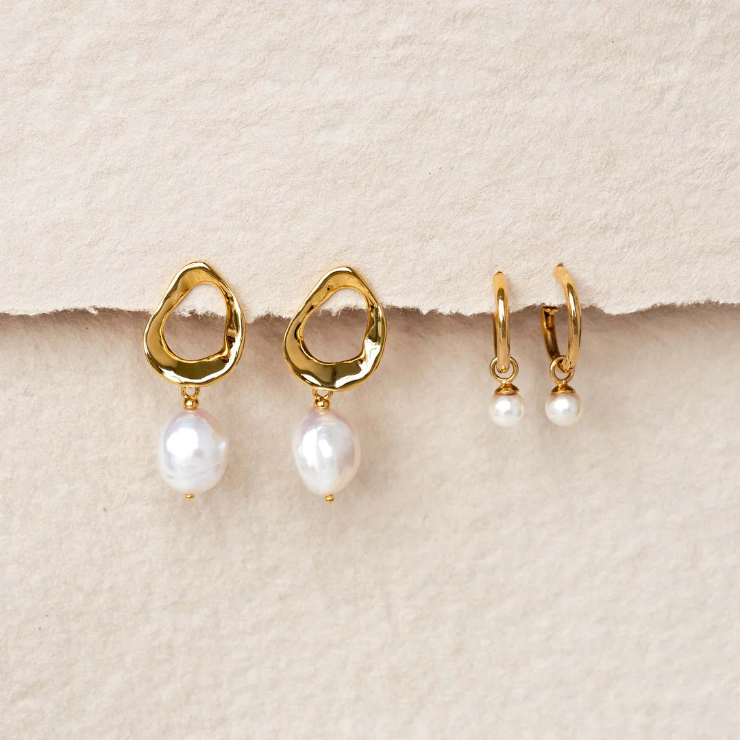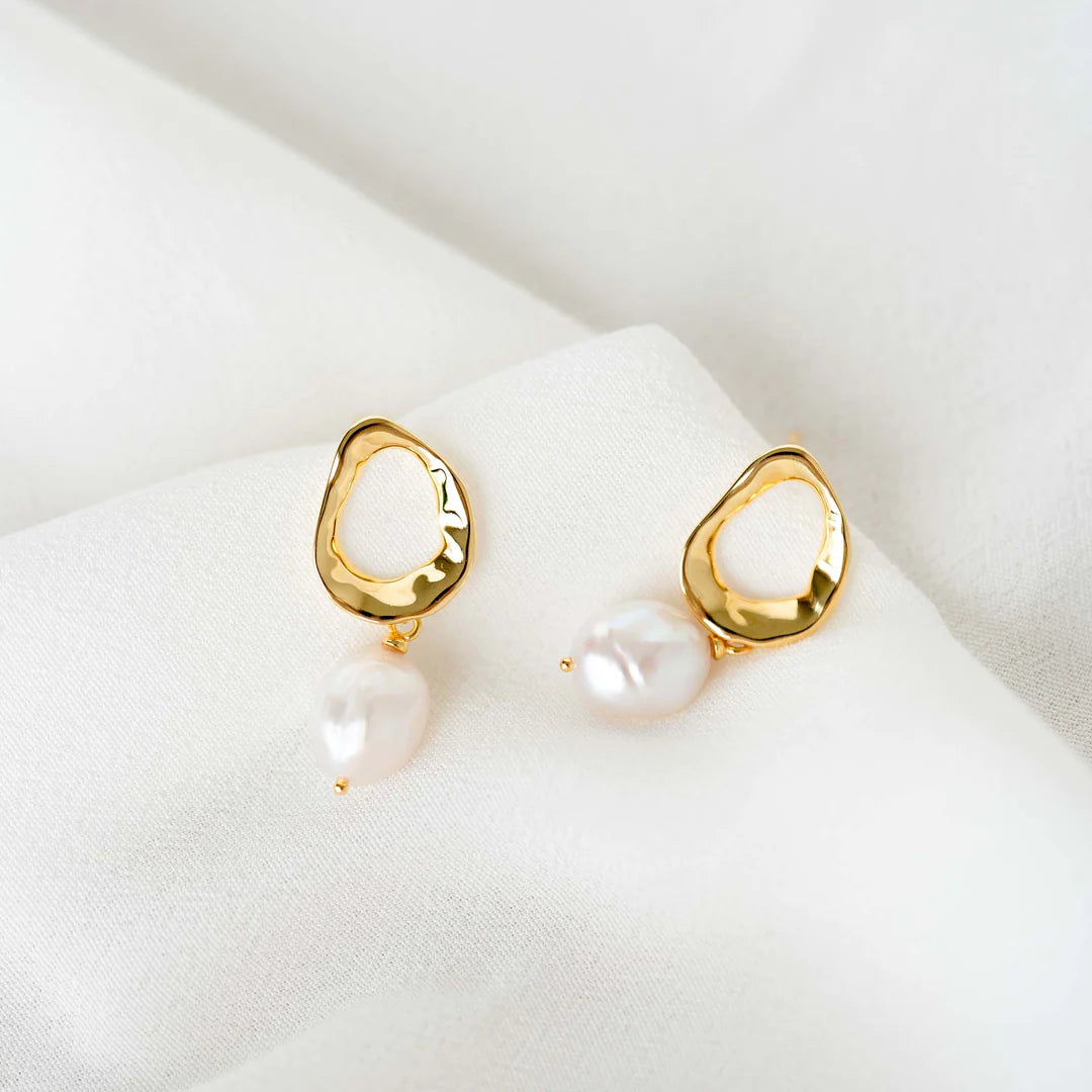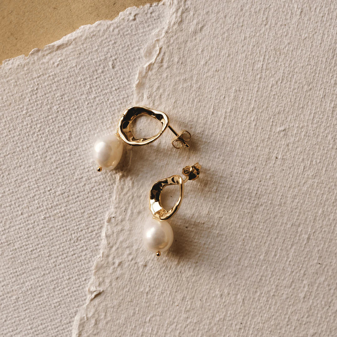 Pearl drop earrings featuring a baroque freshwater pearl paired with a hammered gold organic setting. Unique statement earrings create a look that's a little prep, a little bit art school.