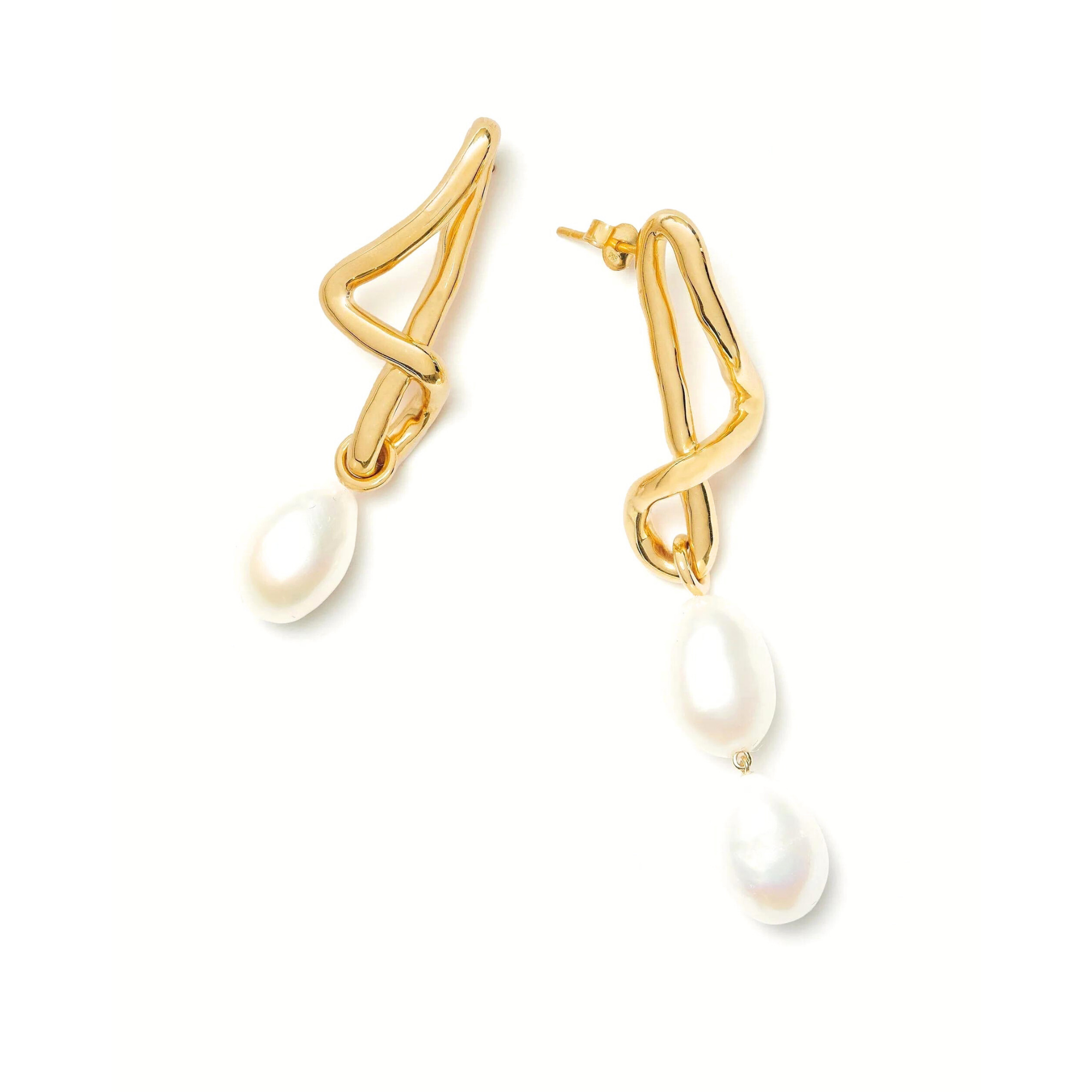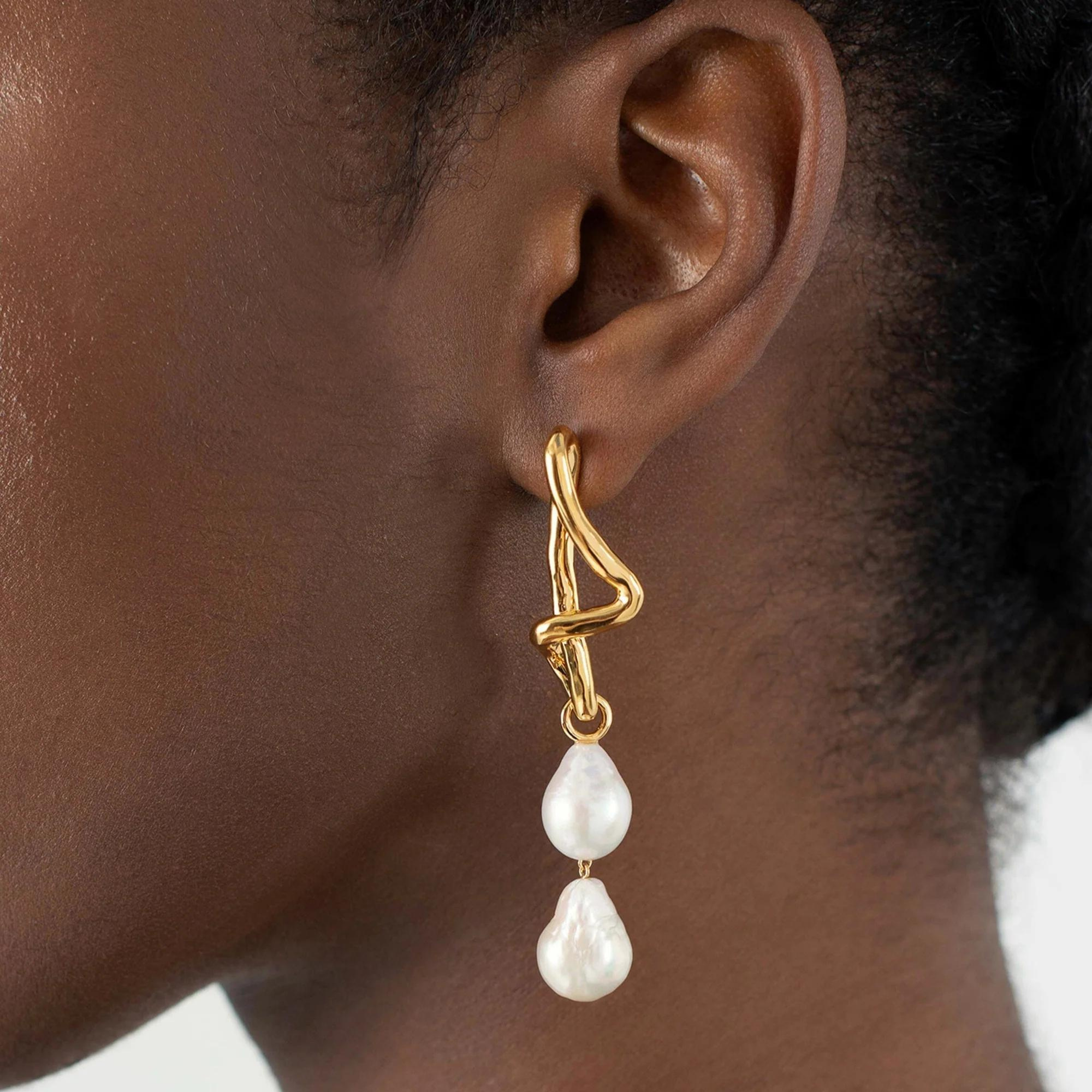 Iconic pearls for everyone. These asymmetric mismatched earrings feature an organic twist on our classic ovate hoop, with a single drop baroque pearl on one side and two on the other. A statement hoop inspired by music notes.