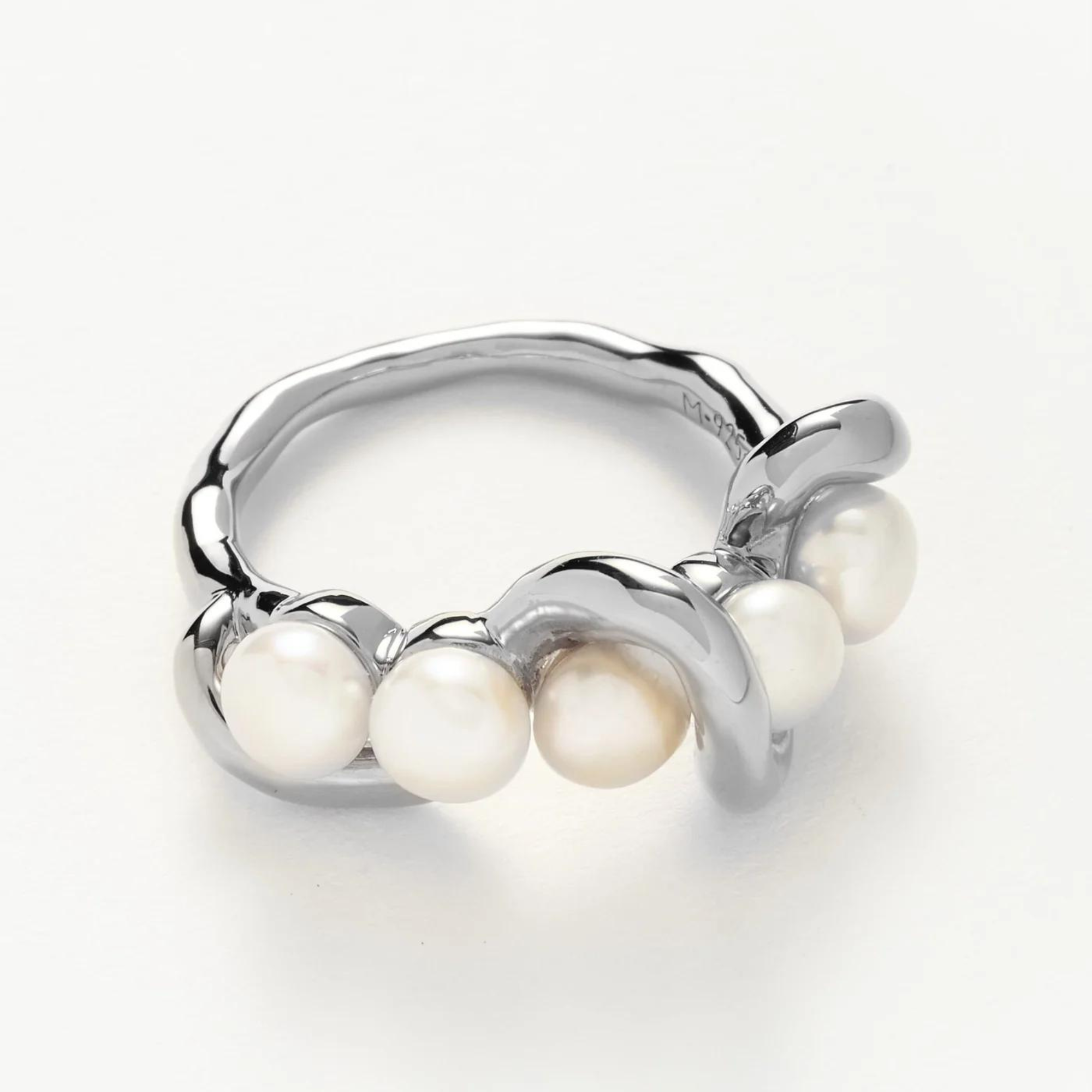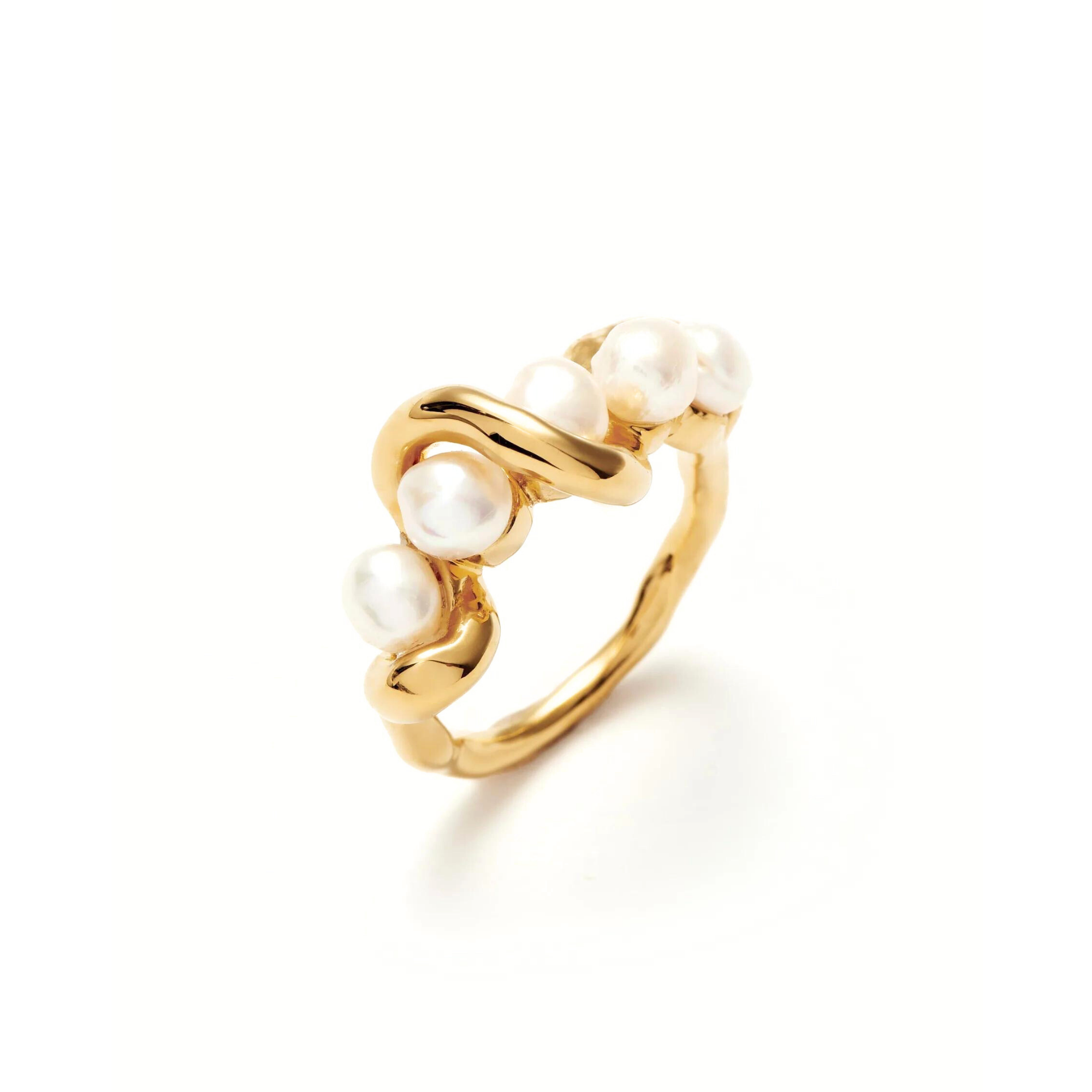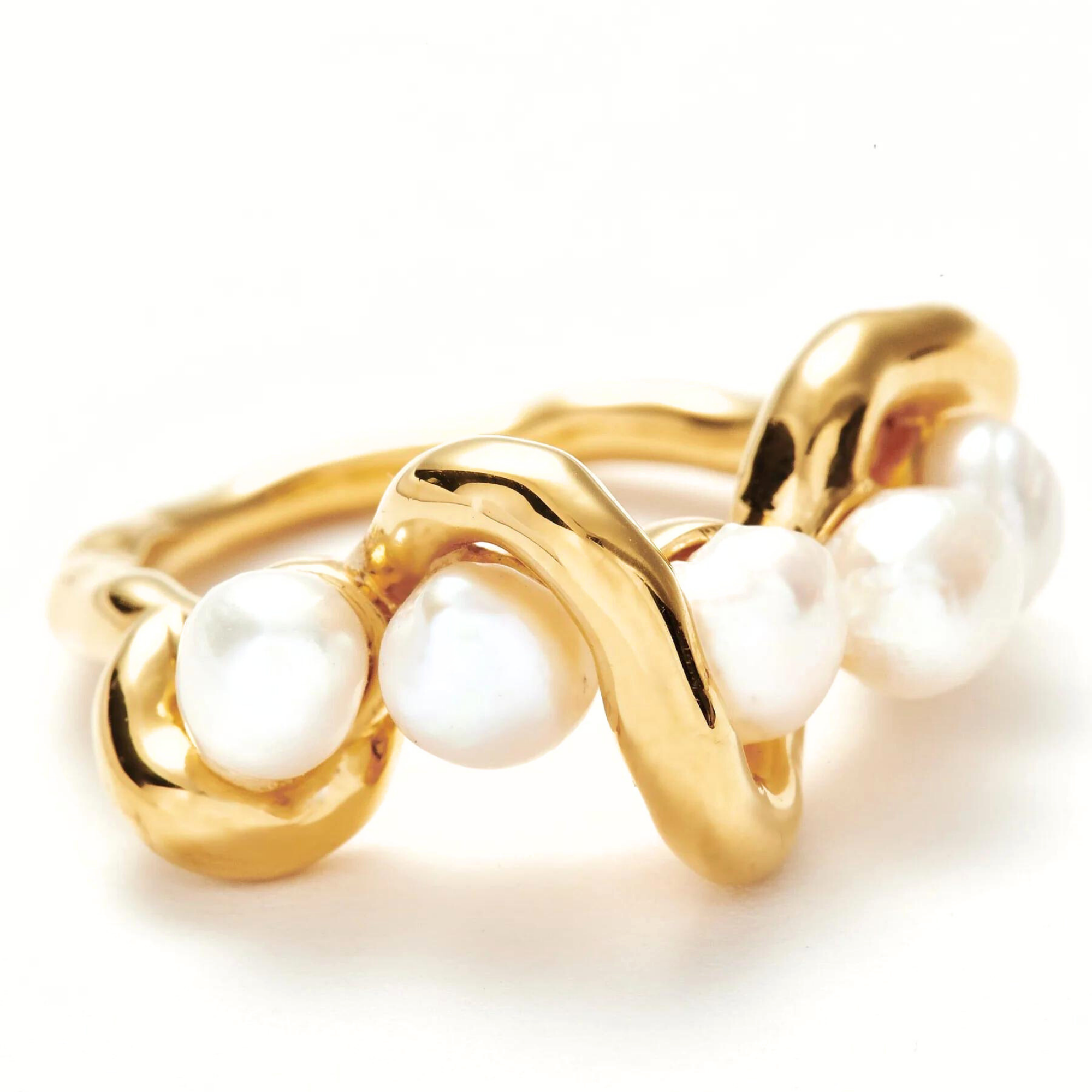 Iconic pearls for everyone. This pearl statement ring features a molten band twisted around beaded freshwater pearls, said to bring wisdom and knowledge. Style with other simple bands for a clashing ring stack.