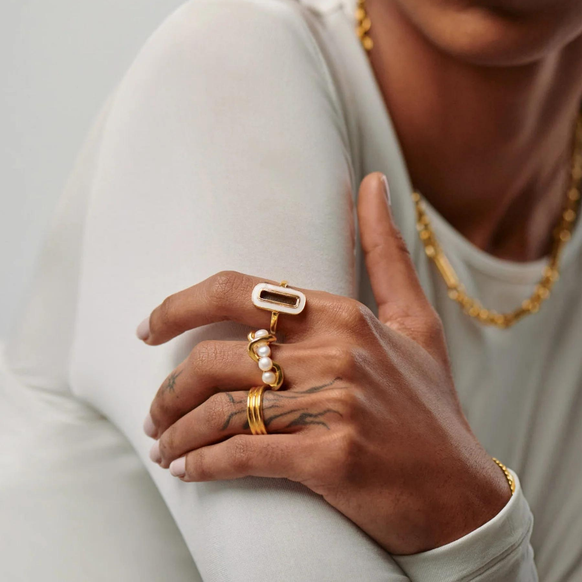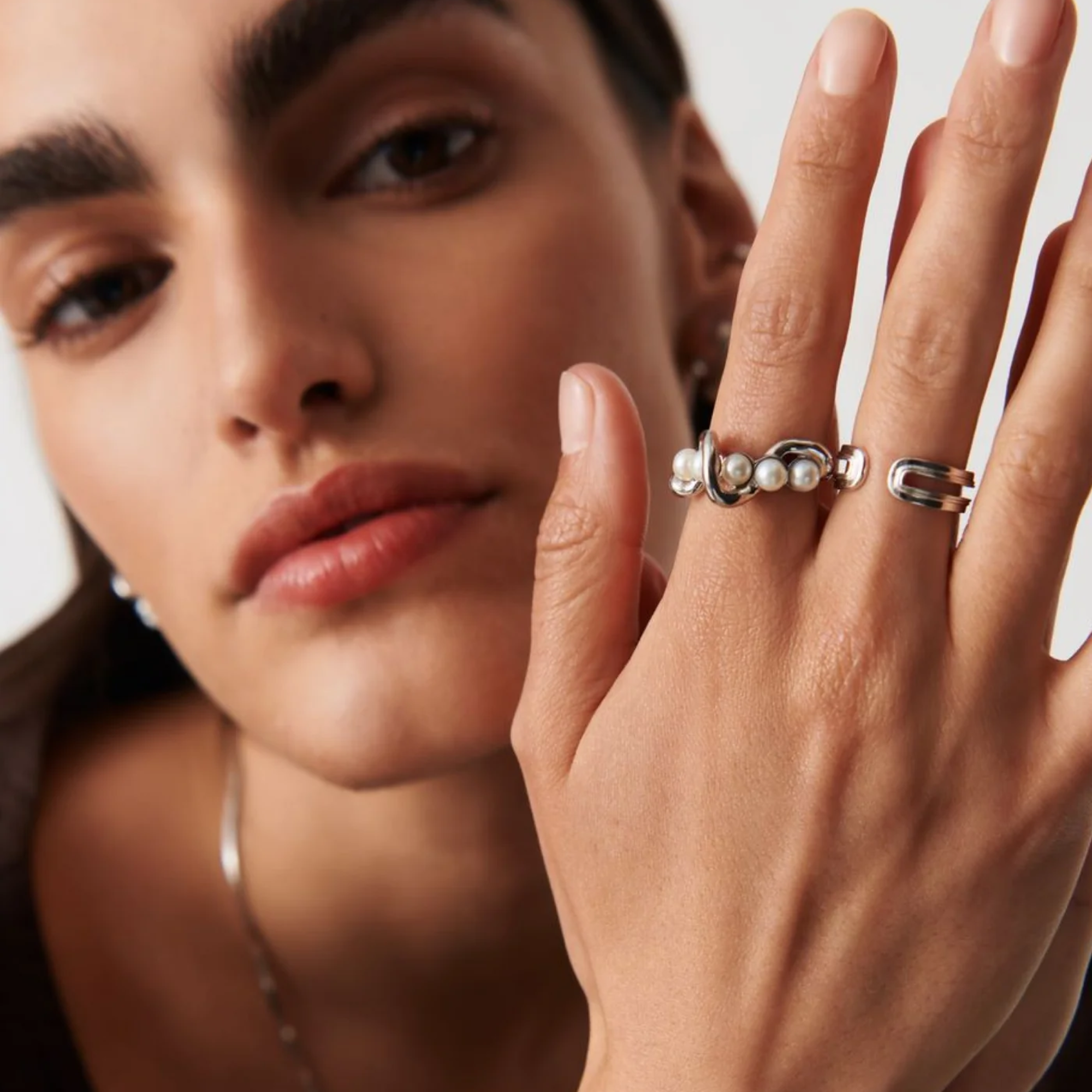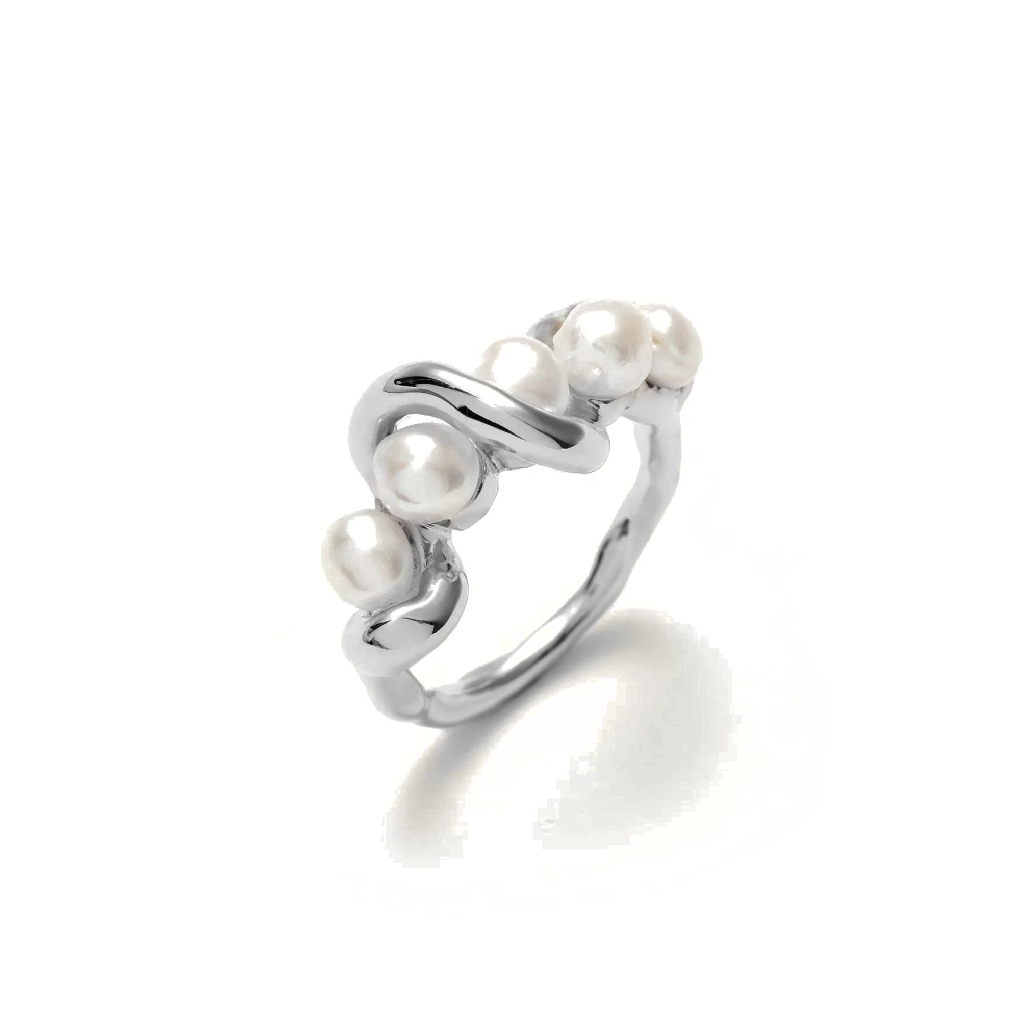 Iconic pearls for everyone. This pearl statement ring features a molten band twisted around beaded freshwater pearls, said to bring wisdom and knowledge. Style with other simple bands for a clashing ring stack.