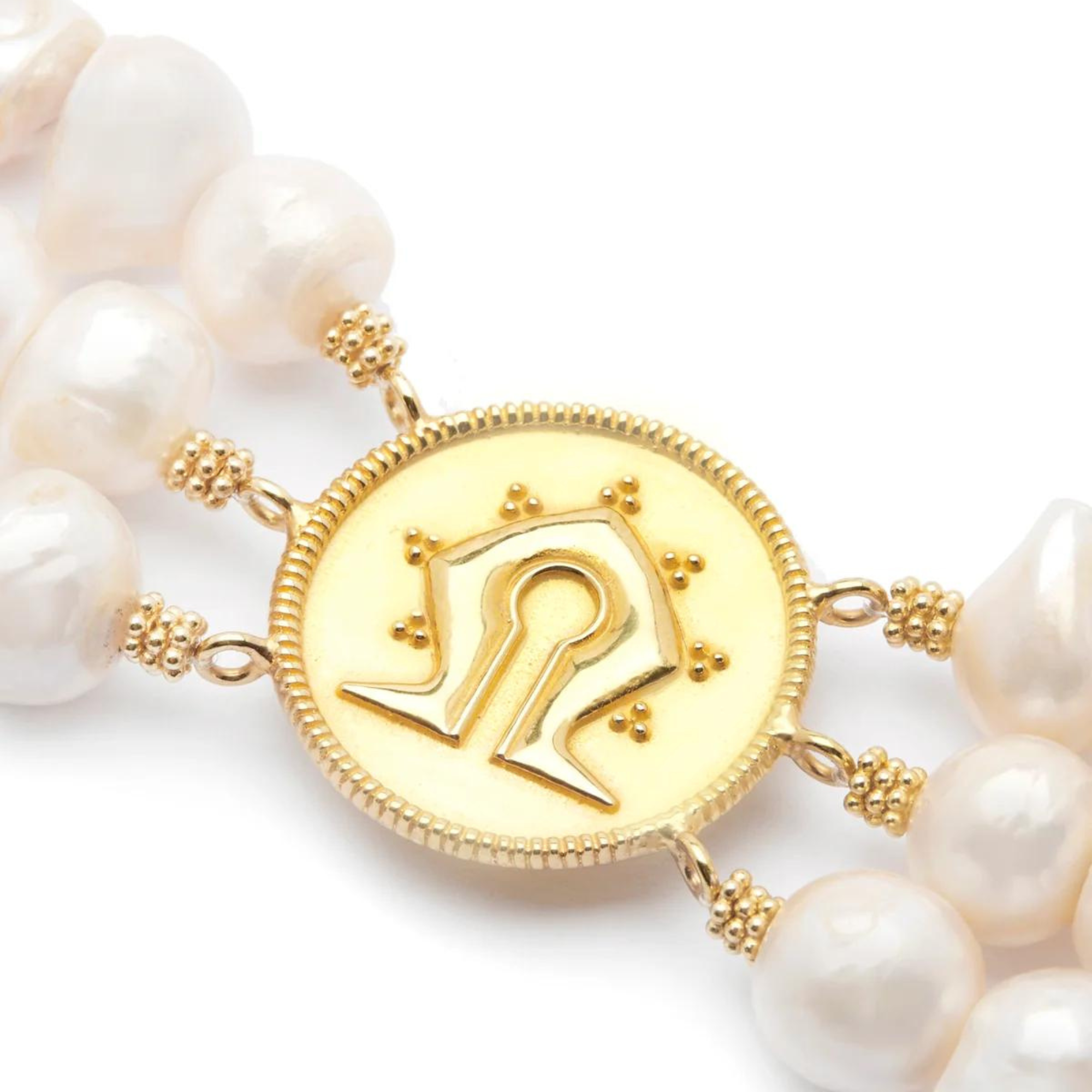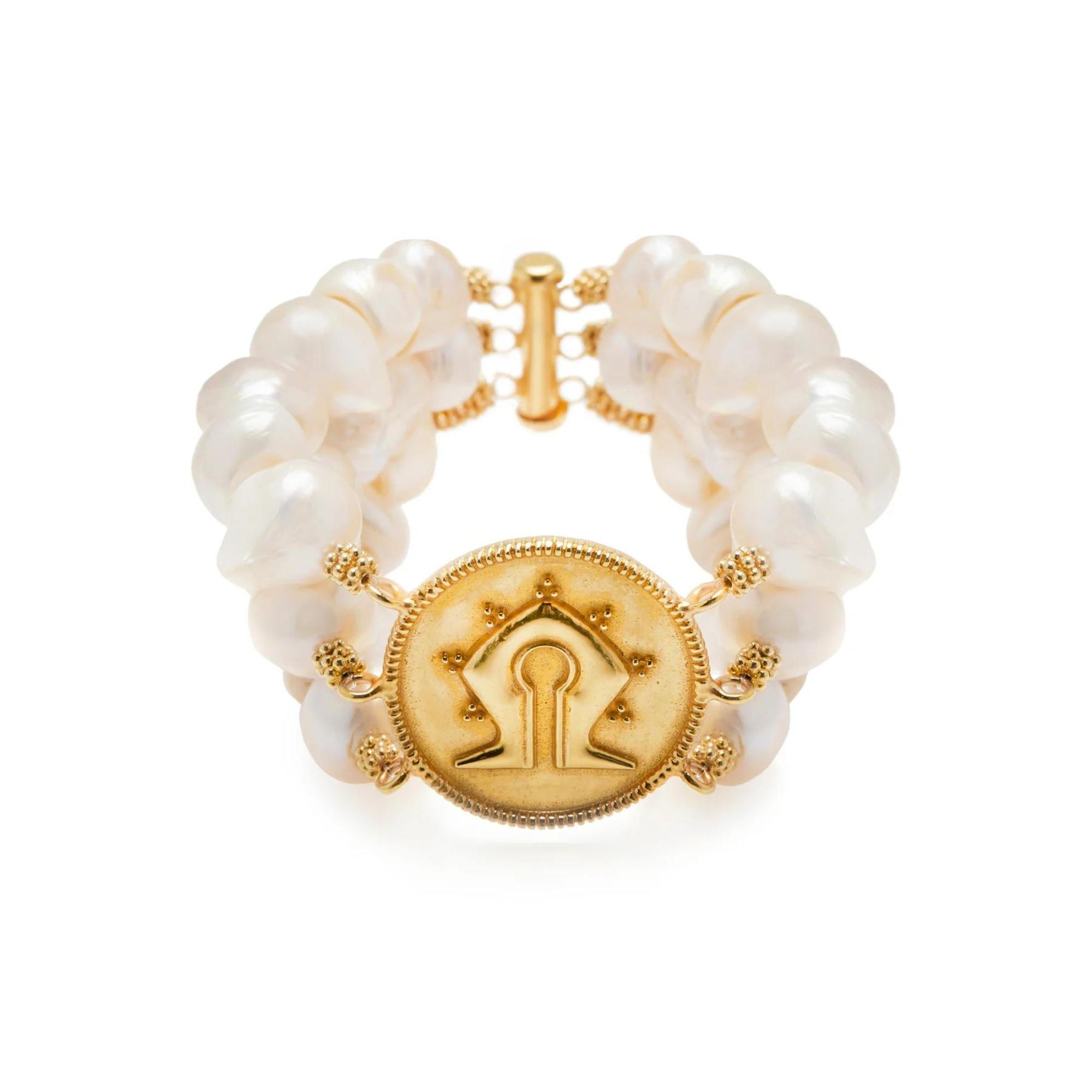 The monumental Triple Chunky Pearl Mamuli bracelet is hand-assembled in our Atelier with three rows of 1.5cm baroque rose fresh water pearls and a large 3cm Mamuli coin set in the center. The bracelet is made of recycled sterling silver with an 18ct gold plating.