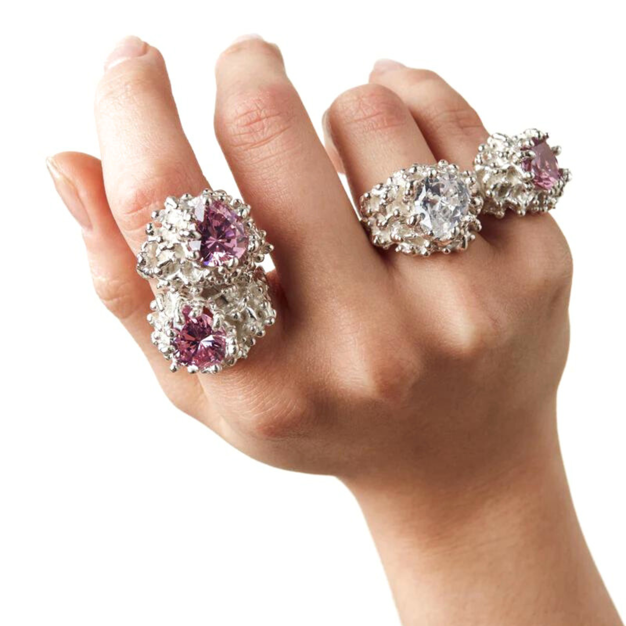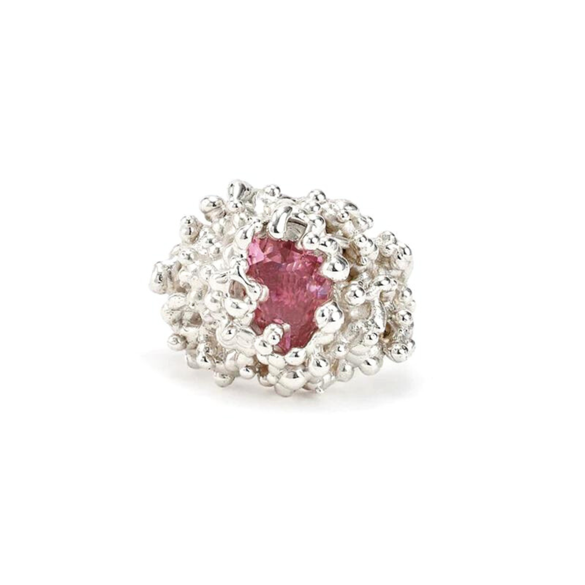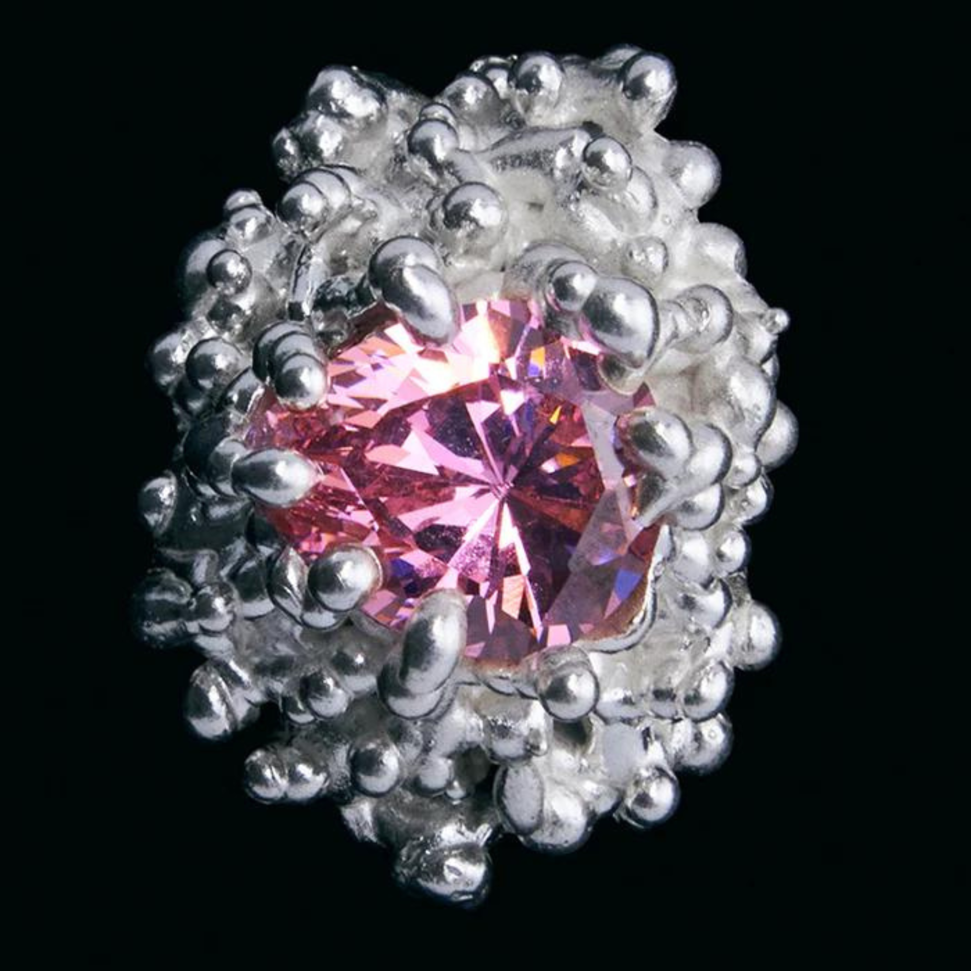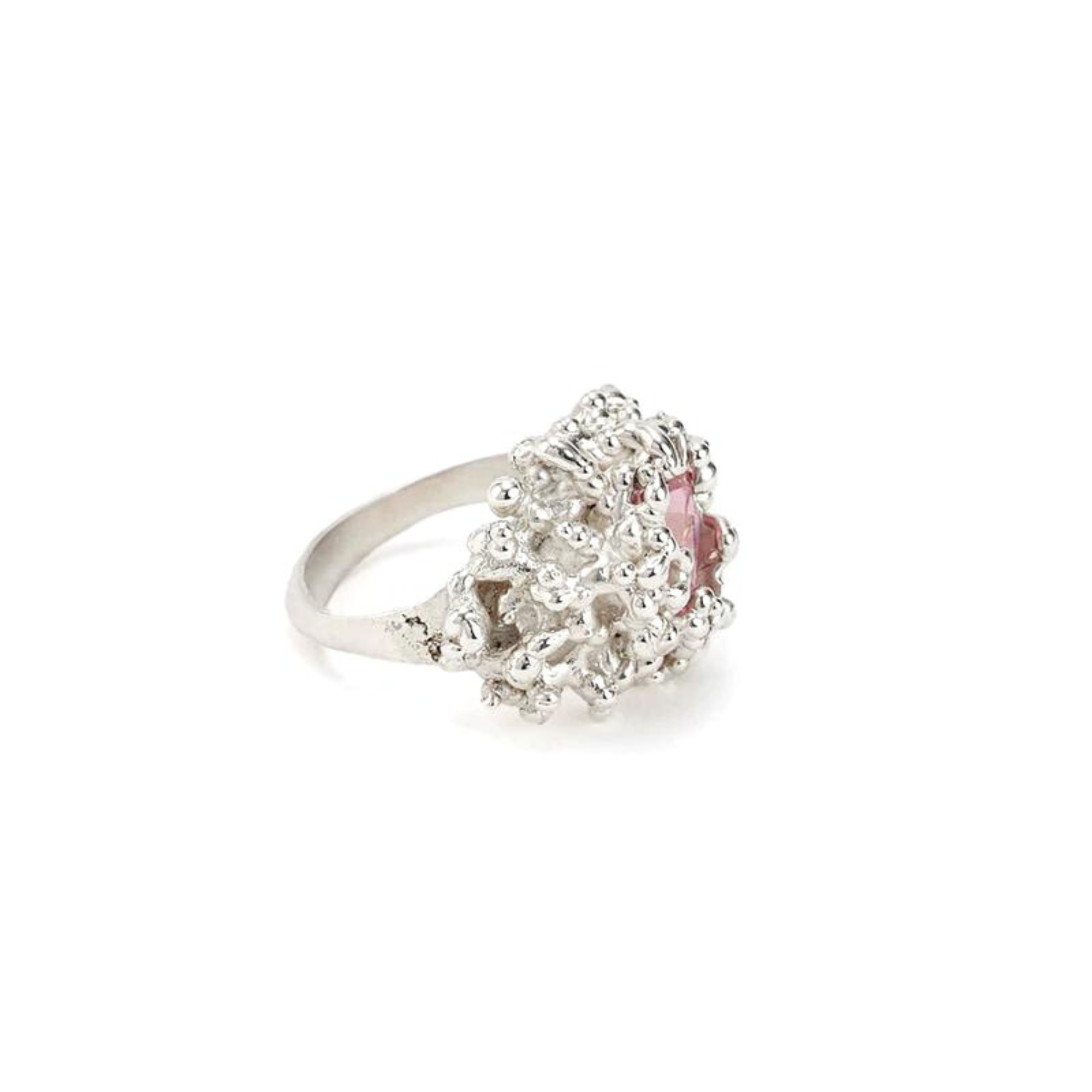 Silver Signet ring with pink zircon, organic shape with voluminous little spheres around the zircon.