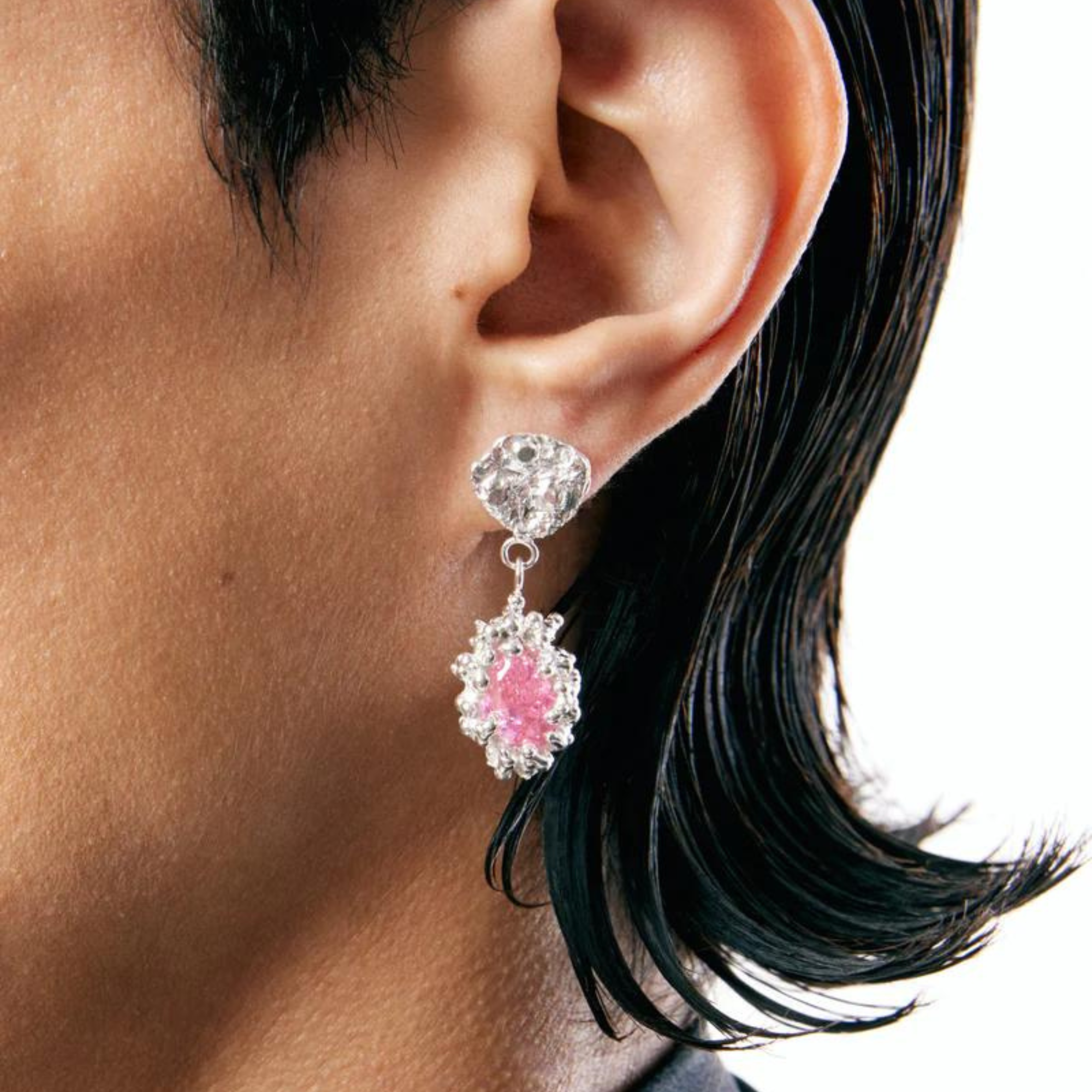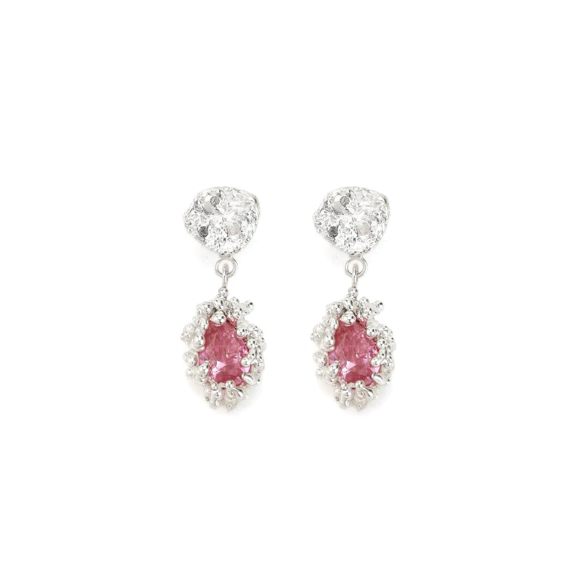 Silver earrings with pendant pink zircon wraped by little spots. Butterfly fastening