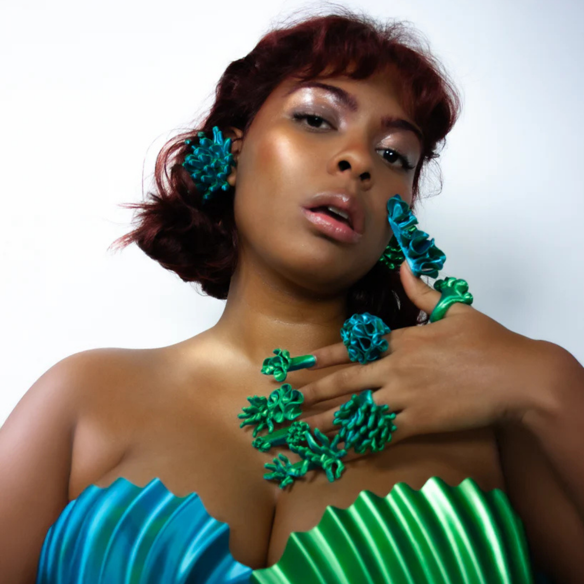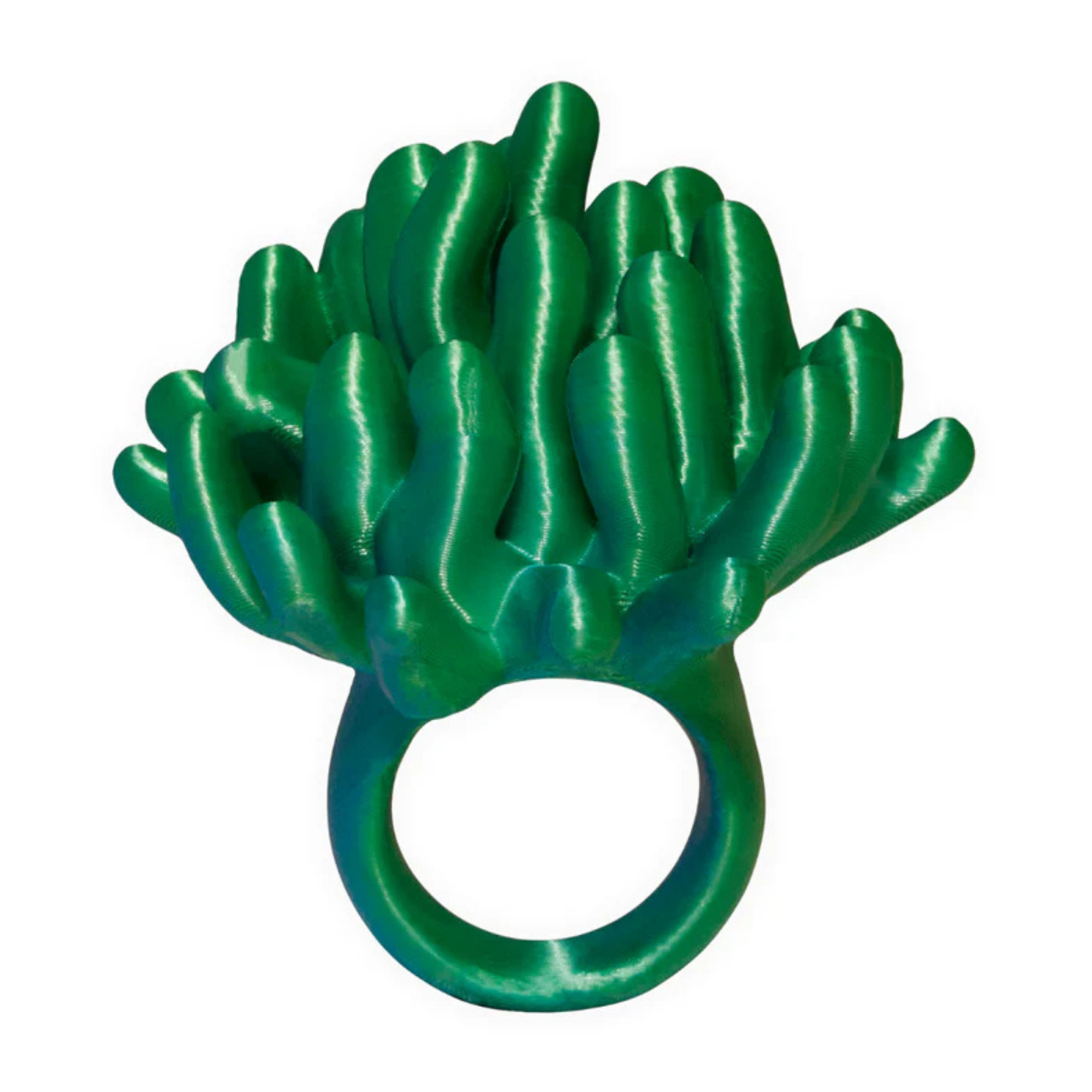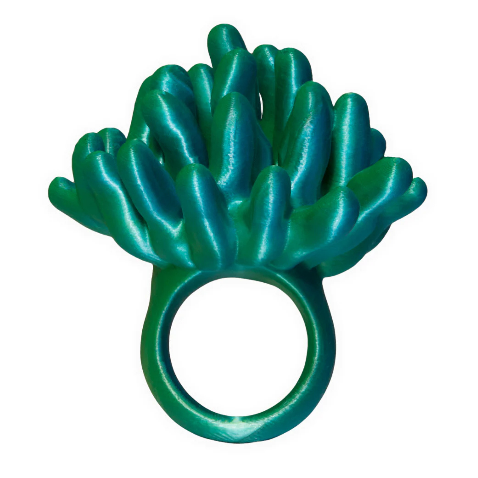 Dive into elegance with the Anemone 3D Printed Ring. Expertly crafted using innovative 3D printing technology, this coral-inspired ring features a captivating two-toned blue and green hue that shimmers and shifts with every movement. This radiant design showcases a spiky texture inspired by the raw, untamed beauty of sea anemones, seamlessly blending nature and artistry into a striking statement piece.