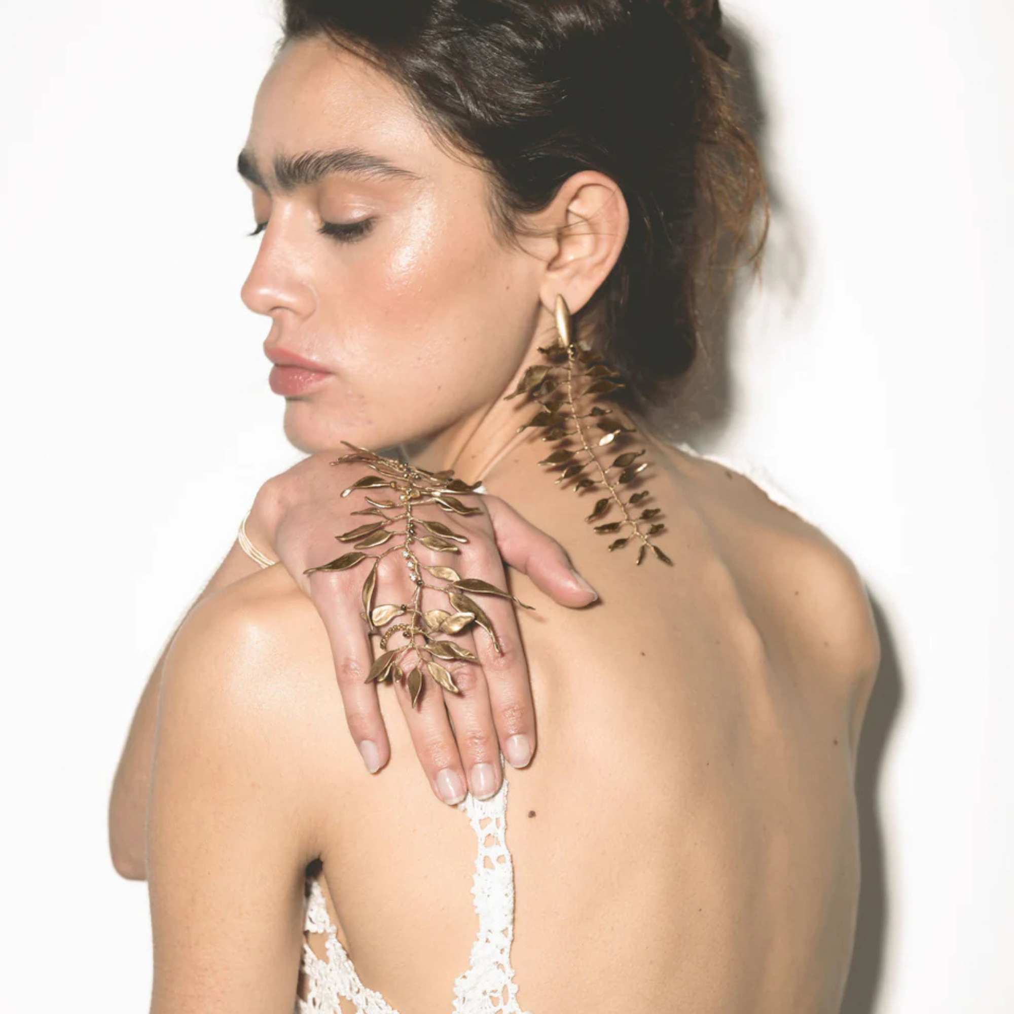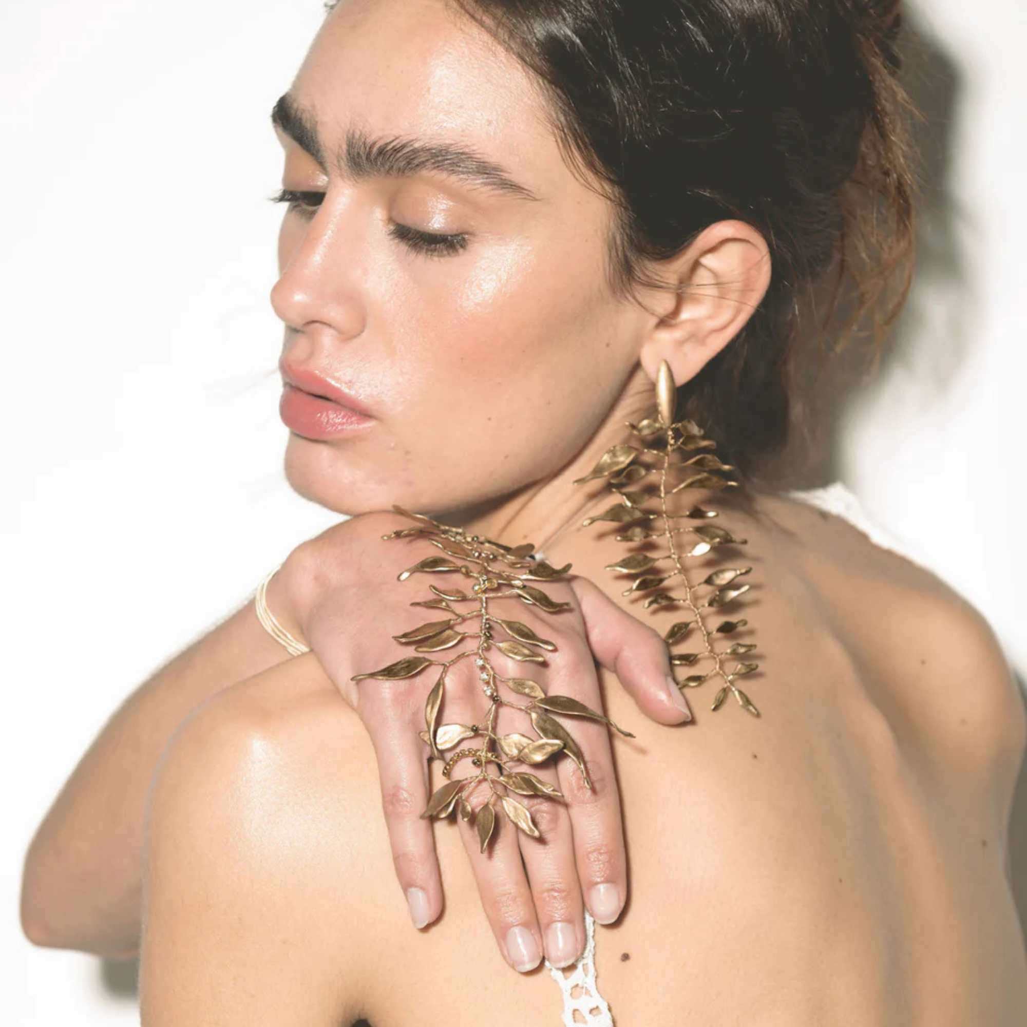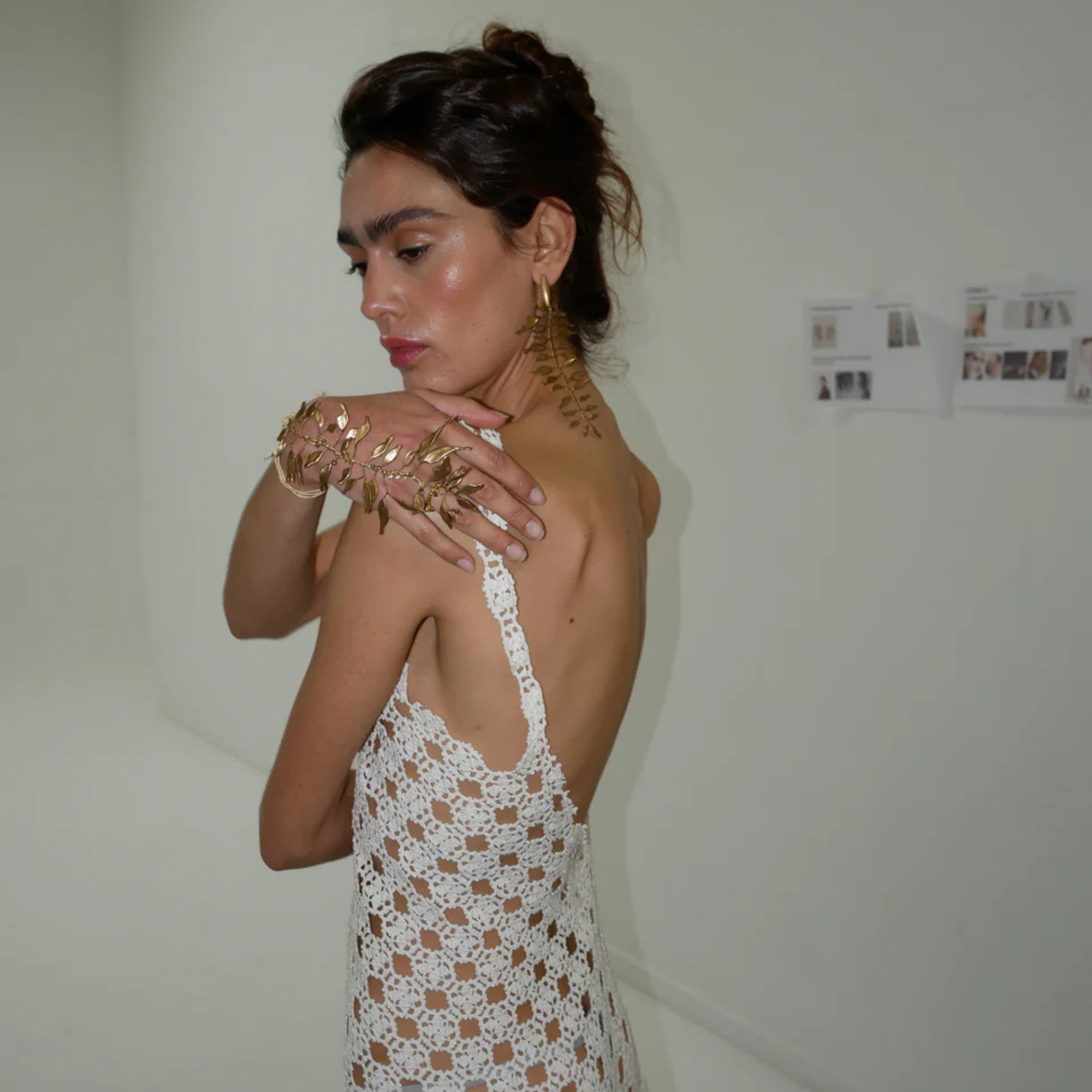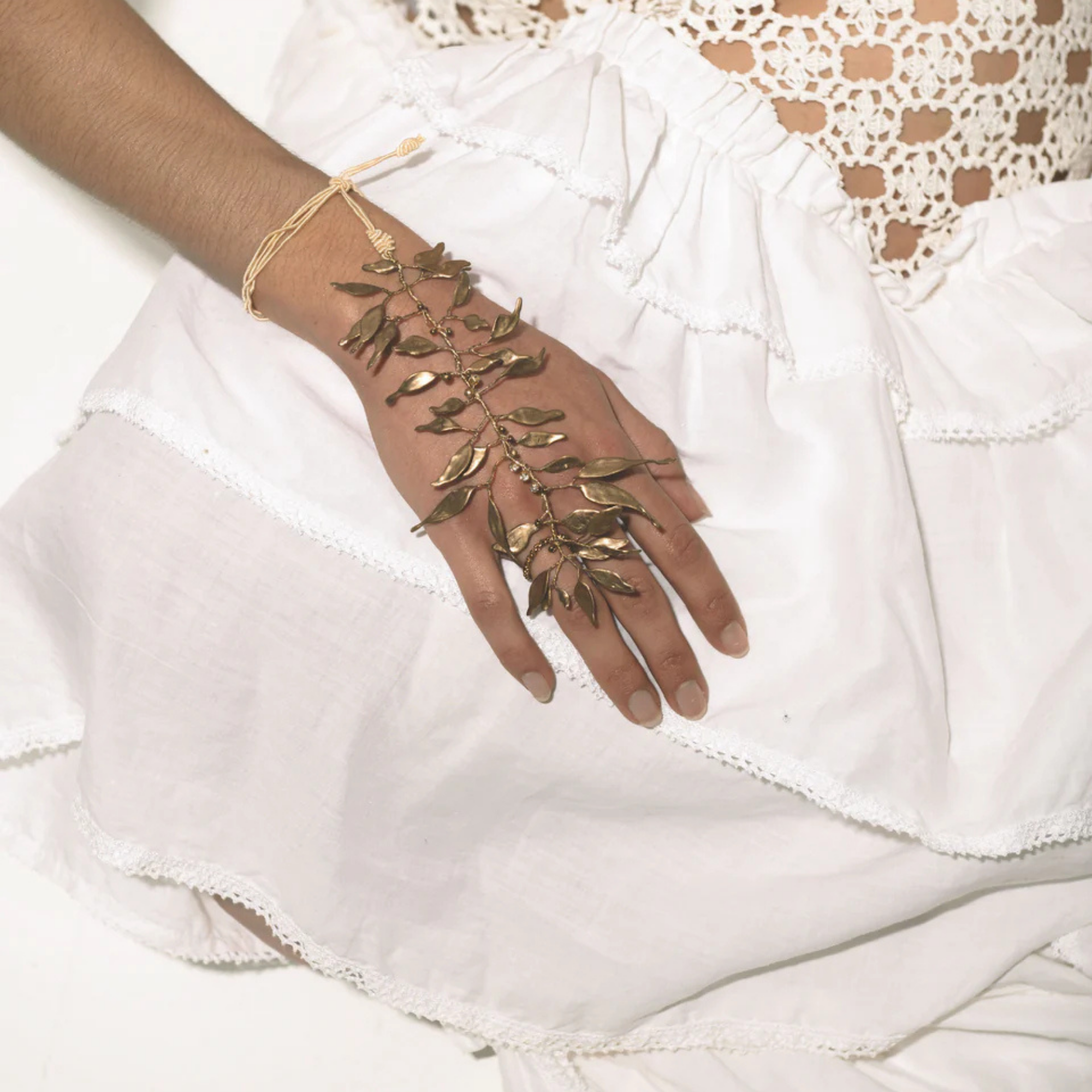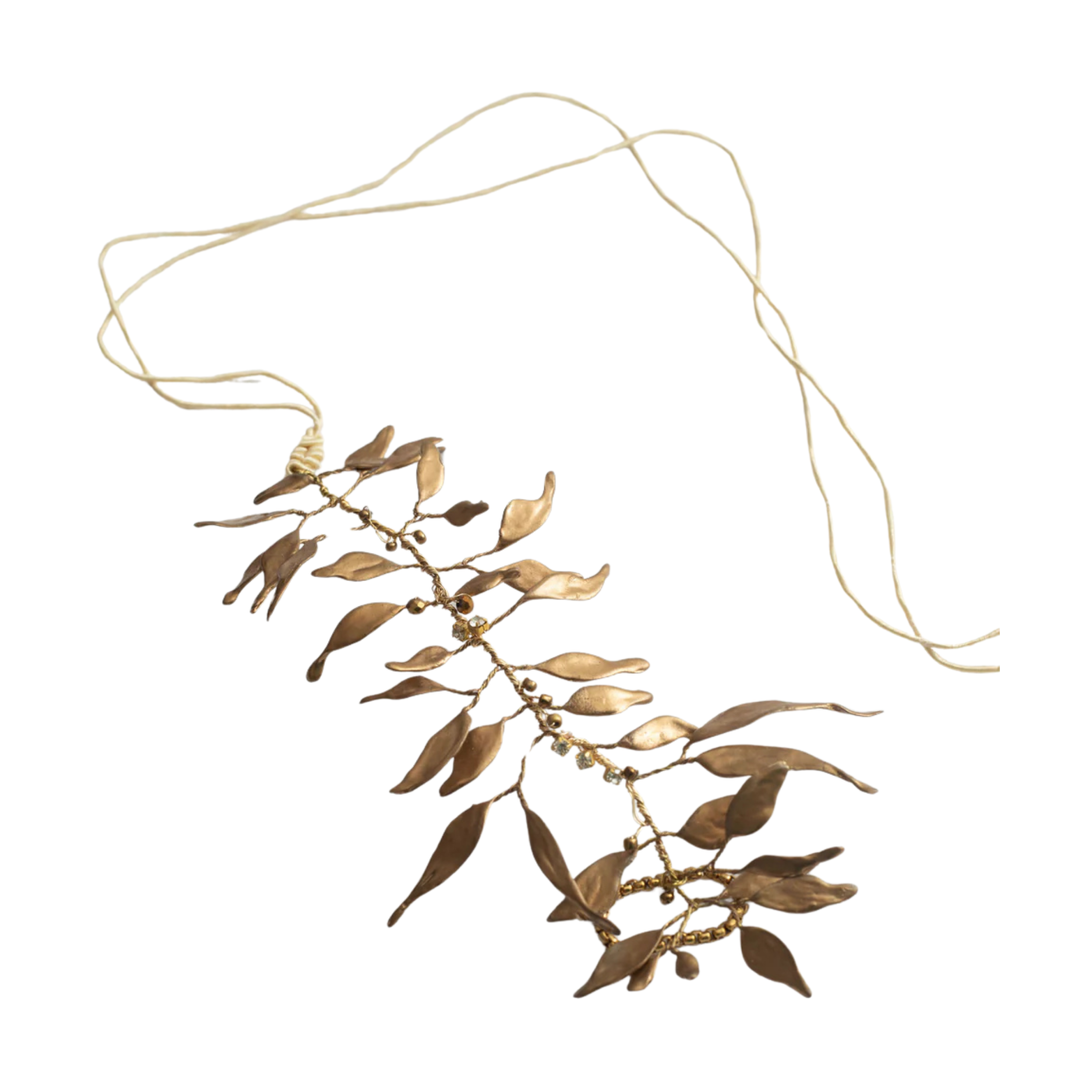 Materials: Alpaca thread in gold-plated brass and copper. Infinite layers created through a meticulous process of overlaying varnishes. Thread closure composed of 67% cotton and 33% rayon. Details with carefully selected Czech crystals, rhinestones, and beads.