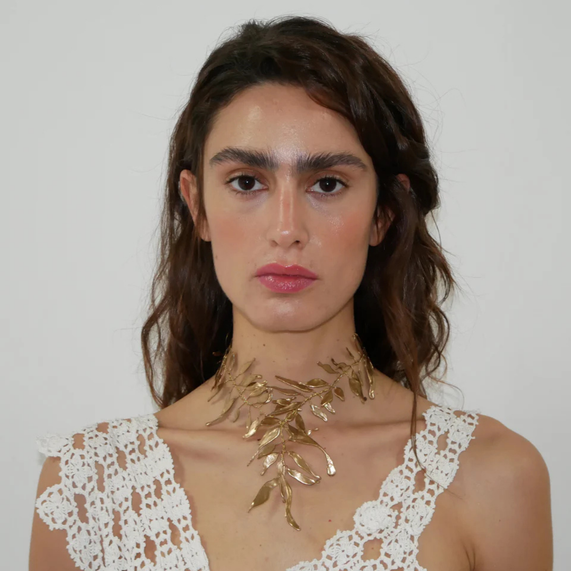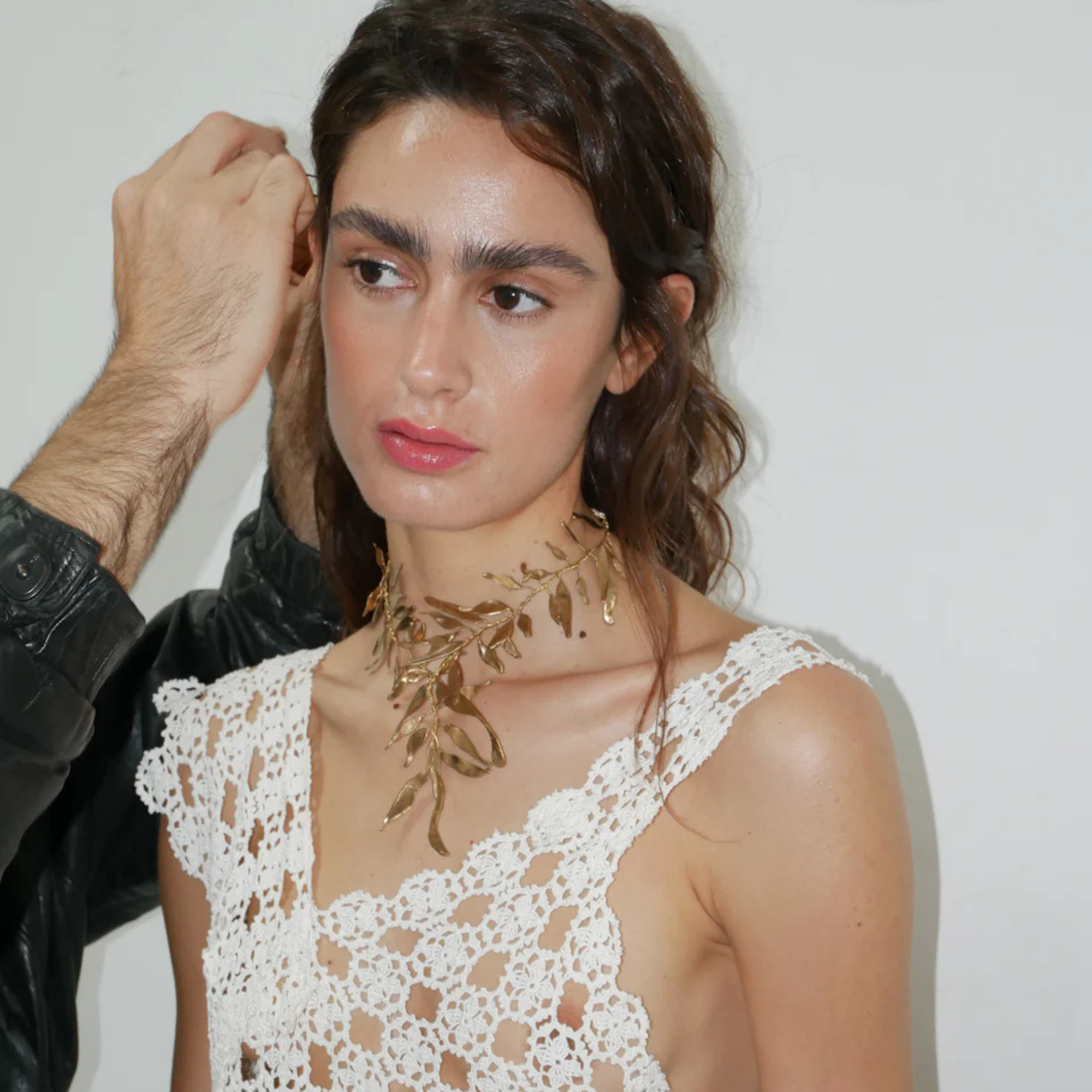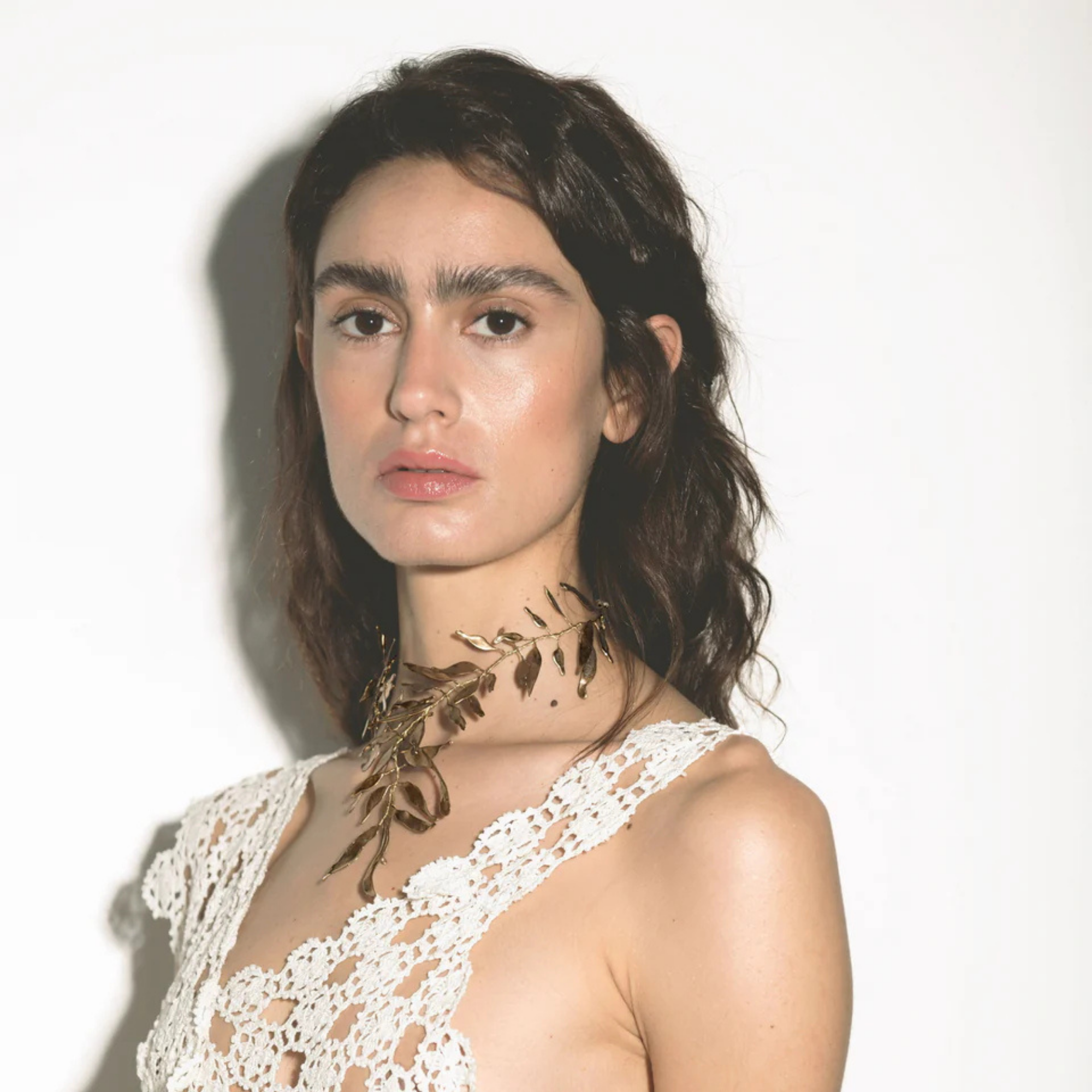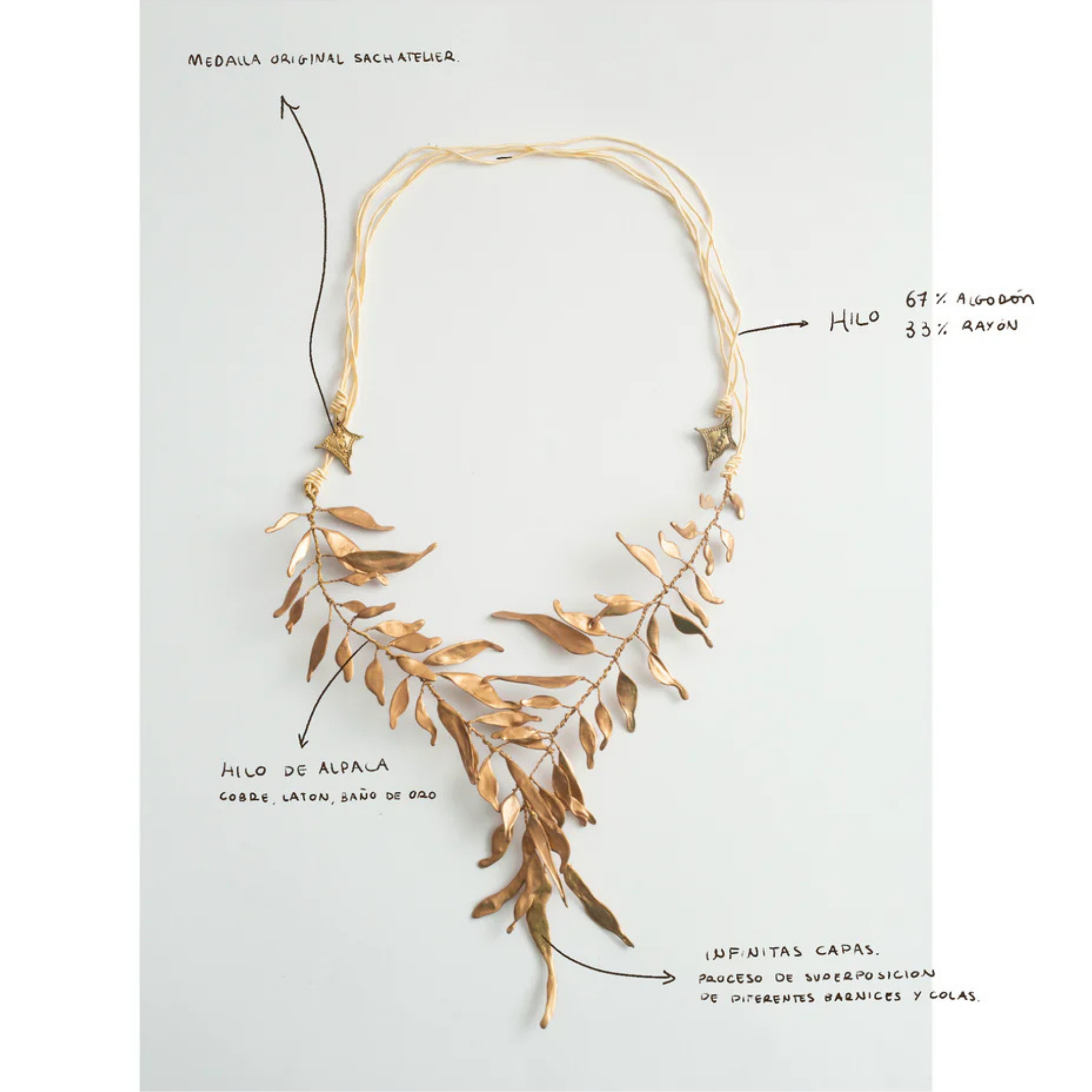 Materials: Alpaca thread in gold-plated brass and copper. Infinite layers created through a meticulous process of overlaying varnishes. Thread closure composed of 67% cotton and 33% rayon. Details with carefully selected Czech crystals, rhinestones, and beads.