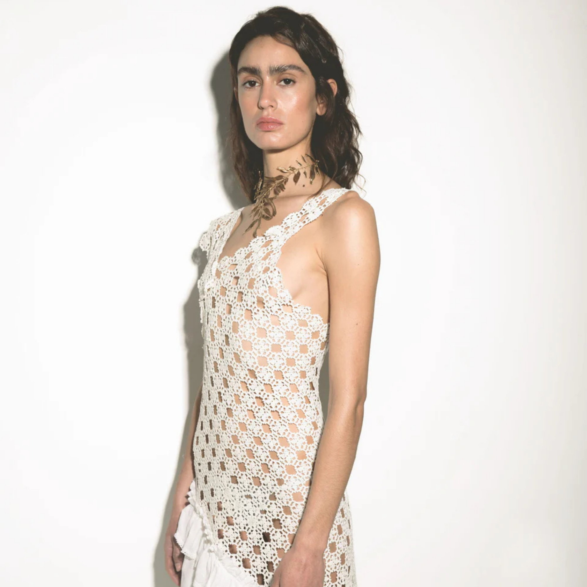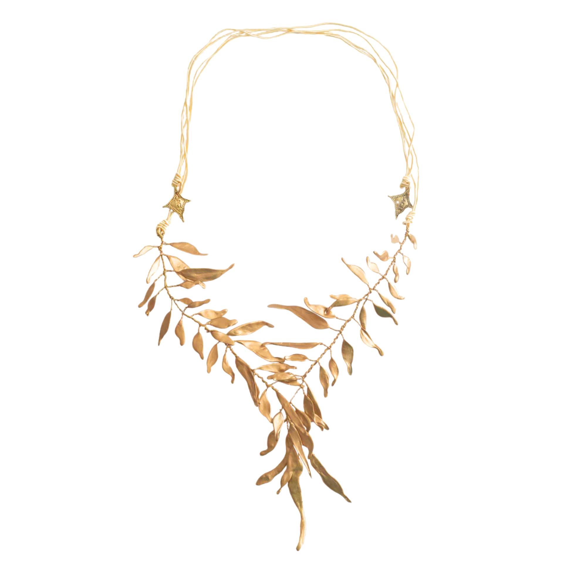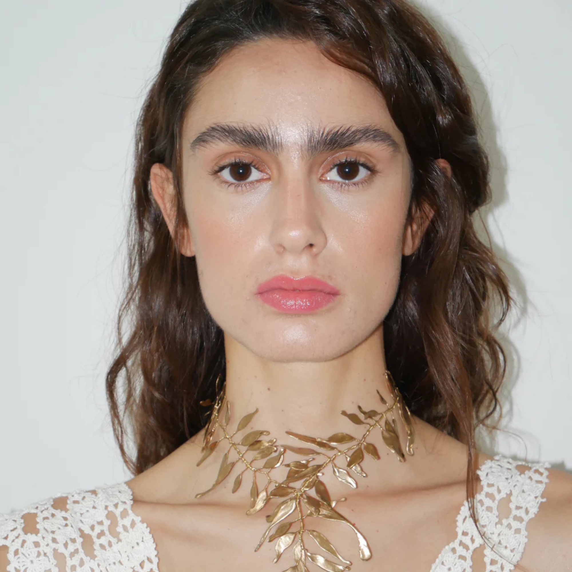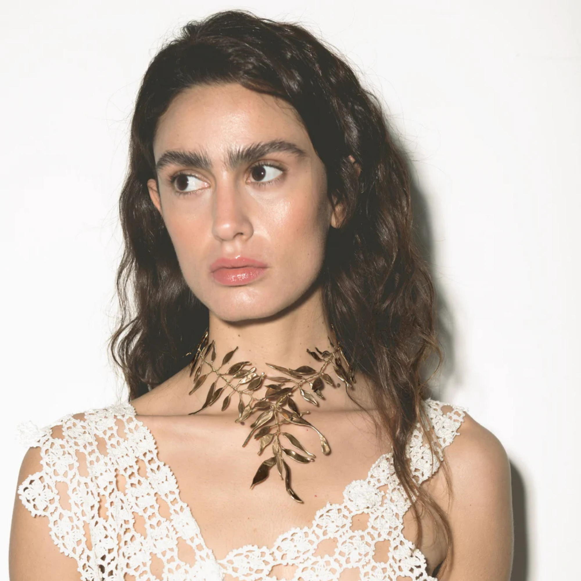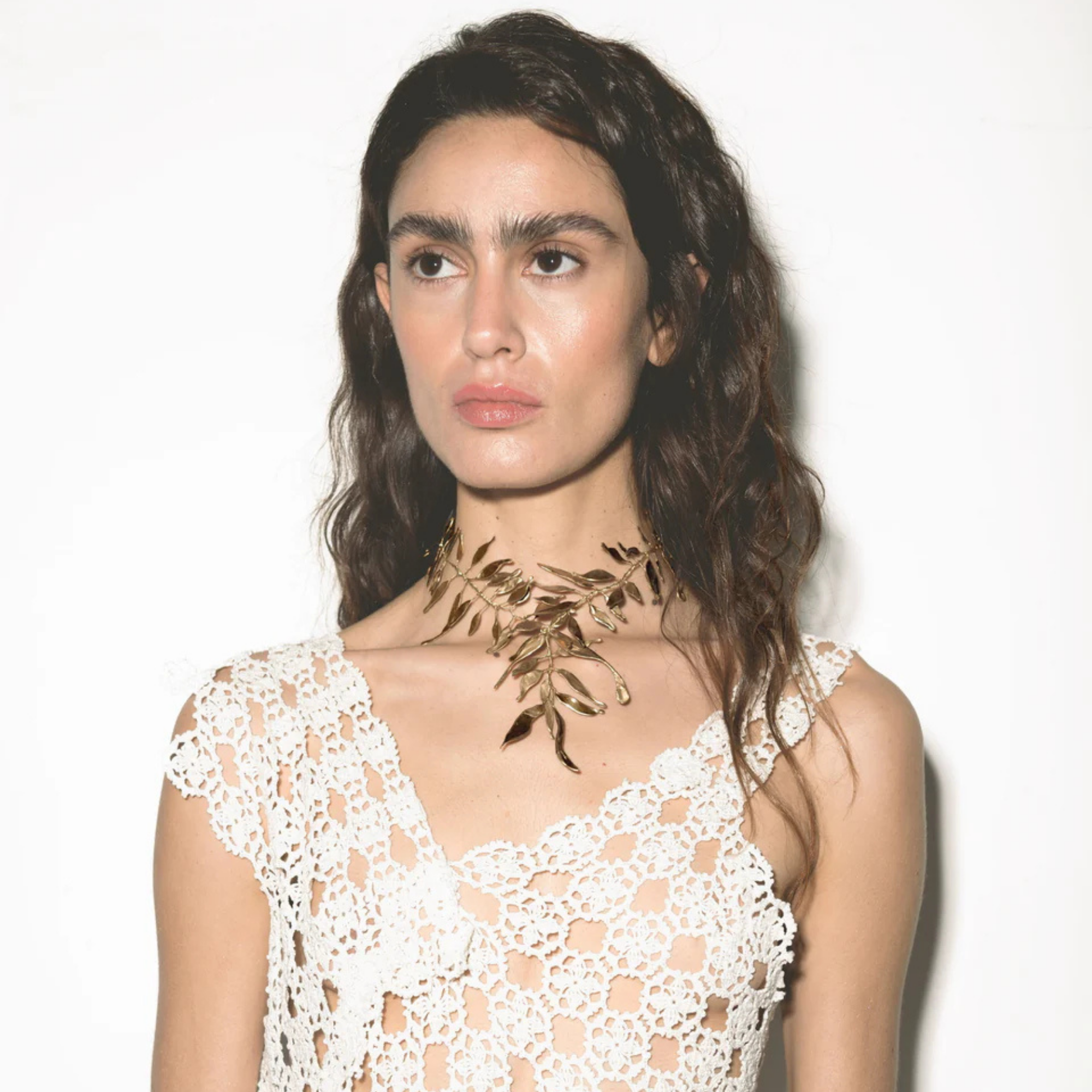 Materials: Alpaca thread in gold-plated brass and copper. Infinite layers created through a meticulous process of overlaying varnishes. Thread closure composed of 67% cotton and 33% rayon. Details with carefully selected Czech crystals, rhinestones, and beads.