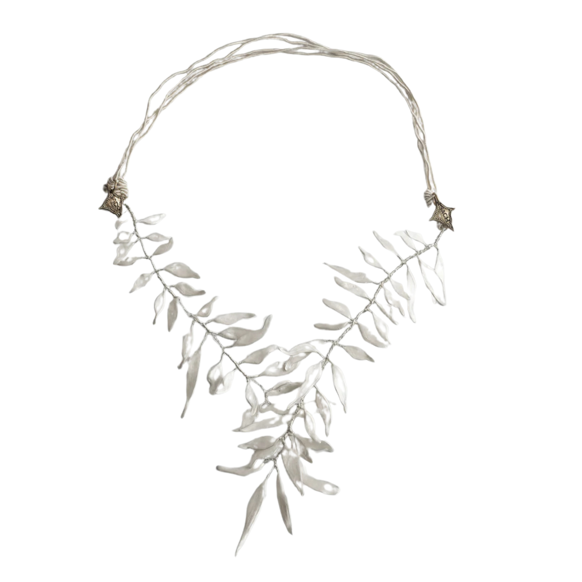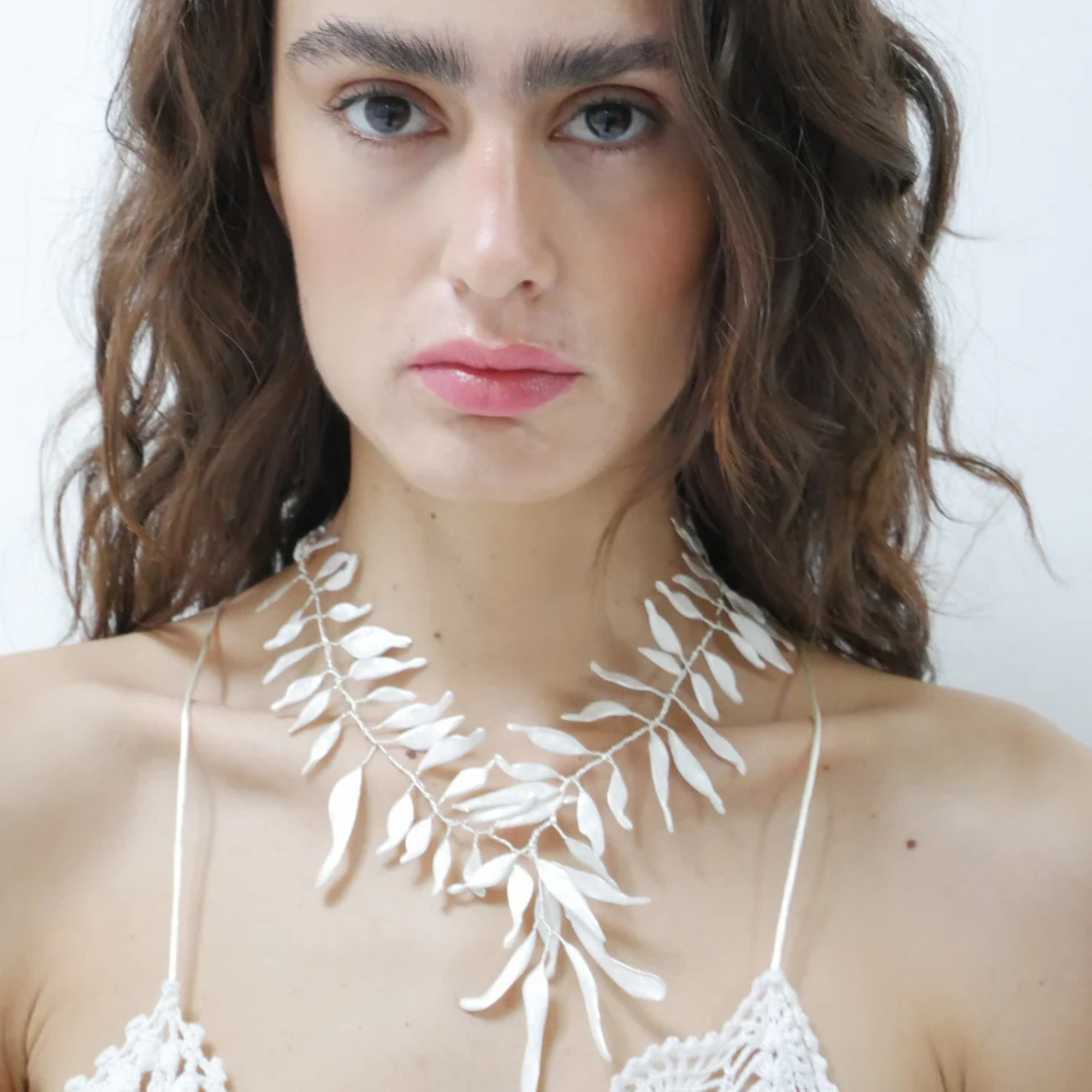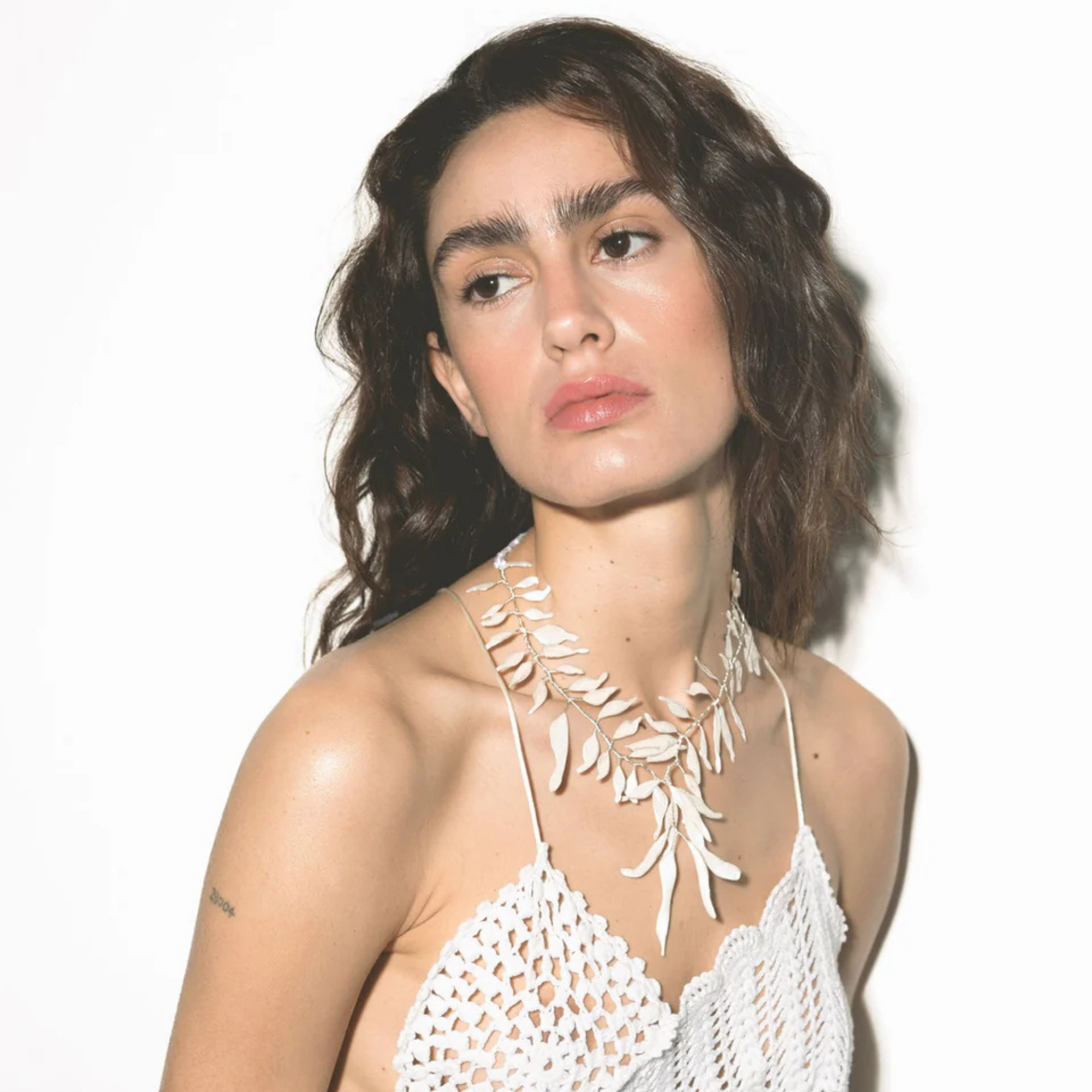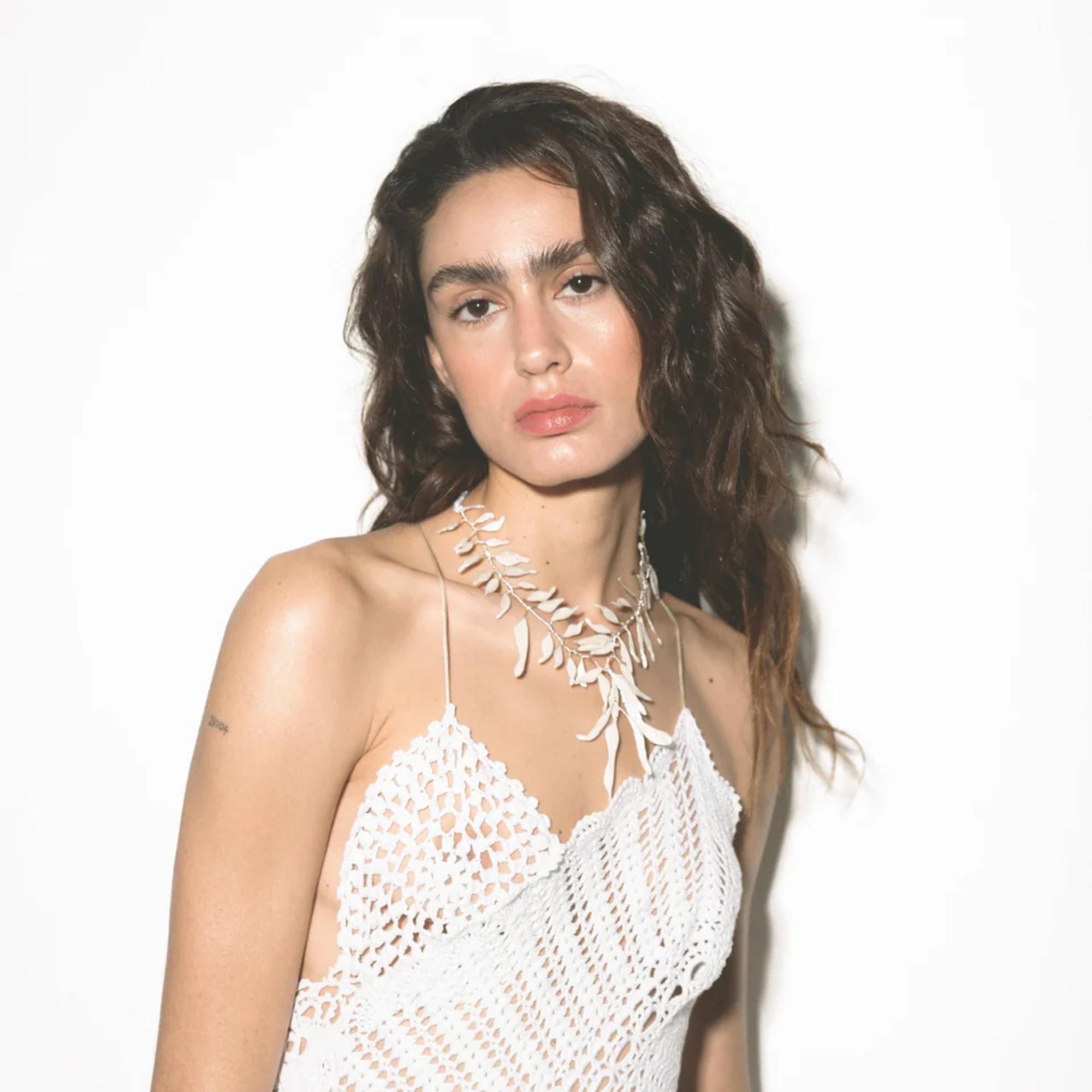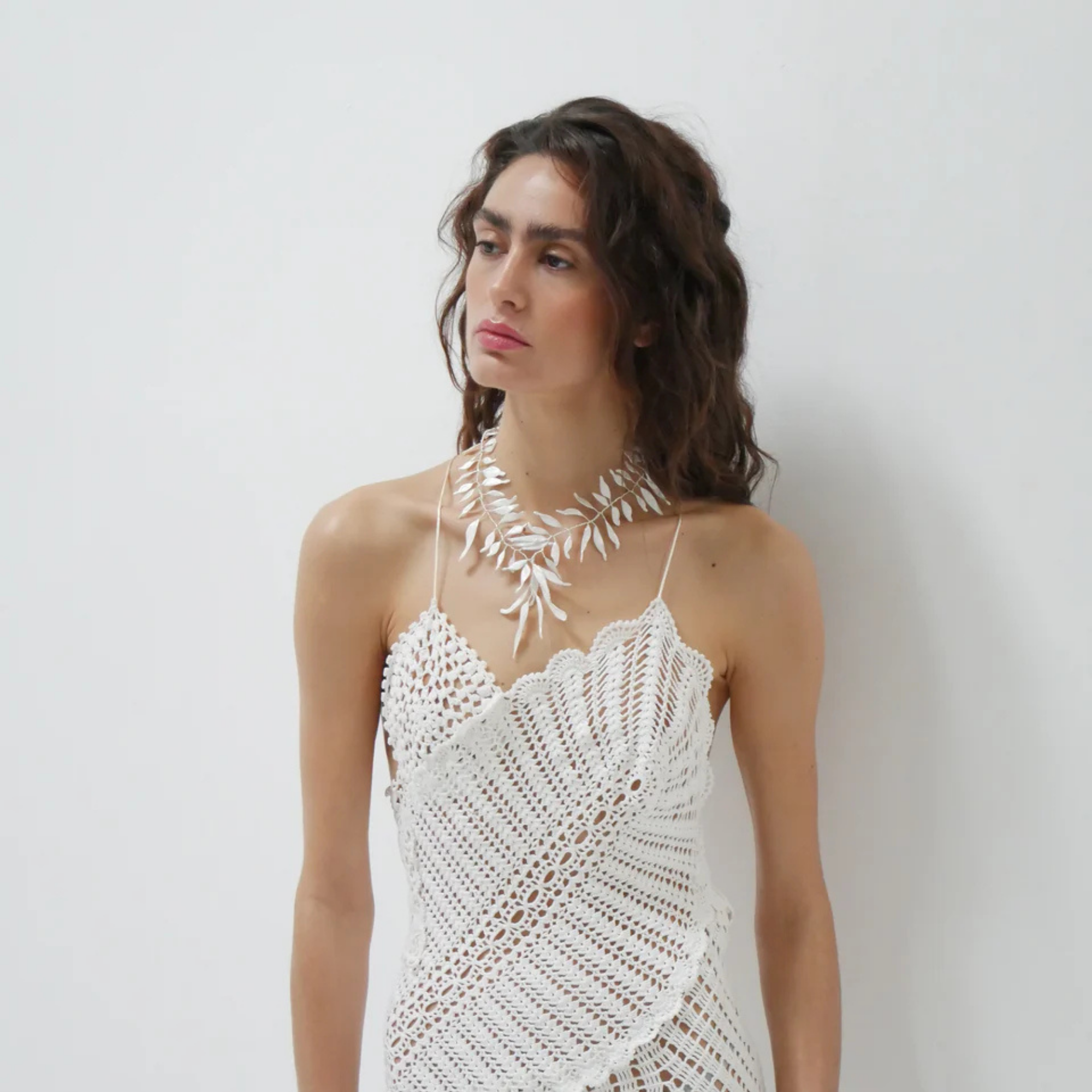 Materials: Alpaca thread in gold-plated brass and copper. Infinite layers created through a meticulous process of overlaying varnishes. Thread closure composed of 67% cotton and 33% rayon. Details with carefully selected Czech crystals, rhinestones, and beads.