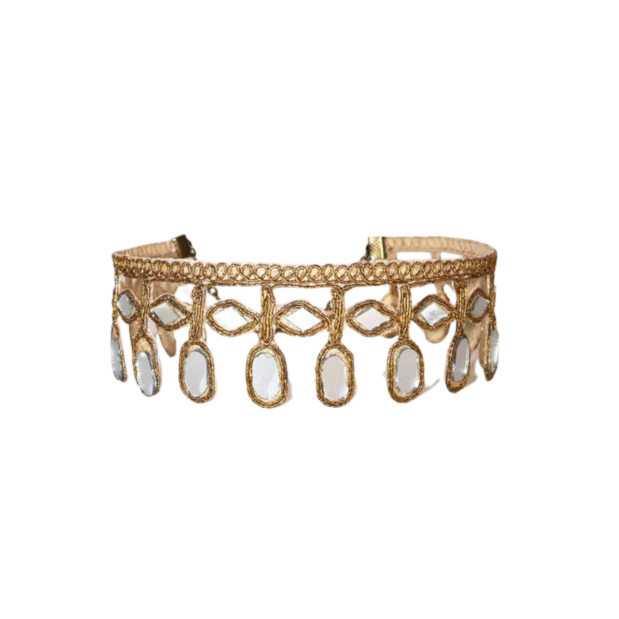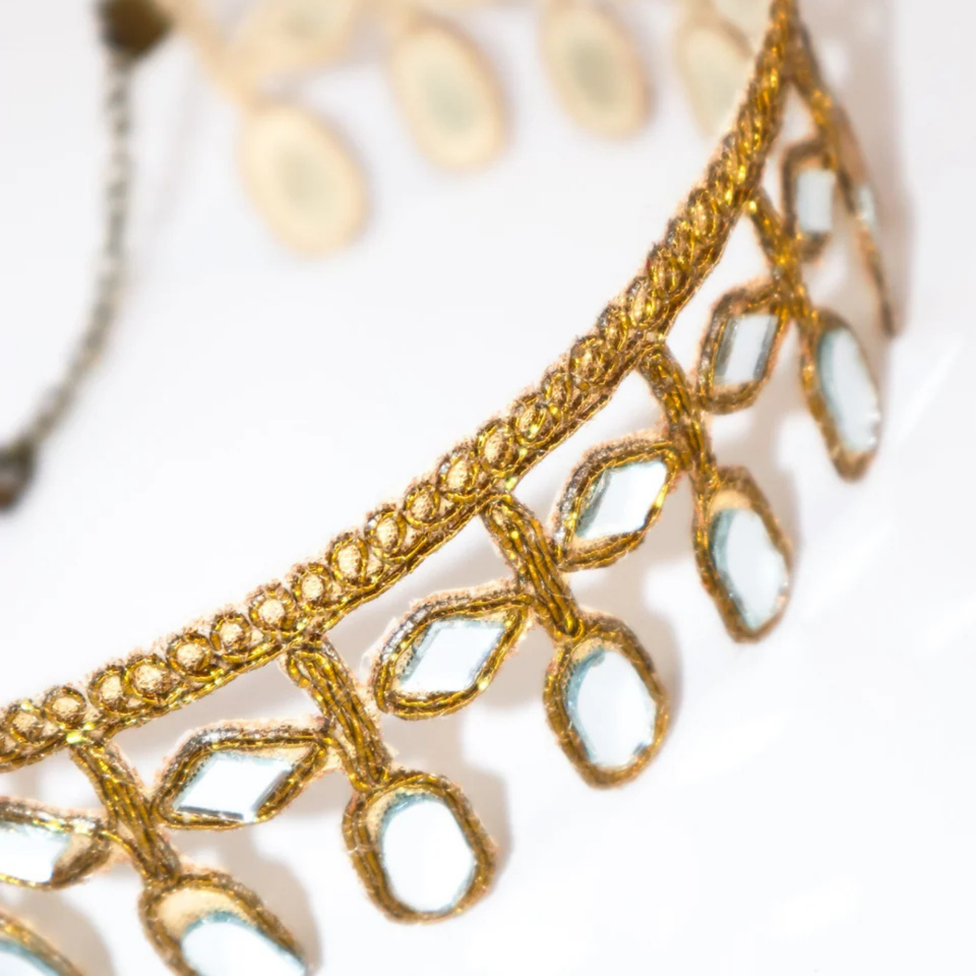 - Metallic thread and mirror stones sealed individually.