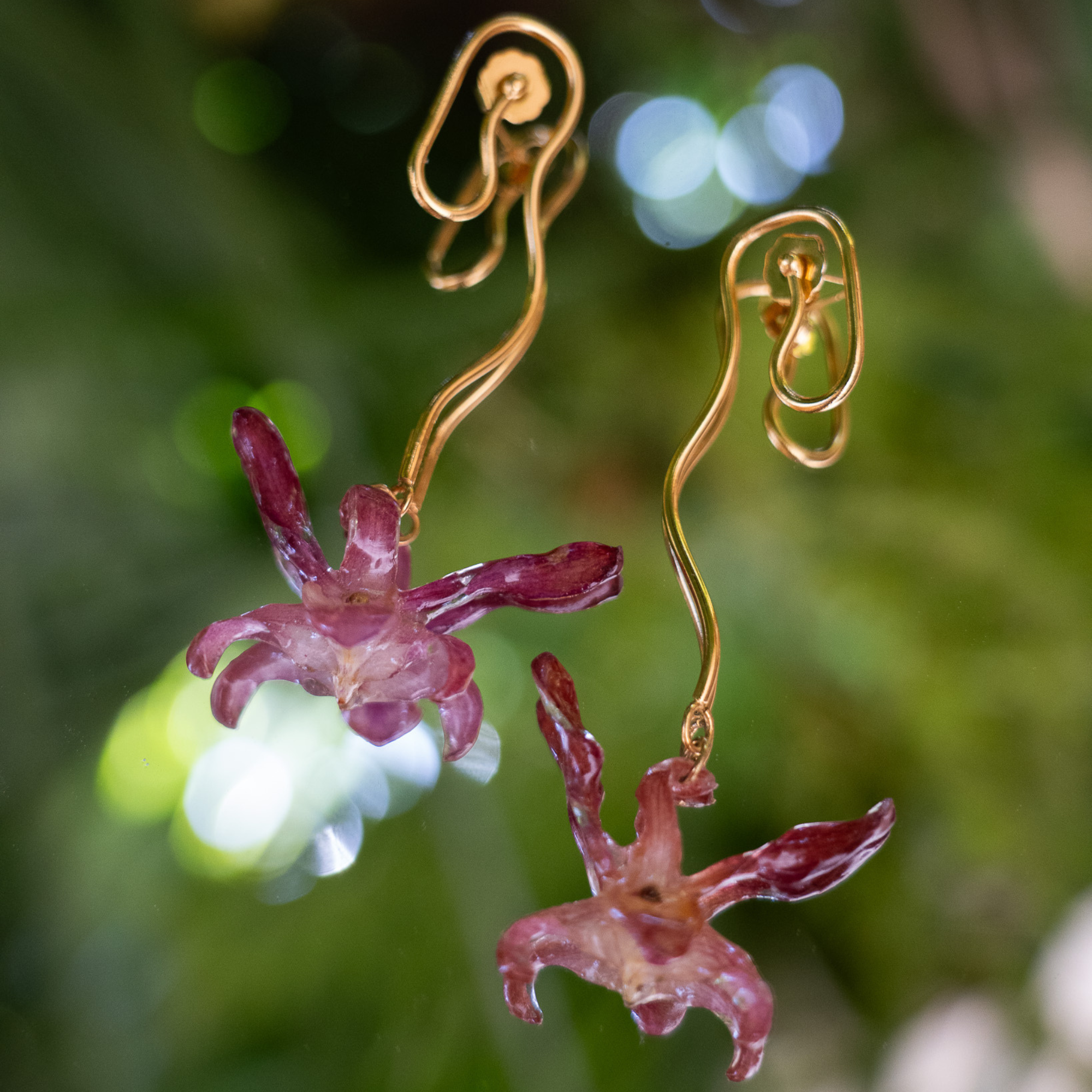 Brass dangle earrings with preserved orchids. Available in various colors and flower sizes.