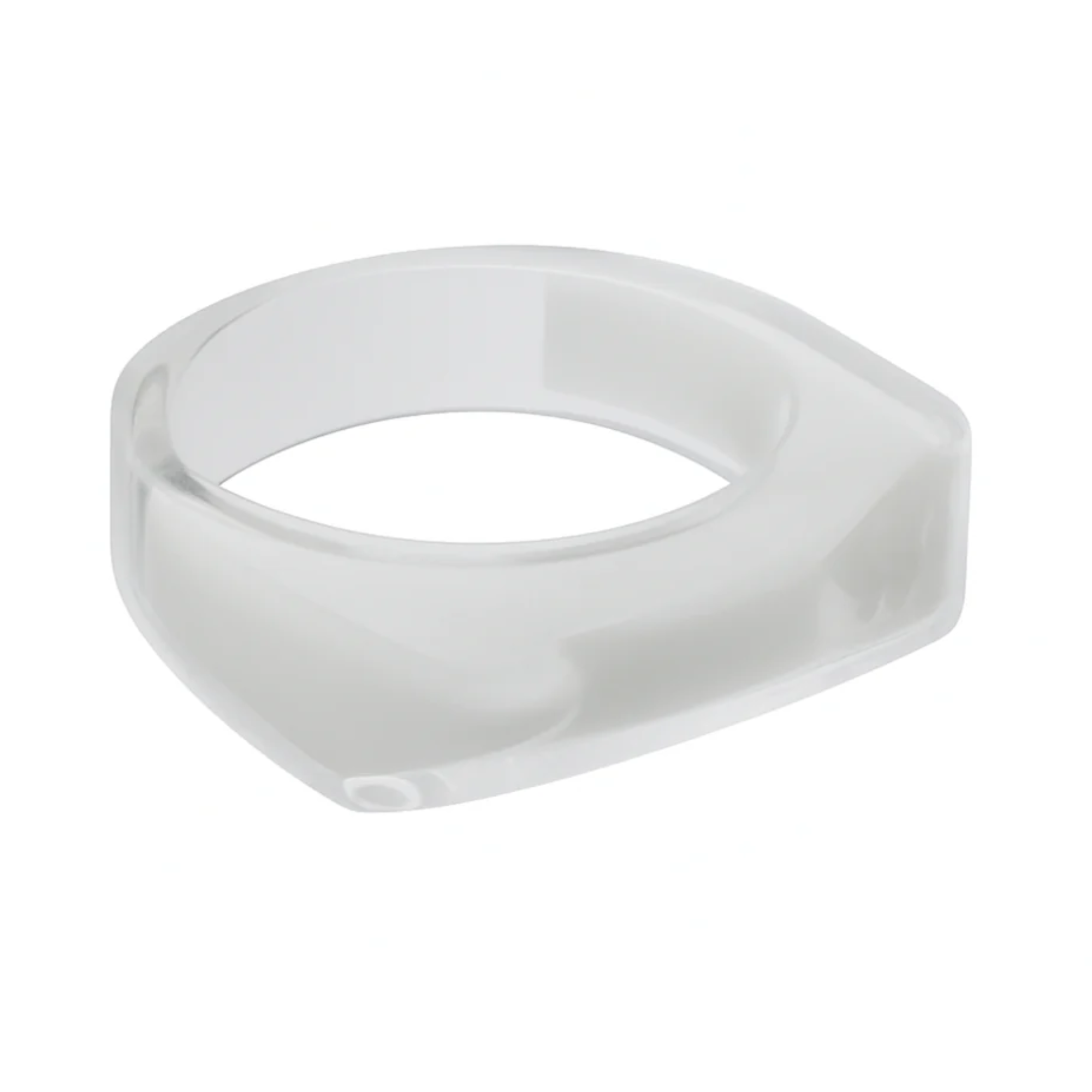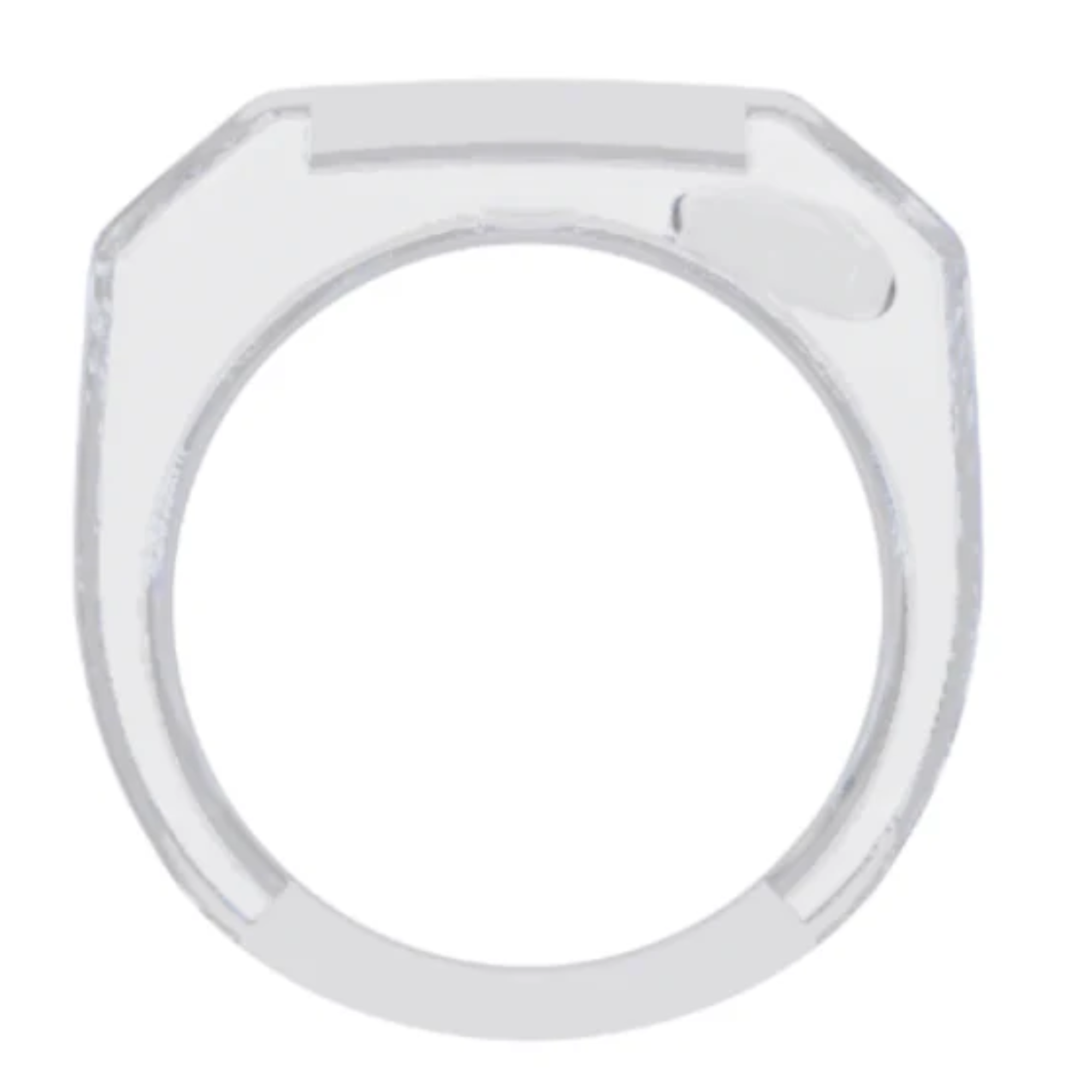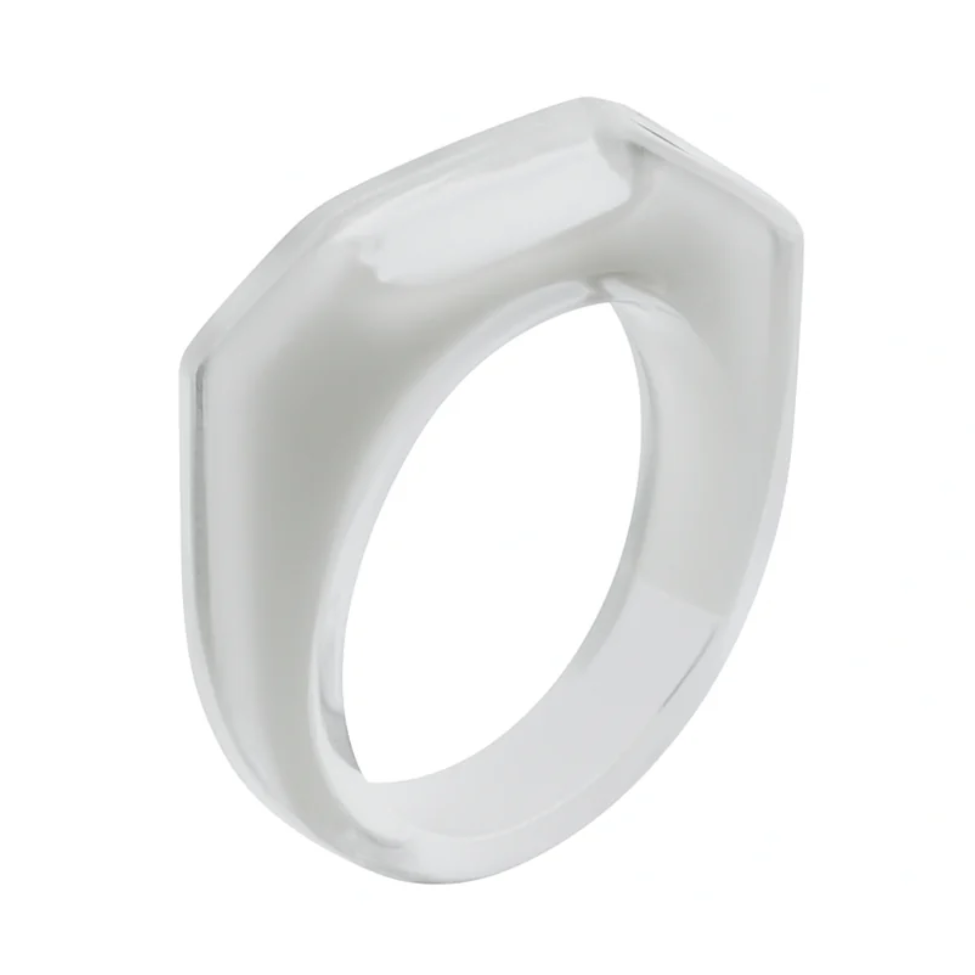 A WHITE LIQUID CORE SUSPENDED IN AN ANGULAR, PRECISION-PRINTED RESIN FORM. THE LIQUID MOVES WITH SLOW, CINEMATIC MOTION — A PALE, SHIFTING GLOW HELD BENEATH THE RING’S SIGNATURE HOLOGRAPHIC NOTCH. IT FLOWS LIKE THOUGHT, LIKE MEMORY, CATCHING AND REFRACTING LIGHT WITH EACH MOVEMENT OF THE HAND.CRAFTED USING ADVANCED 3D PRINTING AND SEALED BY HAND, THIS IS A NEW KIND OF OBJECT: A MEDITATIVE VESSEL, A WEARABLE ARCHIVE. DESIGNED TO HOLD LIFE IN MOTION.