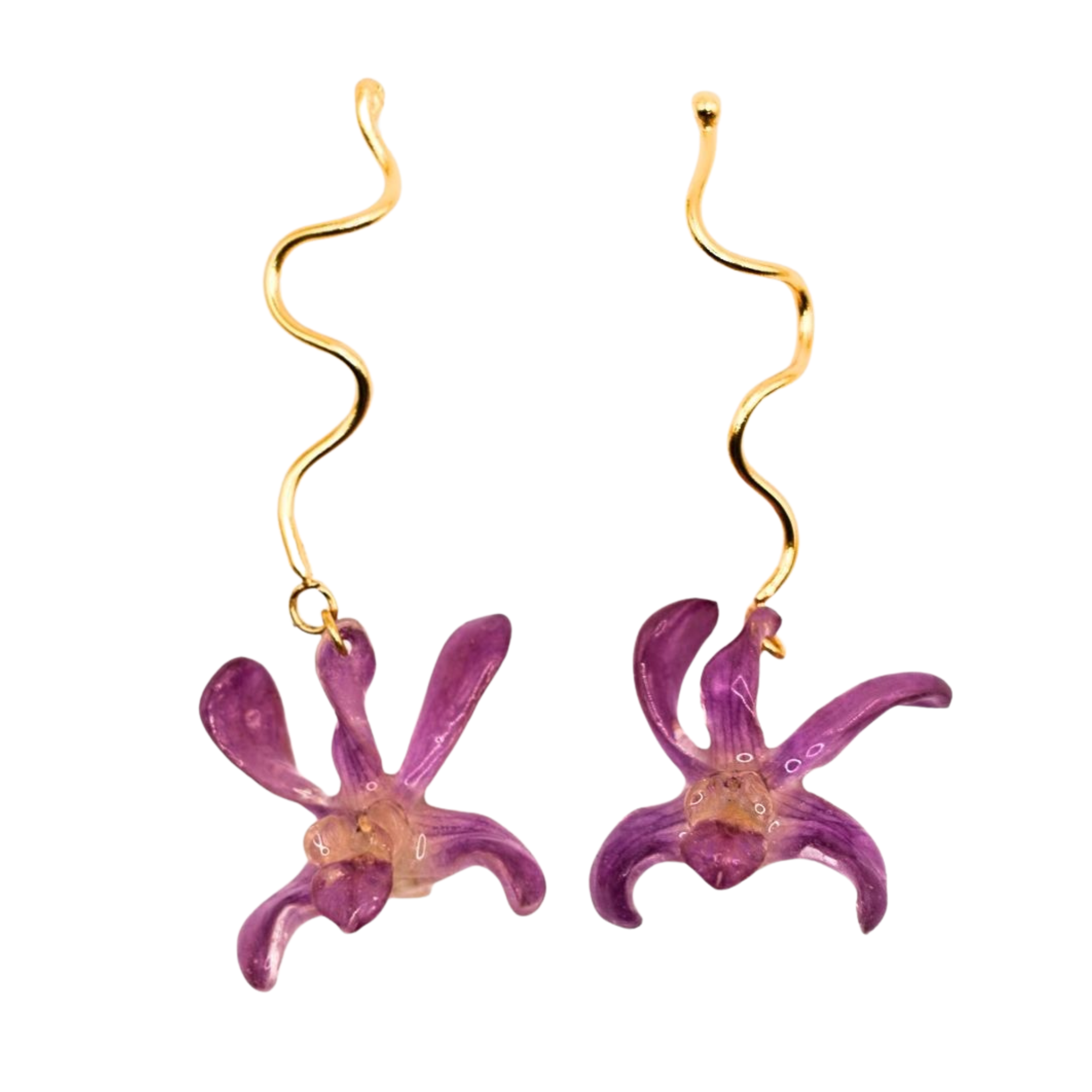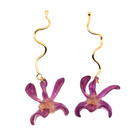 Brass Dangle wave earrings with preserved orchids. Available in various colors and flower sizes.