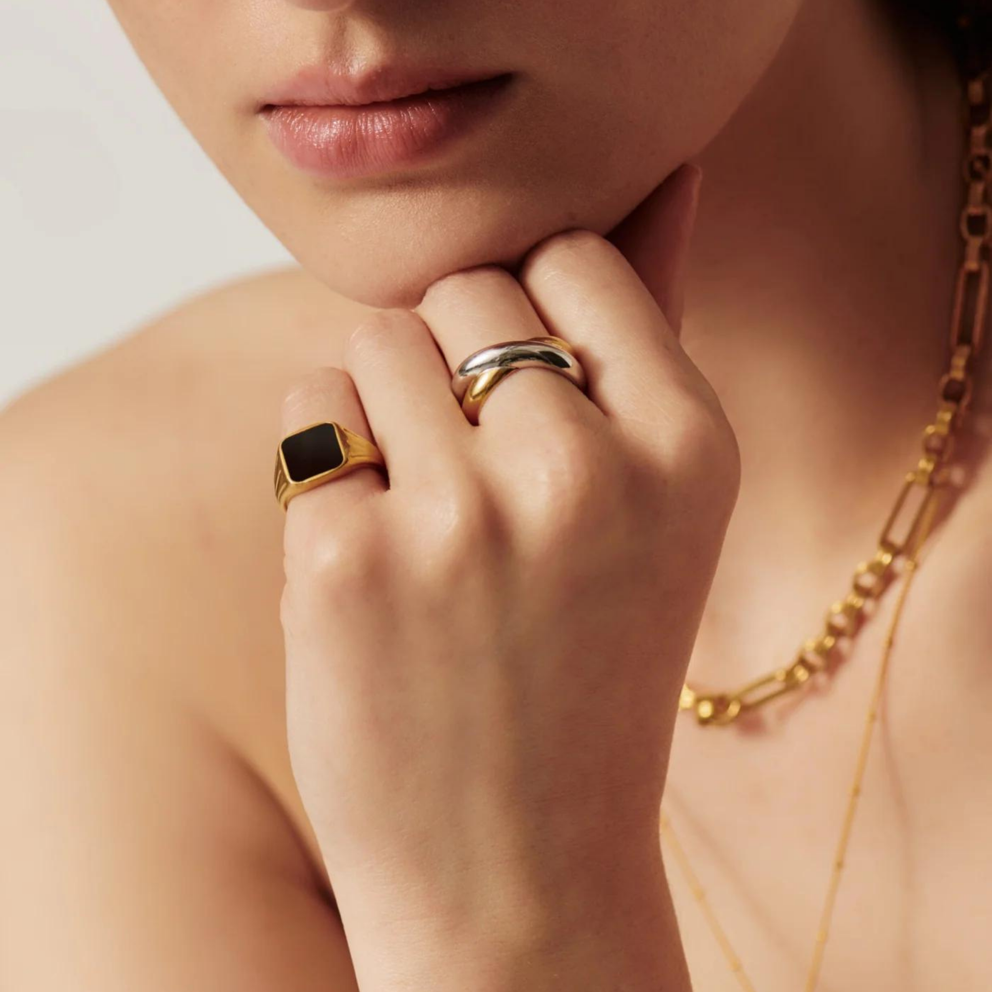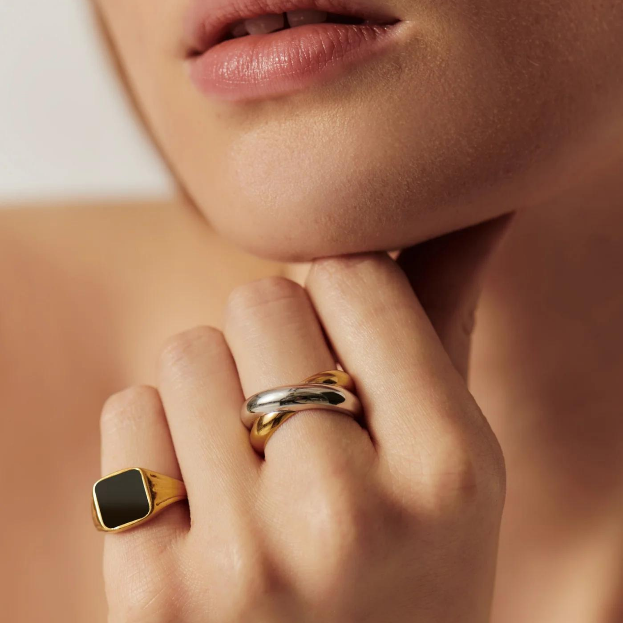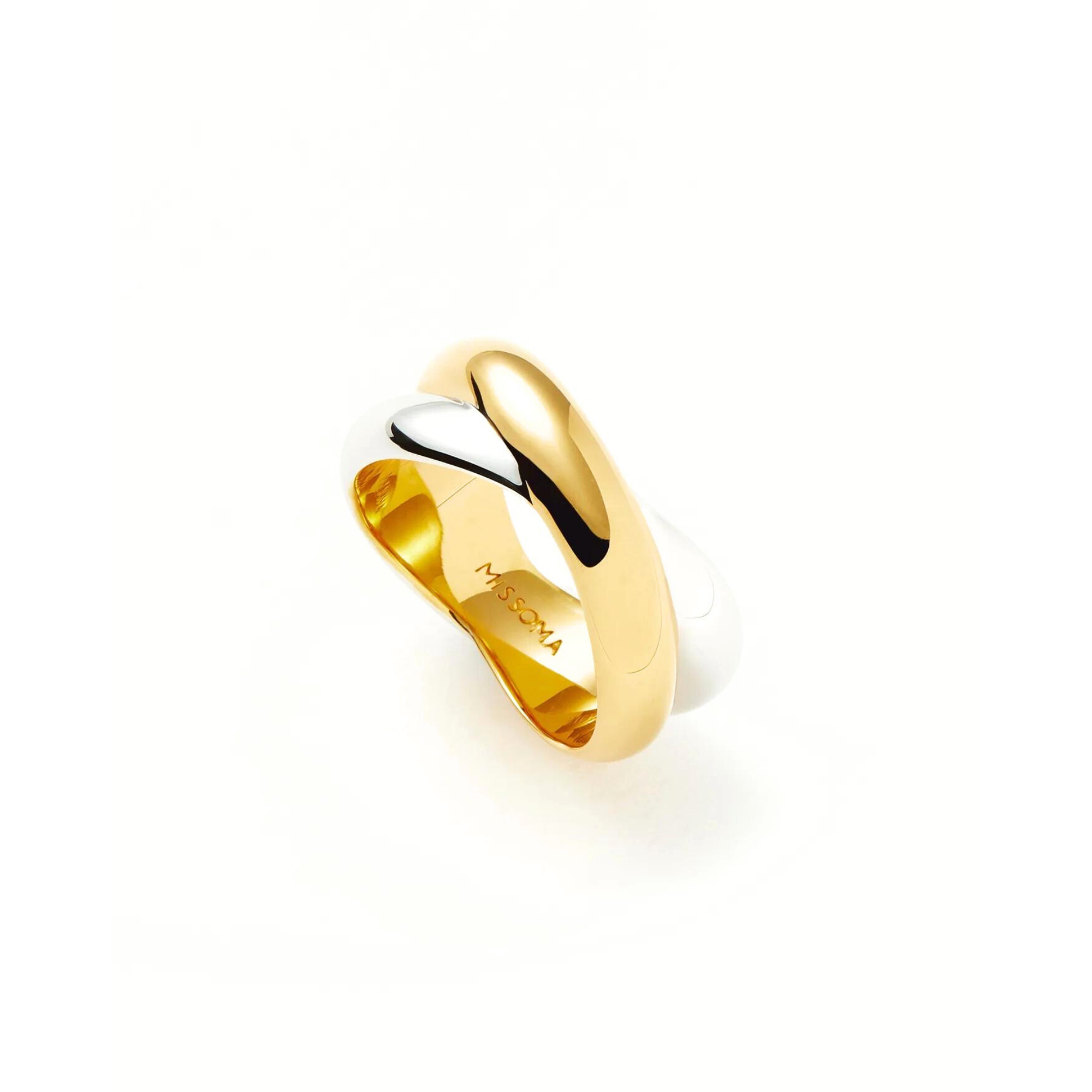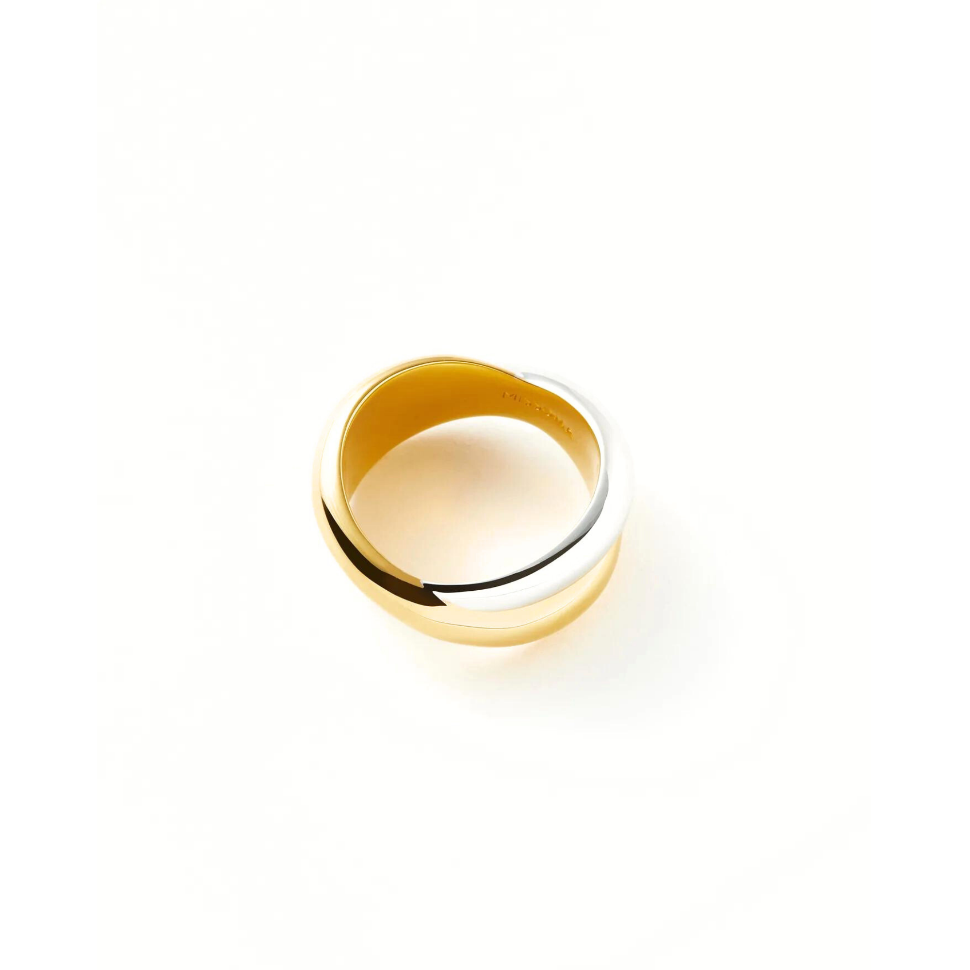 A classic, reimagined. This 80s maximalist statement ring features a unique crossover design with mixed metal gold and silver bands. Inspired by our best selling Lucy Williams Chunky Entwine Hoops. Just as standout on its own as it is as part of a ring stack.