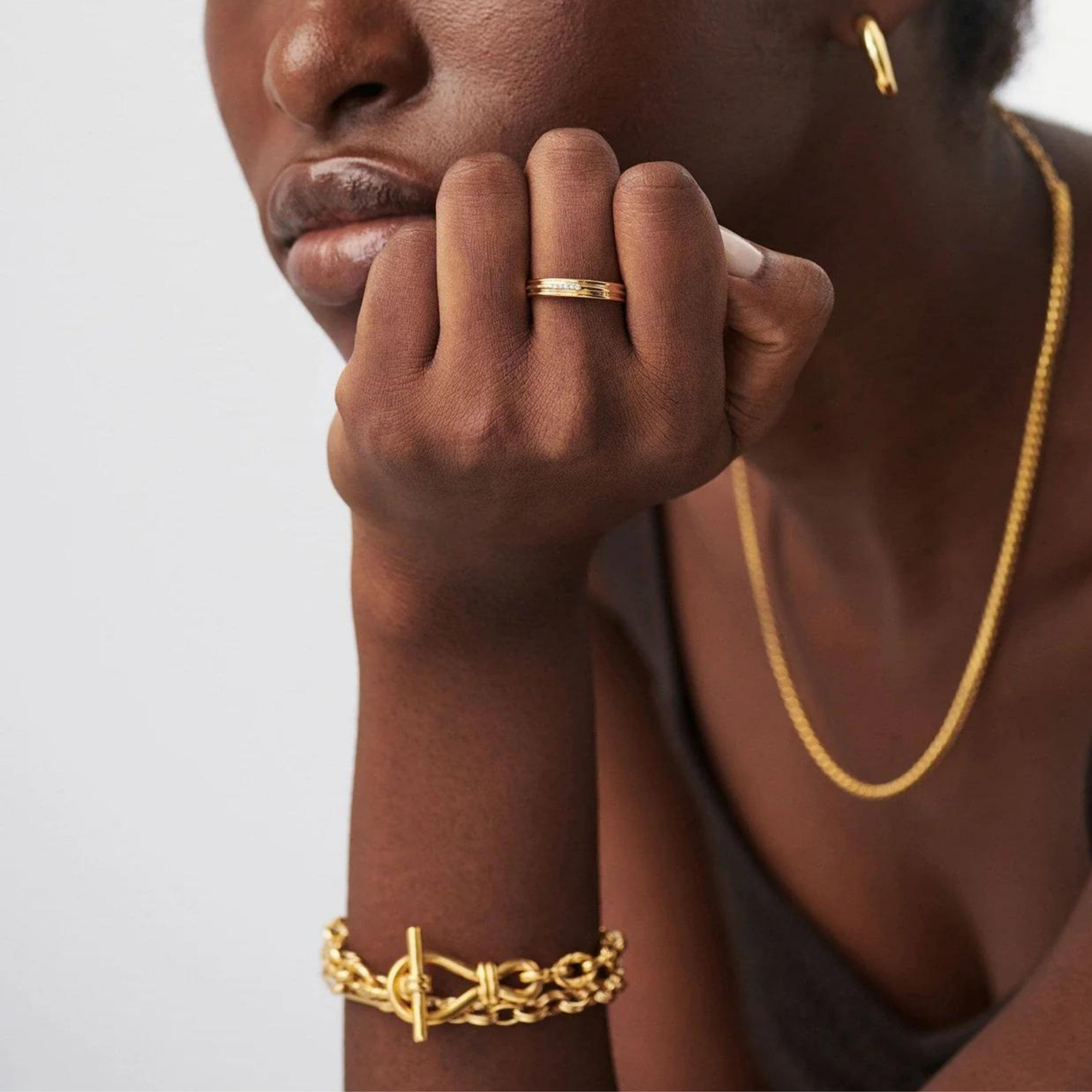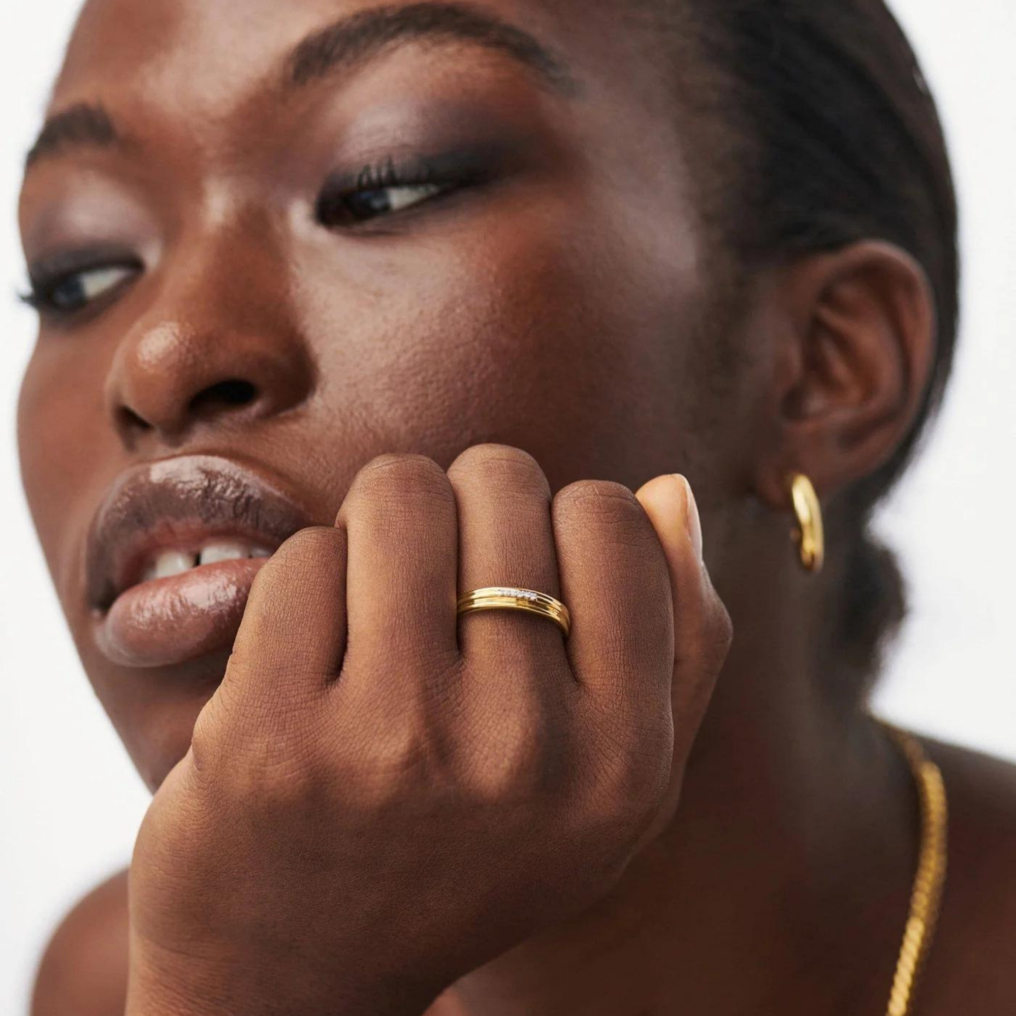 A nostalgic stacking ring. Inspired by Lucy's love of her mother's jewellery box, this distinctive design features cubic zirconia in the centre for a intricate pavé finish. Adding a textural element to your ring stack, shop a smaller size to wear as a pinky ring.