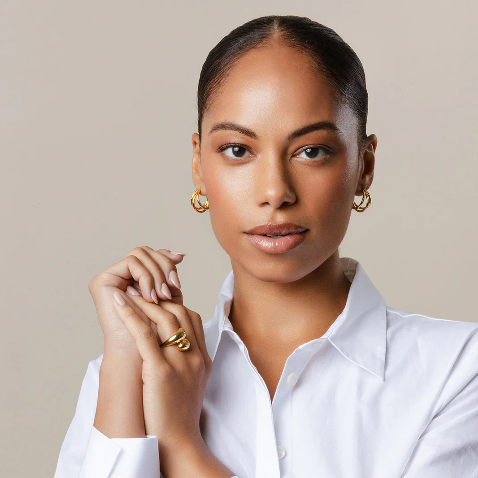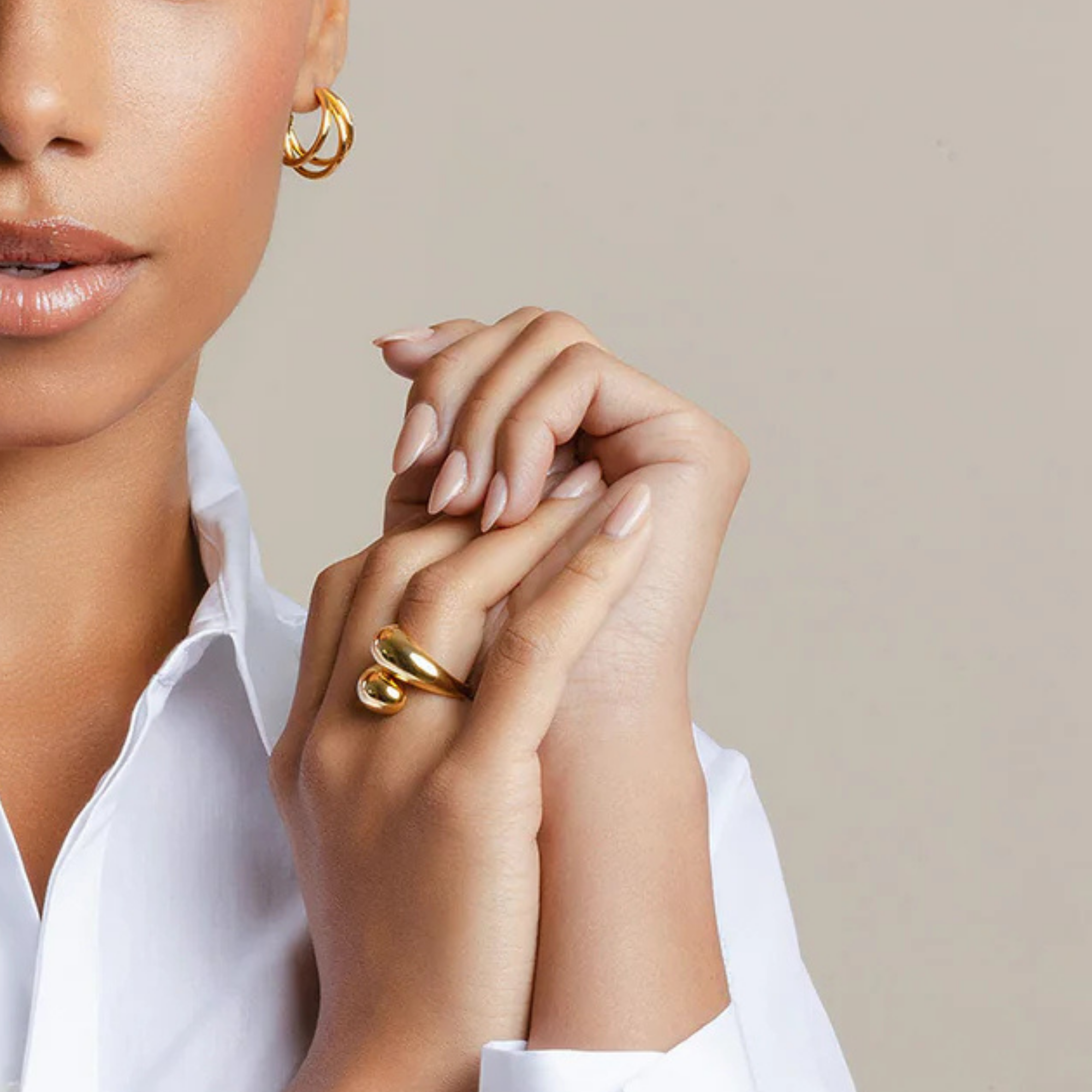 Imagine droplets of precious metal, captured at the peak of their fluid motion, forming a ring that gracefully embraces your finger. This organic design, available in both radiant gold and sleek silver, offers a minimalist yet impactful statement. It's a piece that speaks to the beauty of natural forms and the elegance of simplicity.