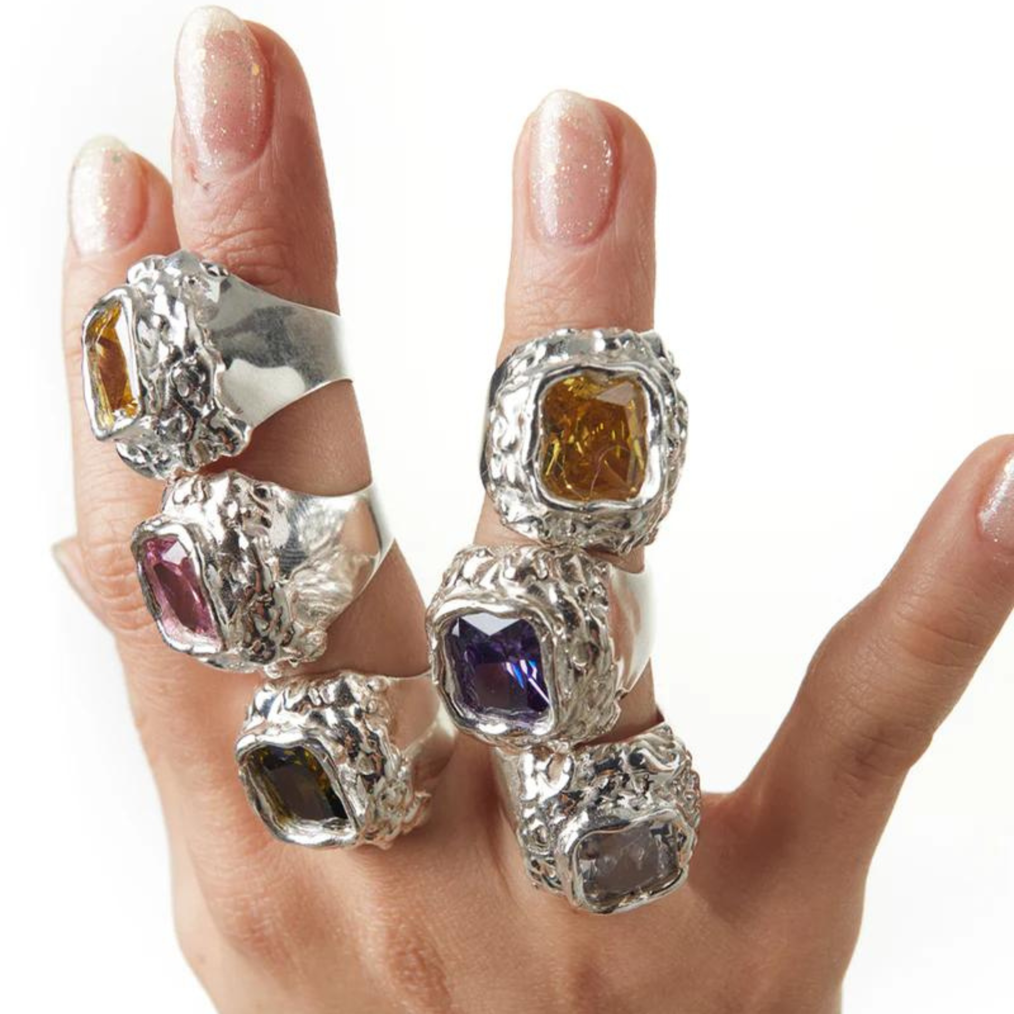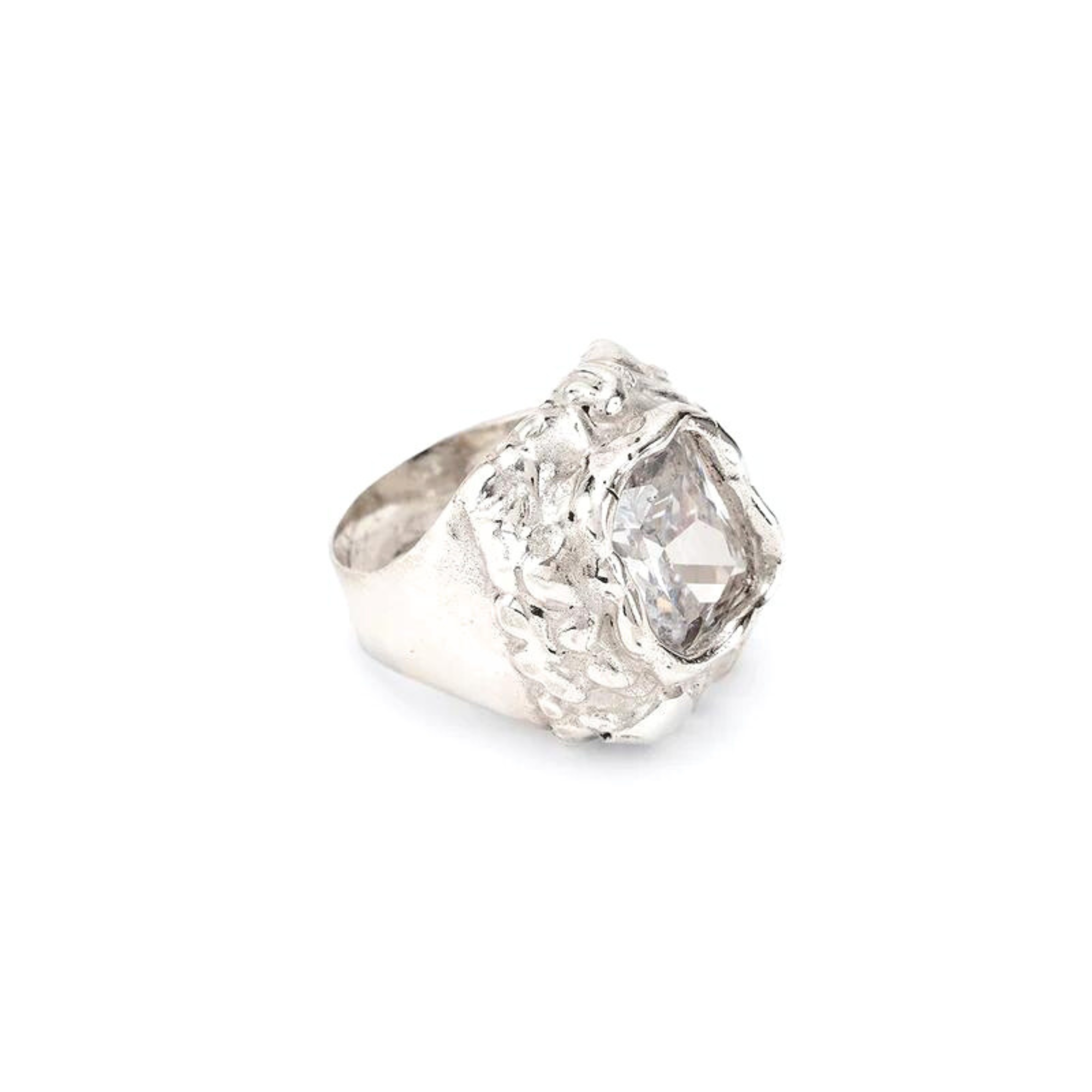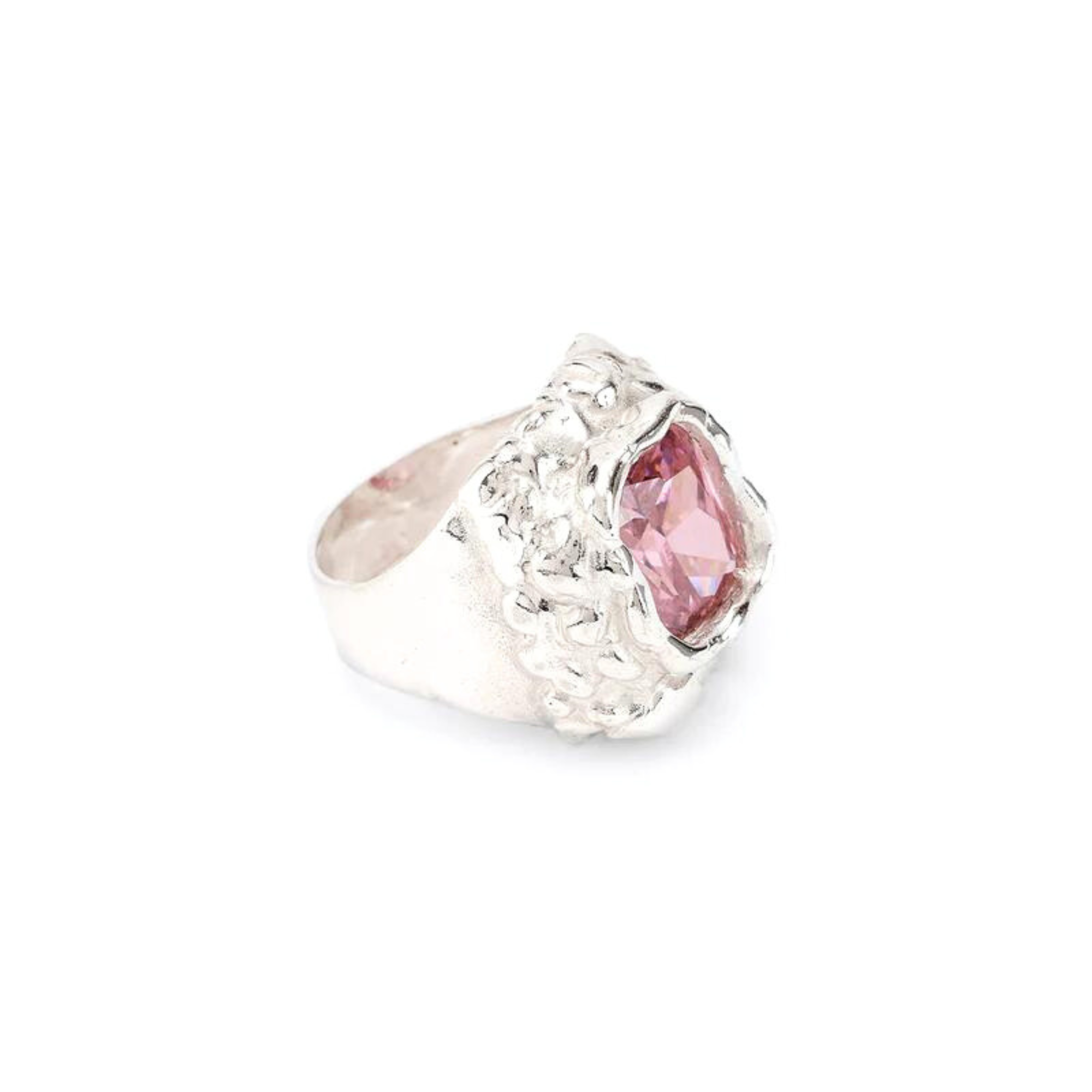 Silver Signet ring with color zircon, organic shape with voluminous spots around the zircon.